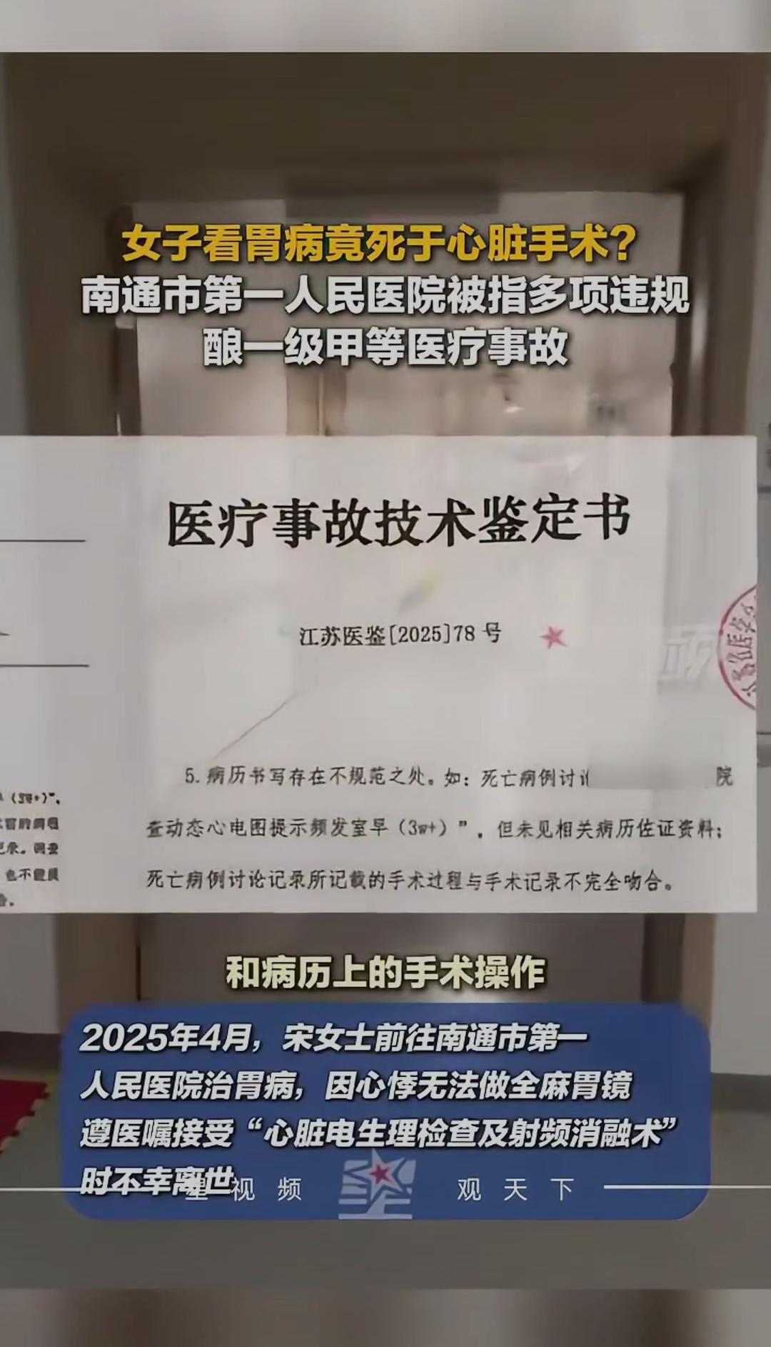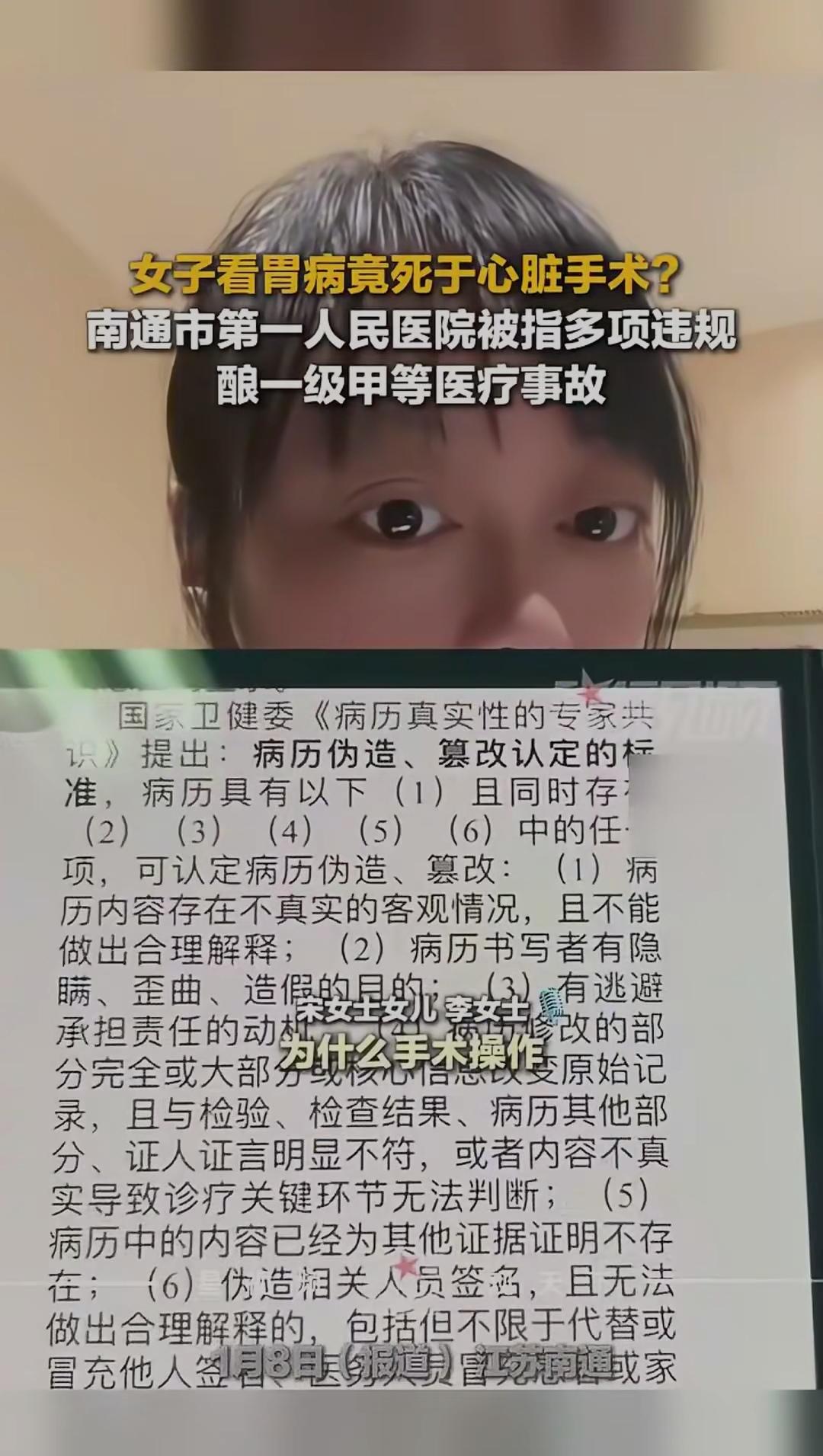 女子看胃病竟死于心脏手术?南通一院多项违规酿惨剧,一级甲等医疗事故警醒所有人!医院重大事故 “只是想治个胃病,怎么就再也回不来了?” 江苏南通这场医疗悲剧,让无数人脊背发凉。60岁的宋女士因上腹痛就诊南通市第一人民医院,本计划做胃镜检查,却被医生告知“心悸不能全麻”,必须先做心脏射频消融术,否则后续治疗无法进行。尽管家人劝阻,且北京权威专家评估后认为“药物可控制,无需手术”,但宋女士终究拗不过医嘱,踏上了不归路。 2025年4月29日,这场被描述为“微创低风险”的手术中,宋女士突发呼吸心跳骤停,经两小时抢救无效离世。尸检报告揭开残酷真相:致死原因为术中急性左冠状动脉损伤,而这一切本可避免。省、市两级医疗事故鉴定明确指出,这是一起一级甲等医疗事故,医方承担主要责任——手术前未做关键的冠状动脉造影排查风险,高风险操作前未充分告知家属,术中也未尽到谨慎注意义务。 更让家属崩溃的是,医院仅做简单心电图就安排手术,全程未如实披露左冠窦区域消融的高风险。而事故发生后,双方协商赔偿时,医院却以“家属索赔超出法定标准”为由迟迟未达成一致。 消息传开,网友愤怒刷屏:“治病不是流水线!医生的草率,就是拿患者生命赌运气!”“知情权被无视,谨慎义务成空话,这样的医疗失误太致命!” 其实这场悲剧的核心,早已超越单一事故本身——当医者的责任心让位于流程化操作,当患者的信任被专业优势裹挟,医疗安全的底线便岌岌可危。 《民法典》明确规定,医务人员必须向患者如实说明医疗风险和替代方案,这不仅是法律要求,更是医者仁心的底线。南通一院的道歉和整改承诺,终究换不回逝去的生命。这起事故给所有医疗机构敲响警钟:医疗的本质是守护生命,而非冰冷的流程;每一次决策都该如履薄冰,每一句告知都该坦诚相待。 你在就医时遇到过类似的“强制推荐治疗”吗?