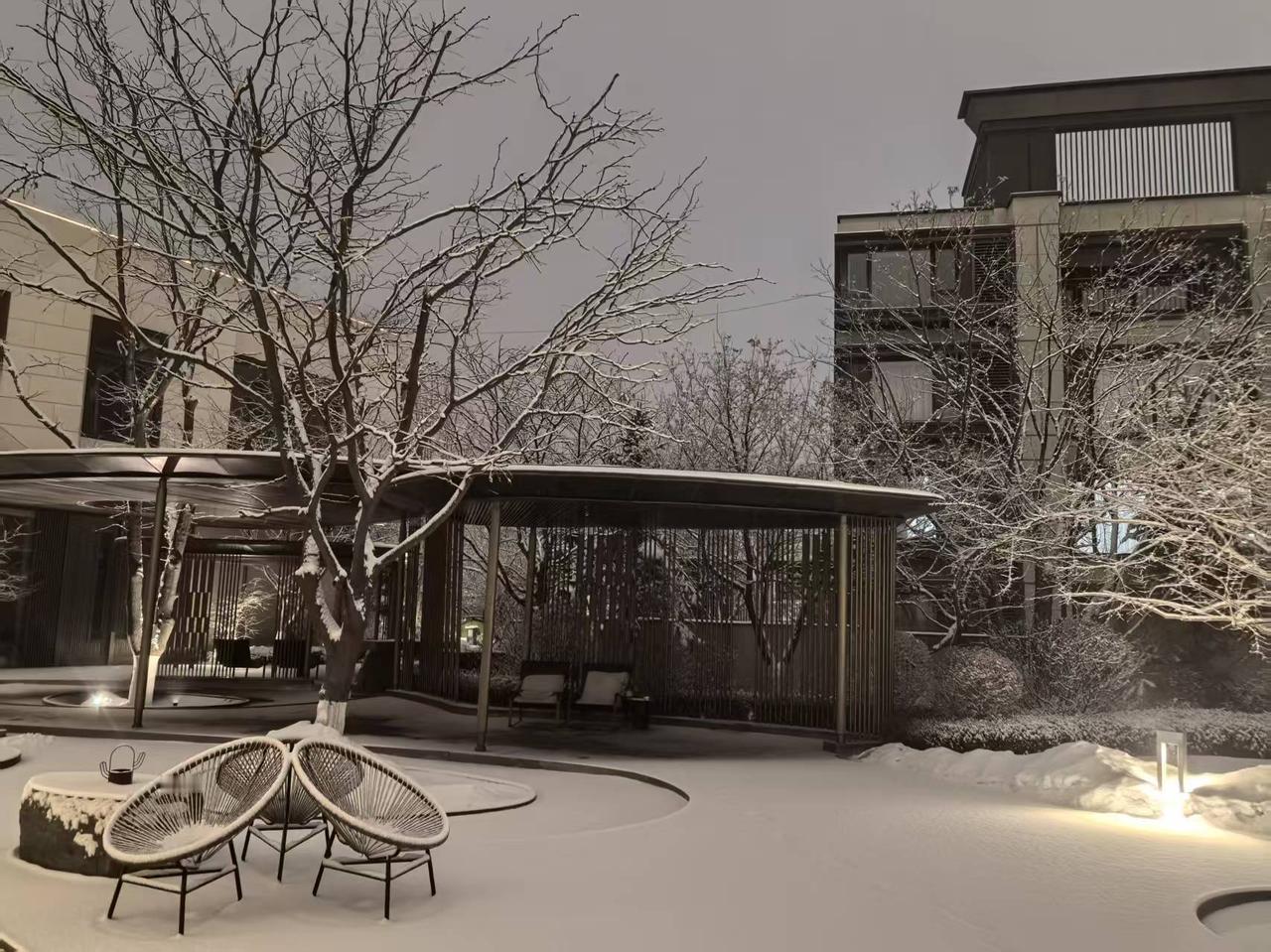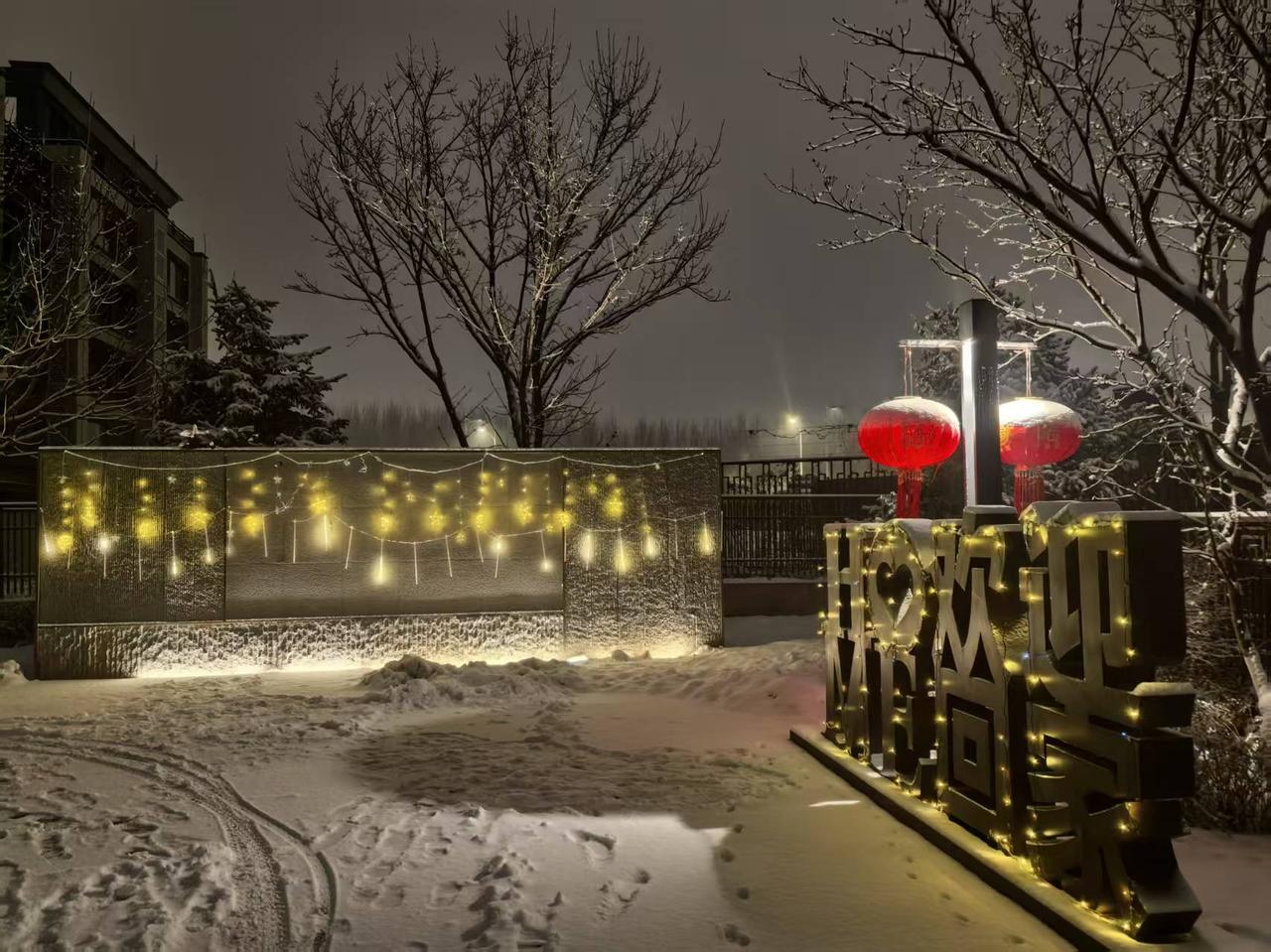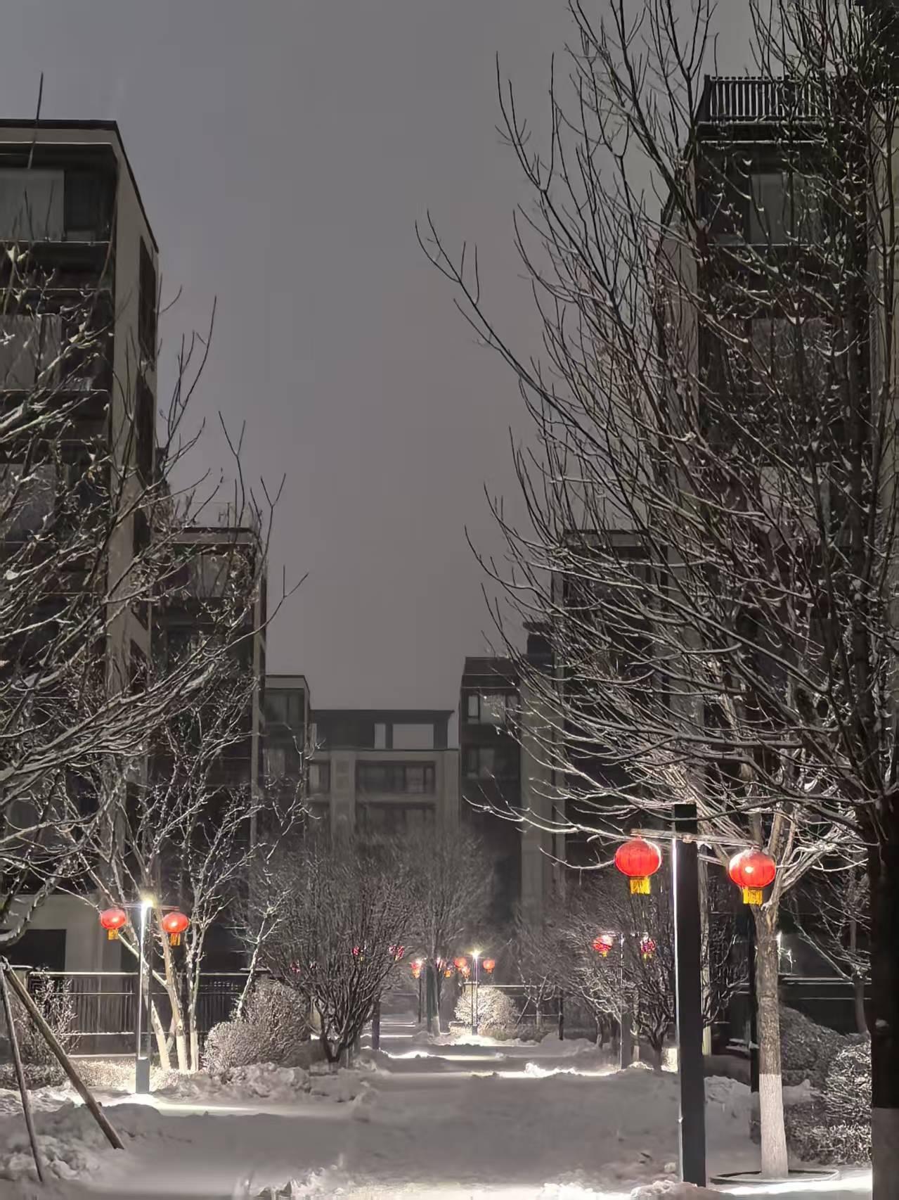 冬日雪景中的暖意,红灯笼点缀的宁静夜晚。