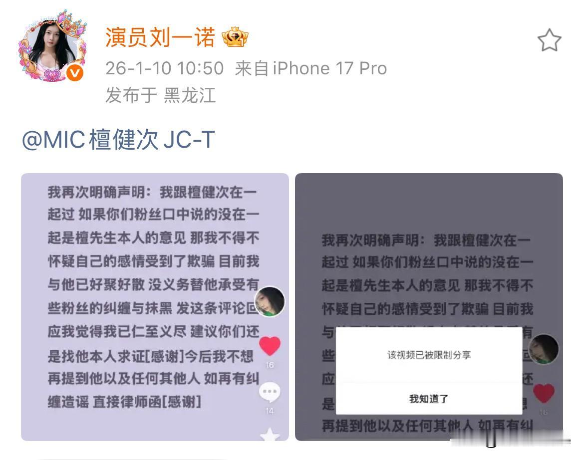 1月10日,刘一诺再次声明,“在一起过,目前已好聚好散,没义务替他承受抹黑” 刘一诺公开的两个目的,一个是给自己一个名分,另外一个就是为了热度跟流量 她两个目的都达到了,收手了,虽然做的有点不地道,但也没啥大问题,大哥也没有否认她的身份,就相当于默认了她的行为 建议粉丝停手,内娱嫂子没一个是好惹的! 不要到时候嫂子没撕掉,把大哥给撕掉了……