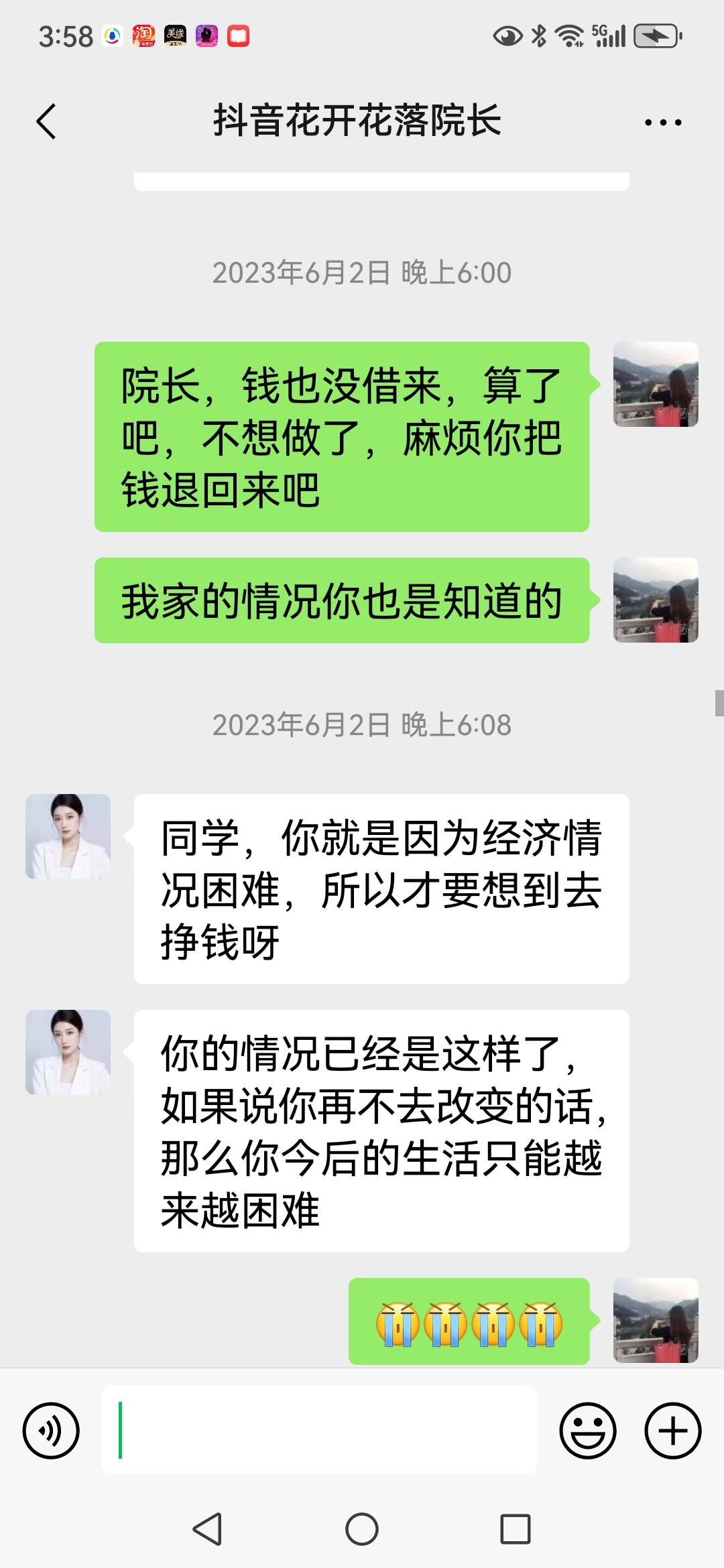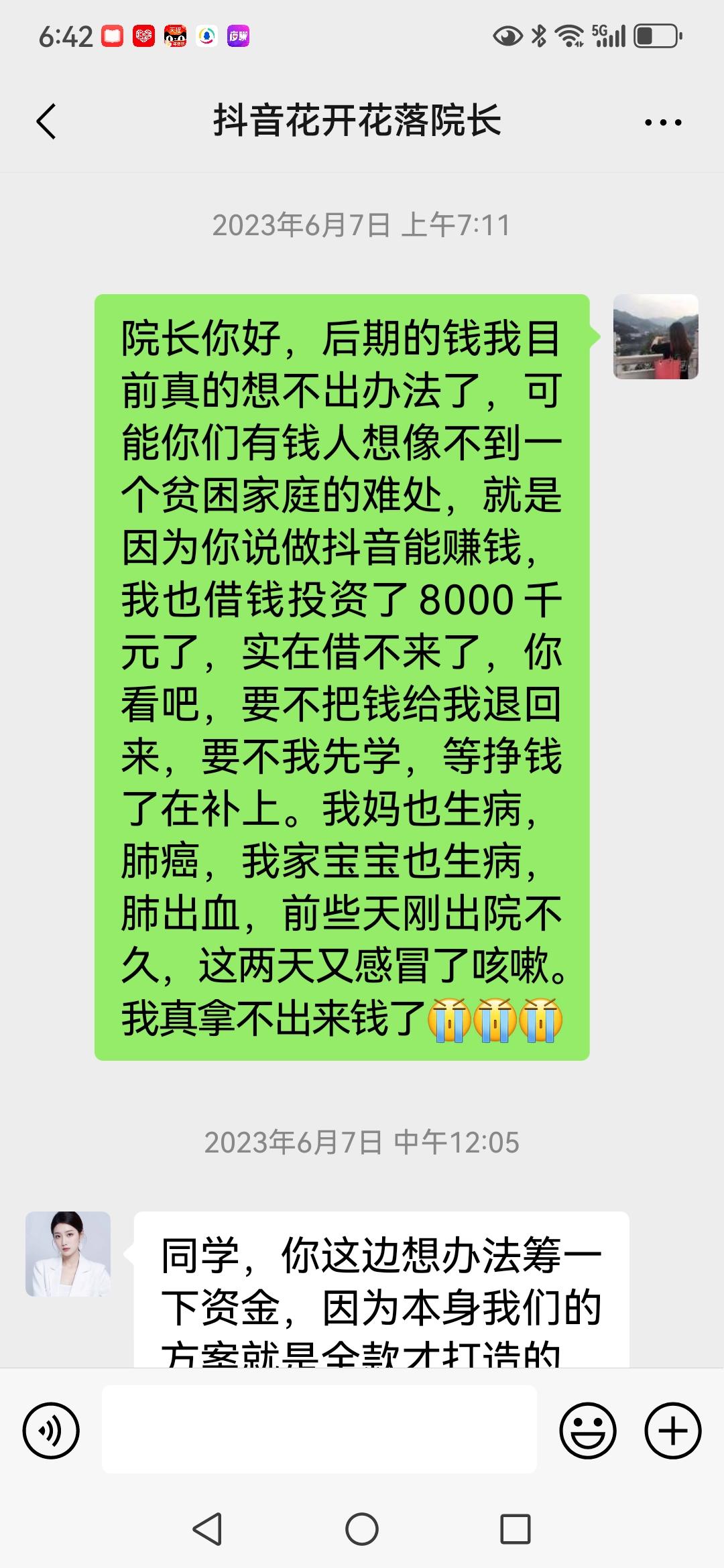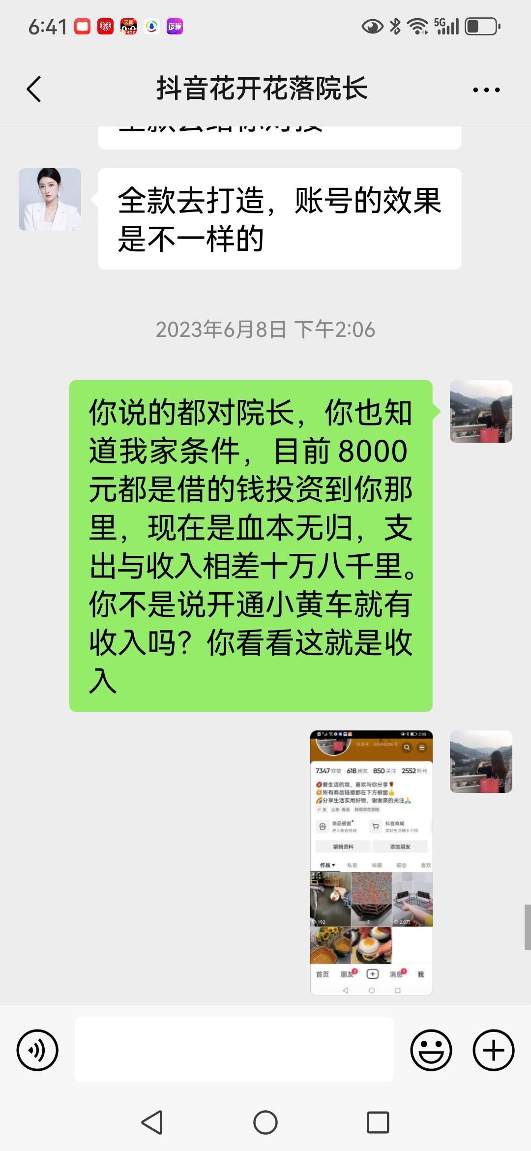 【骗子无处不在,是我脑子进水了,还是骗子太高明】 偶尔刷抖音时被一女的以讲课为由,引流加入微信,然后用各种骗术让我买她的课程,并承诺学会后一天能赚多少多少钱!我可能是被洗脑了吧,前后分三次给她转账共8000千元,当我意识到可能是骗局时,让她退款,那简直是比登天还难,钱虽然不多,但对我一个老百姓来说,8000元足够我两年的生活费了,心疼呀😔 在下请问你们,像我这种情况,钱还能要回来吗?