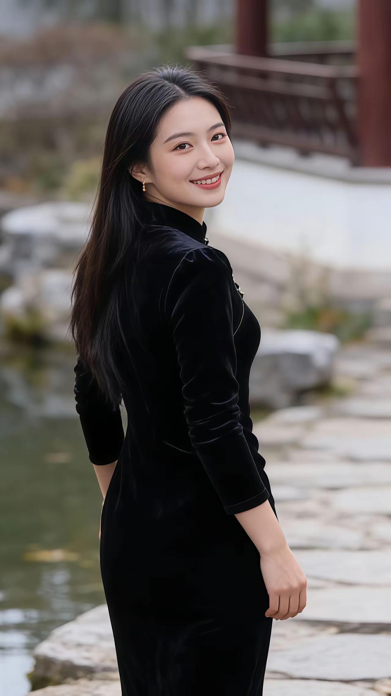 优雅黑裙,微笑如花,古风庭院,美不胜收。