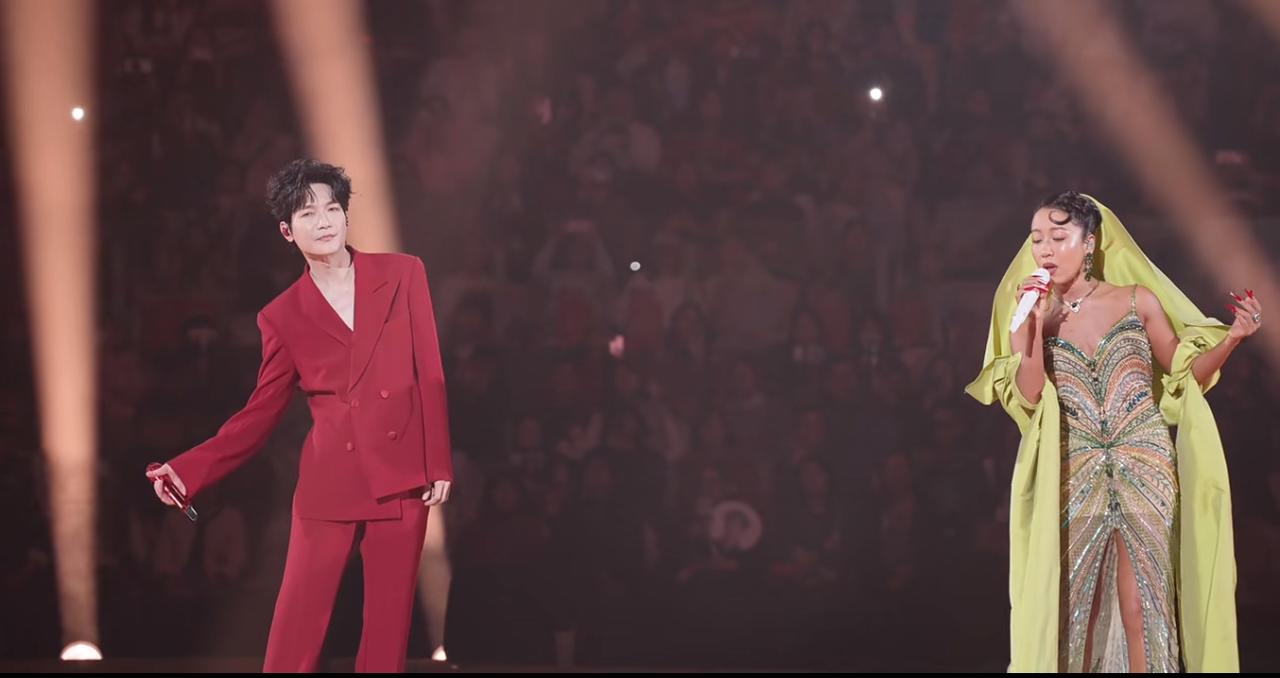 陈楚生与吉克隽逸的《青春的颜色》上桌啦! 太好听了,这现场与综艺节目上一样一样的。 果然还是有实力的两位歌手。 很空灵、很美妙。 最有意思的他俩的妆造,楚生一身红装,吉克隽逸是黄色为主的裙装,网友调侃他俩站在一起就是一道经典的“西红柿炒鸡蛋”,还点缀了一些葱花。 有点意思。