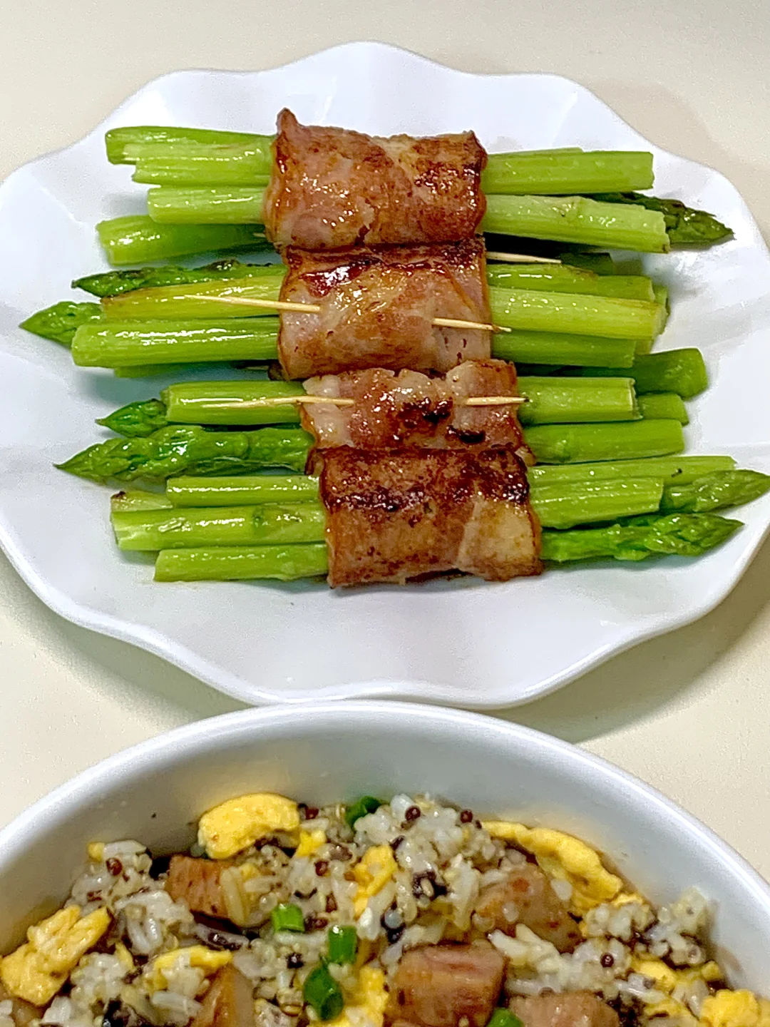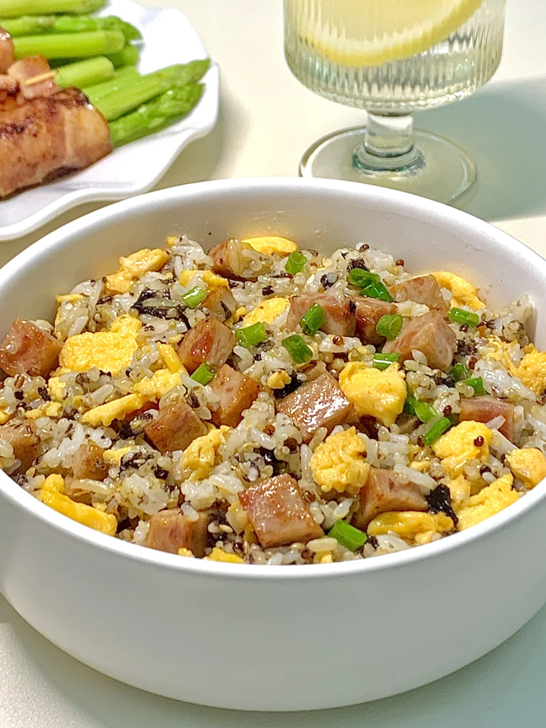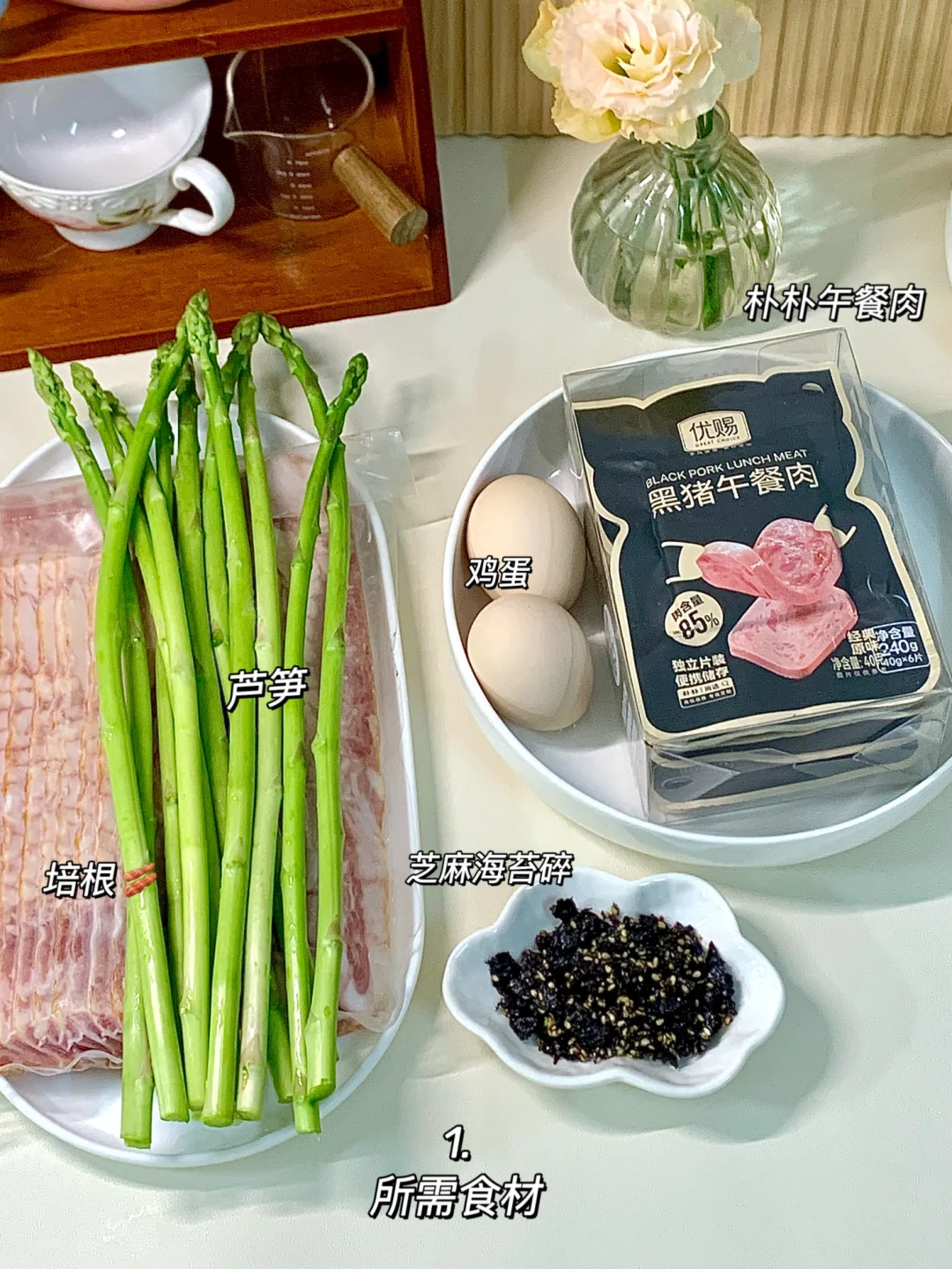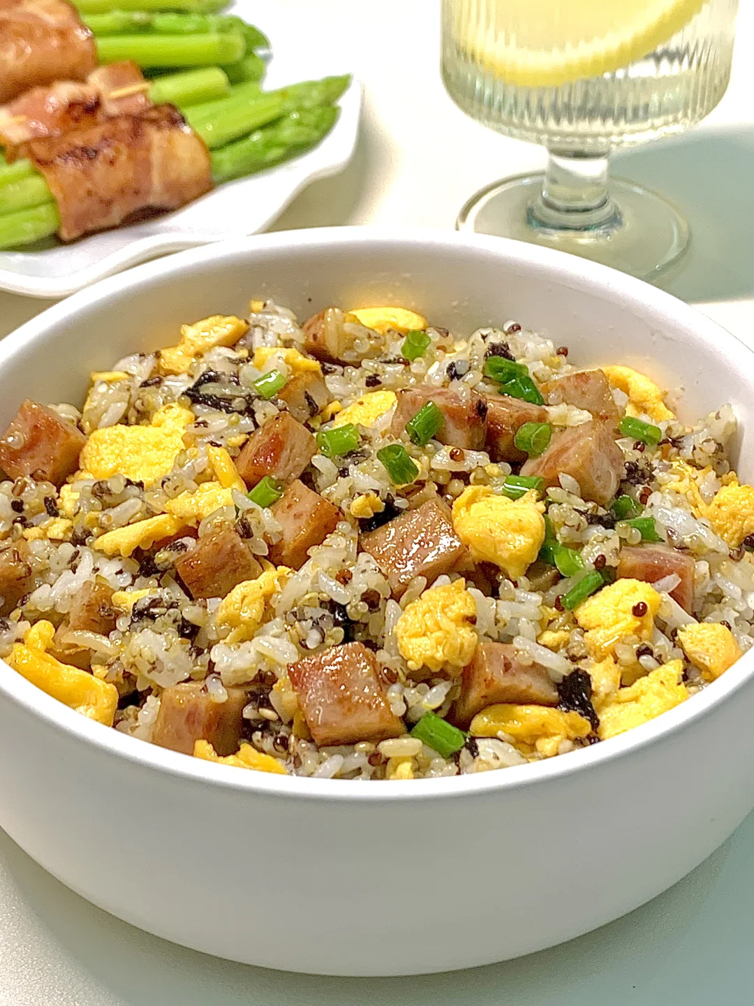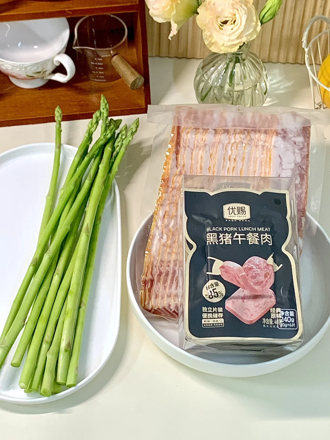 晚餐:午餐肉海苔拌饭+芦笋培根卷 🍘午餐肉海苔拌饭 饭张力拉满的香香拌饭 午餐肉煎得焦焦的,拌着脆脆的海苔碎 简单又快手,懒人的梦中情饭呐 都是可以家中常备食材 特别是优赐的黑猪午餐肉 独立小包装,≥85%的黑猪肉 又香又紧实,性价比高高的 每次逛朴朴我都会囤上一些 🥓芦笋培根肉 又吃芦笋培根卷了 不用放油放调料不用看火候 卷好煎到焦黄就行了 焦脆咸香又鲜嫩,拉满幸福感