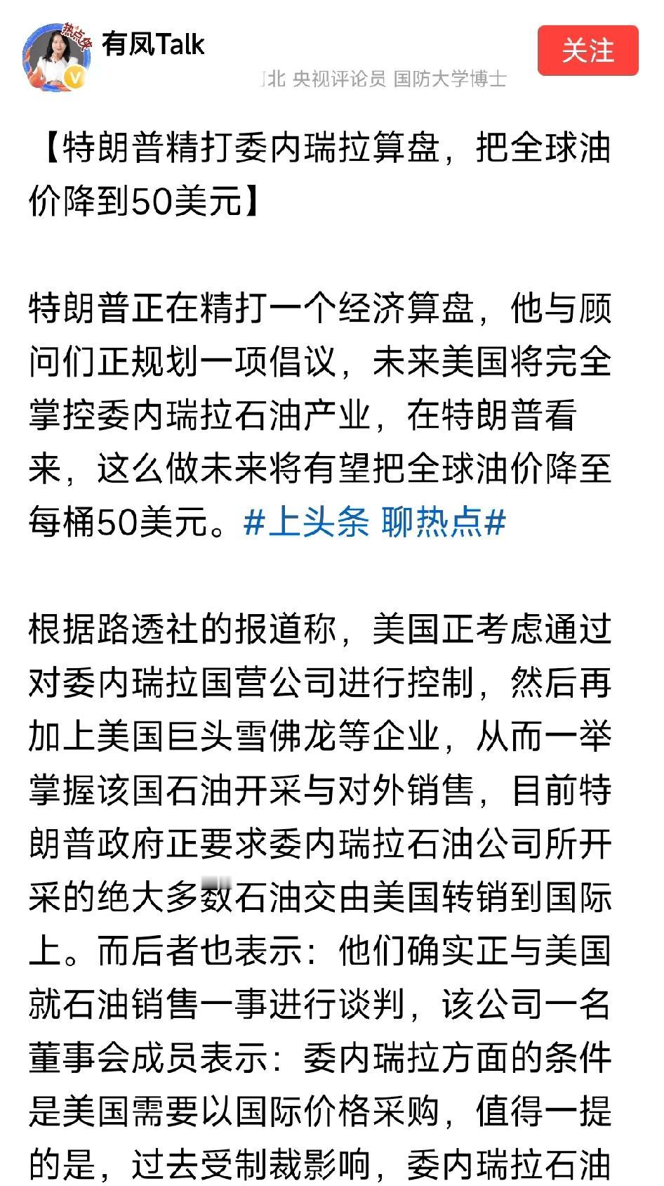 特朗普精打委内瑞拉算盘,想把全球油价降到50美元,用意何在。特朗普觊觎委内瑞拉石油产业,试图将全球油价压至50美元,背后是复杂的地缘政治与经济博弈。此举既想巩固美国能源霸权、收割经济利益,又意在政治操弄,打压对手、讨好选民。但这种强权逻辑忽视他国主权,破坏市场规则,必将引发反弹。国际能源格局多元复杂,单边霸凌难奏效,最终只会自食恶果。石油降到50美元,将打击中国新能源汽车,特朗普算盘打的贼精! 降到50美元,成品油价减不了多少,一旦恢复原价,成品油价可比现在高多了!支持全球石油降低到50美元,可以促使各种物价降低,成本降低。包括汽油,航空燃油,塑料,纤维,沥青等全部降价。委内瑞拉战局 委内瑞拉的困境 南美委内瑞拉 委内瑞拉石油战 特朗普经济困局 特朗普征加关税 特朗普经济霸权