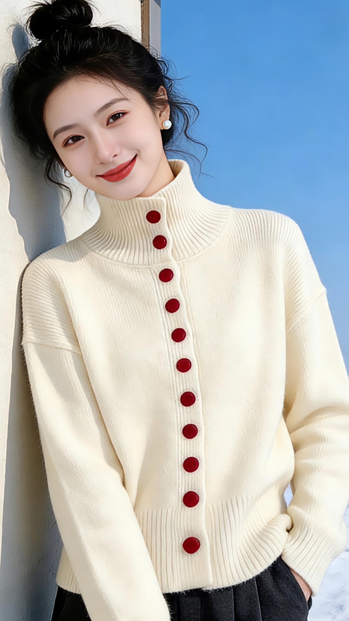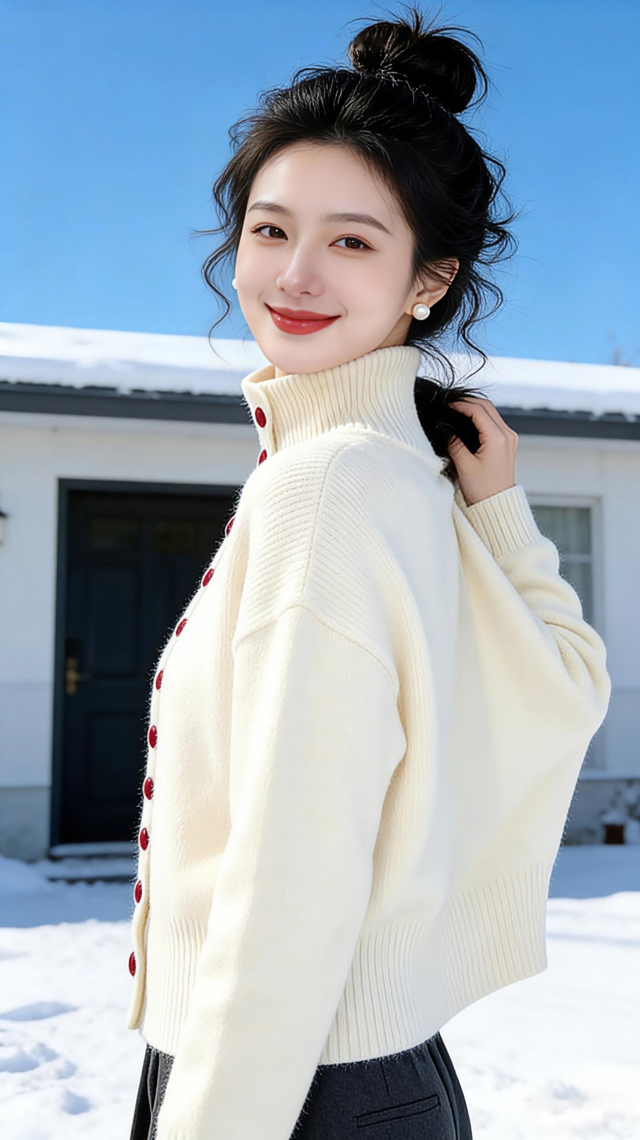 雪日里的绒白温柔 冬日的风卷着碎雪,掠过覆着薄霜的屋檐,而她站在这片皑白里,像从冬日暖阳里揉出的一抹温柔。米白色的针织开衫裹着肩头,高领的纹路顺着脖颈蜿蜒,似把冬日的柔软都织进了针脚里。红扣如朱砂痣,一颗一颗缀在衣身,在素净的绒白间撞出鲜活的甜,像雪地里突然绽开的红梅,点亮了整个清冷的冬日。 她抬手拢了拢耳边的碎发,丸子头松松地挽着,几缕卷发垂在颊边,被风拂得轻轻晃动。指尖触到针织衫的绒面,是软糯的暖意,仿佛握住了一团晒过太阳的云朵。雪光映着她的笑,冷白皮在澄澈的蓝天与白雪映衬下,更显莹润,那抹明媚的笑意,比冬日的阳光更能化开肩头的寒意。 她忽而扯着衣摆轻轻扬起,针织衫的弧度在雪风里漾开,像一只慵懒的白色蝴蝶。或是倚着素墙,手插在口袋里,眉眼弯弯地望向远方,红扣在雪色里明明灭灭,成了冬日里最鲜活的注脚。原来冬日从不是只有凛冽,一件温柔的针织衫,一抹甜美的笑,便能让漫天风雪都化作绕指的温柔,在雪地里酿出一整个冬天的甜。 高级感穿搭 新年穿搭 冬季穿搭 穿搭