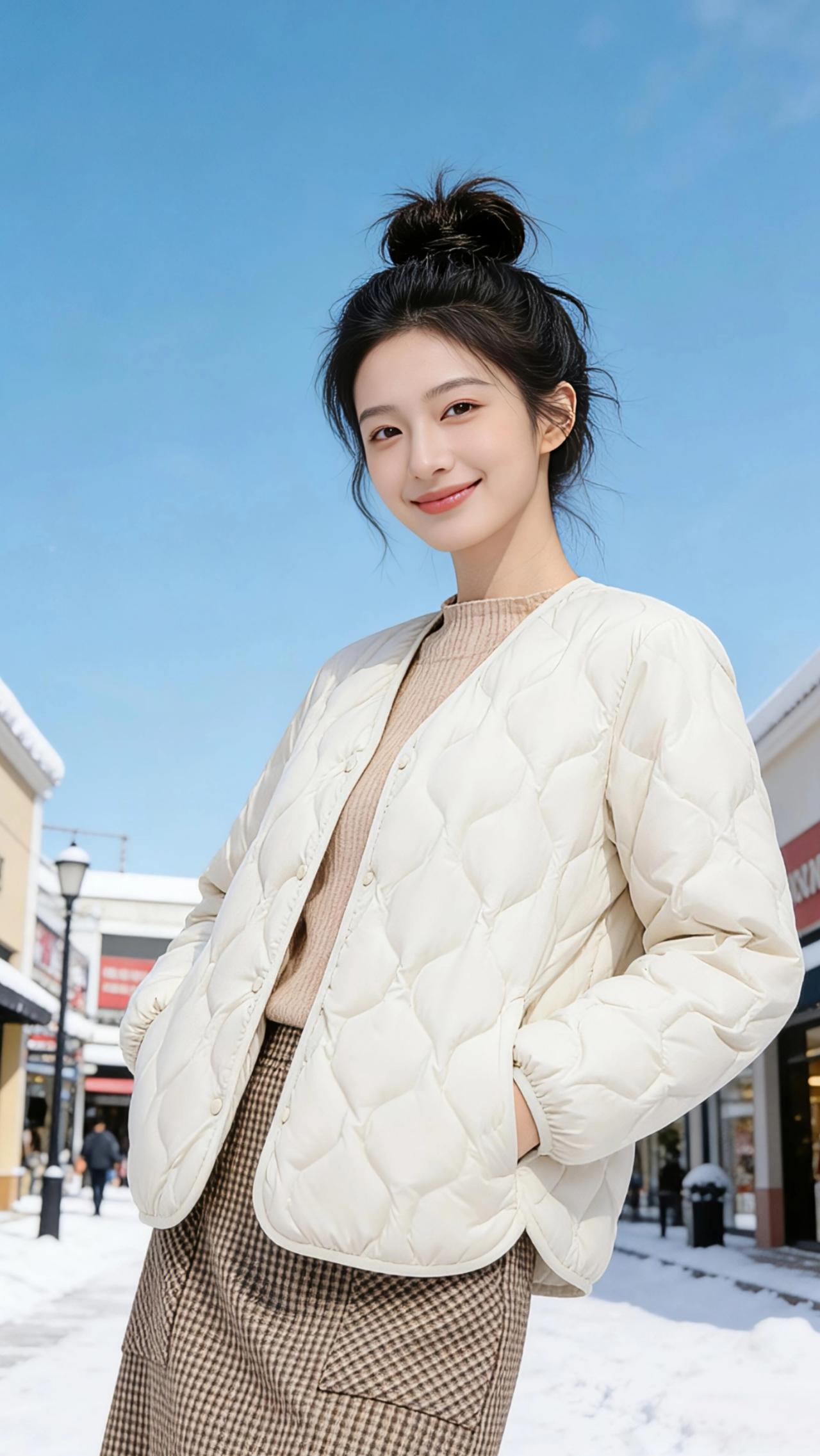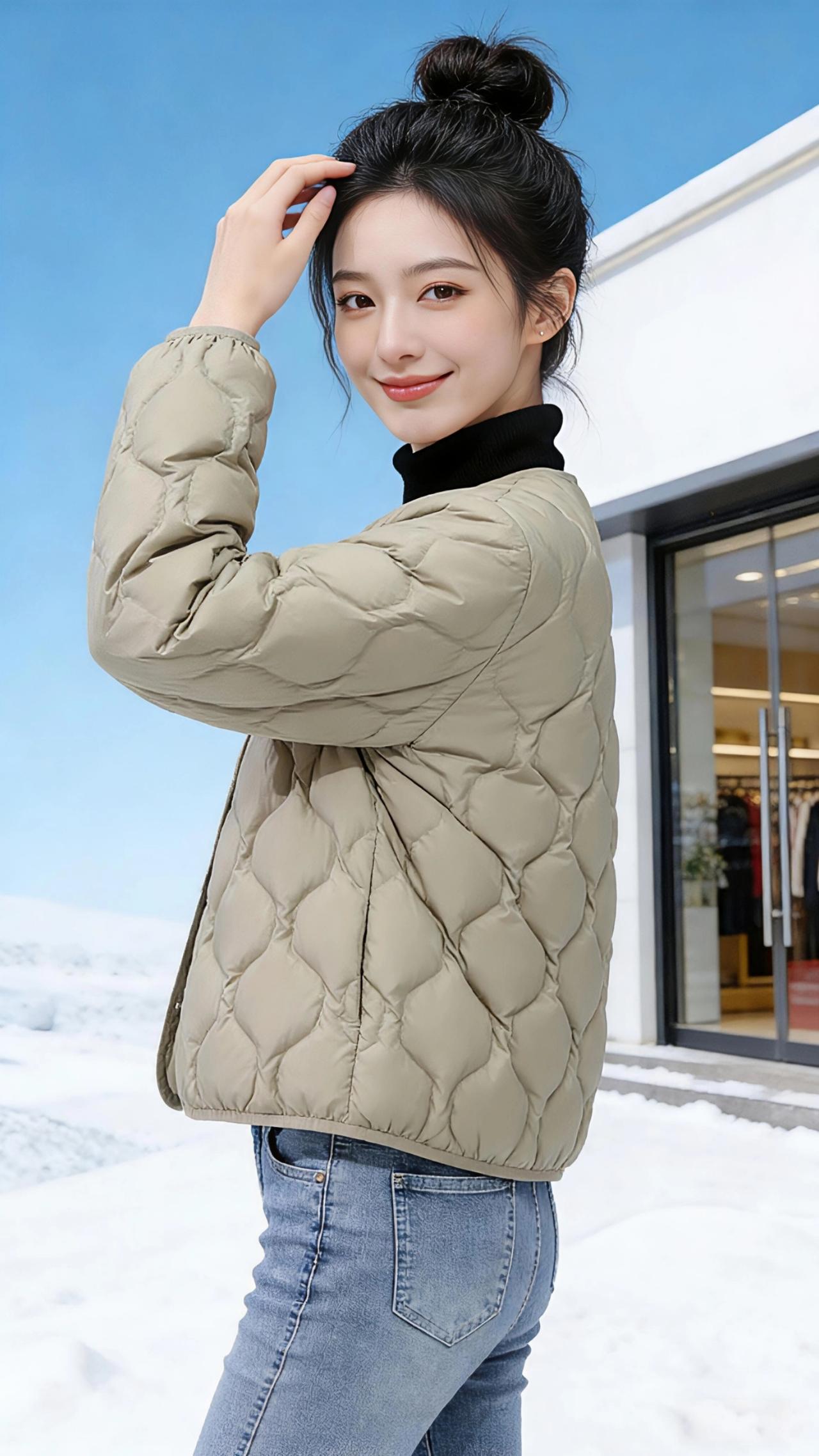 雪日里的轻暖诗意 冬日的街头被白雪轻轻铺展,澄澈的蓝天像一块洗练过的蓝宝石,悬在城市的上空。扎着蓬松丸子头的女孩,成了这片雪色里最鲜活的风景。 浅米色的菱格轻薄羽绒服,似揉了一团冬日的暖阳裹在身上,软糯的质感消解了寒风的凛冽;卡其色的款型又多了几分复古的温柔,与雪地的白、天空的蓝撞出温柔的层次感。她抬手拢了拢丸子头,指尖划过羽绒服的菱格纹路,笑意从眼角眉梢漾开,像融雪后初绽的暖阳,明媚得晃眼。 手插口袋时,羽绒服的宽松轮廓衬得身姿愈发轻盈,牛仔裤的随性与羽绒的软暖相融,是冬日里不被厚重束缚的自在;双臂轻抱时,衣料的纹路在光影里舒展,仿佛把冬日的温柔都拥入了怀中。雪粒落在肩头,又被体温悄悄融去,而这件轻薄的羽绒,却把属于冬日的冷意隔绝在外,只留满身心的轻暖。 原来冬日从不是只有凛冽,一件合心意的衣裳,一抹明媚的笑,便能让雪天的街头,漾出温柔的诗意。 高级感穿搭 休闲穿搭 新年穿搭 冬季穿搭