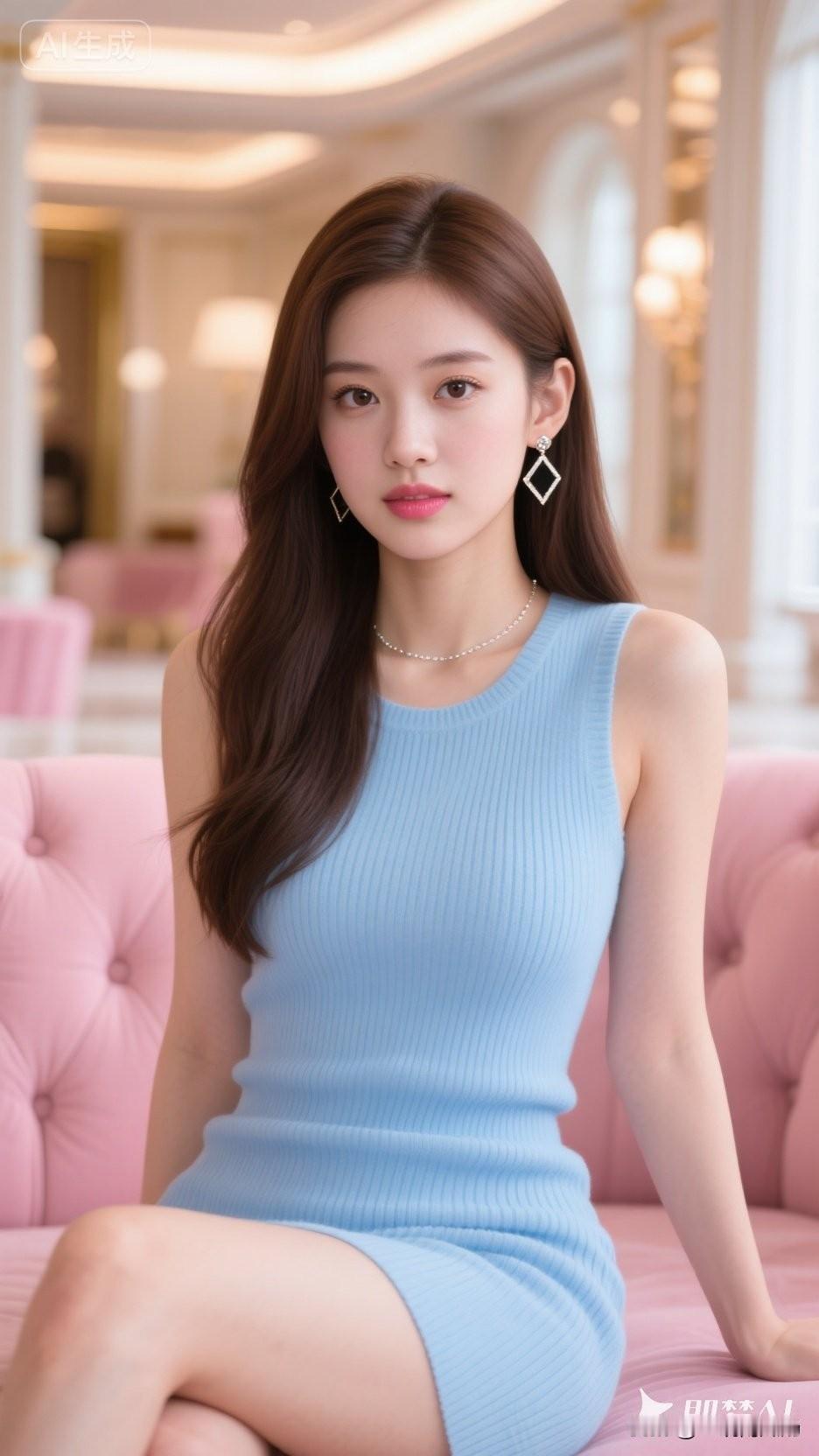 优雅蓝裙,精致妆容,时尚大片