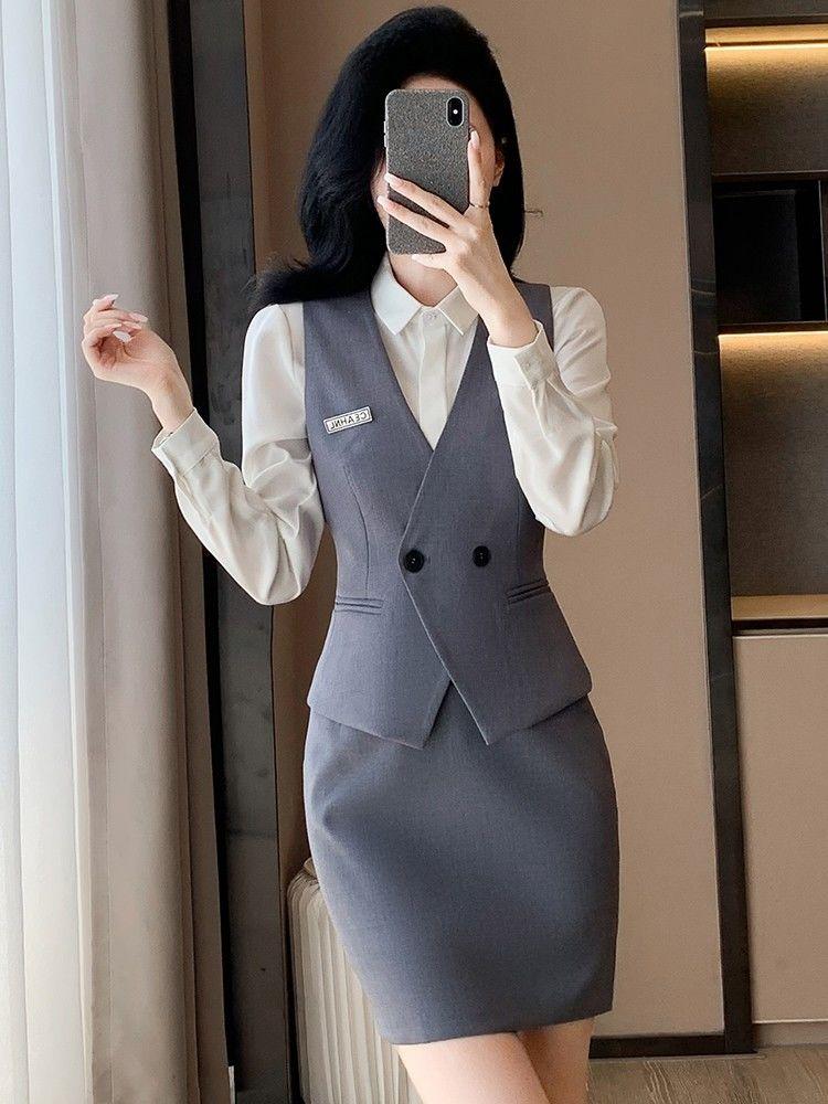 《女式高级感灰色马甲背心职业西装套装》 女式高级感灰色马甲背心职业西装套装,简直是职场女性的救星! 它用的高品质面料,手感软还透气,工作再忙也能保持舒适。灰色经典又百搭,配衬衫、裙子、裤子都好看,银行、酒店等场合都能hold住。两扣设计增加层次感,还修饰身形,显得人特别干练。马甲衬衫套装女 职业装背心马甲 什么样的女人最令人着迷