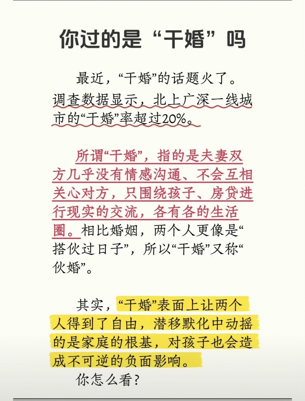 明明有本结婚证,却活得像个合租室友。不少中年夫妻,分房睡,无心灵交流,孩子是唯一话题。 这就是“干婚”——婚姻像被抽干了所有水分,只剩下一张干巴巴的壳。两个人像完成一场漫长的合作,孩子、房子、面子是仅存的纽带。没有争吵,没有眼泪,连愤怒都省了,因为心中已无波澜。 有人说,这比吵架还可怕。吵架至少还有情绪,还想改变。干婚呢?是彻头彻尾的“懒得”。懒得沟通,懒得关心,连架都懒得吵。婚姻成了一具沉默的标本,外表完整,内里早已空洞。 我觉得,人到中年,恰恰最不能“懒”。感情像盆花,你总不浇水,它能不干吗?要么鼓起勇气把话说开,试着重新浇灌;要么坦荡放手,给彼此一条生路。最怕的就是在干涸里麻木地熬着,那是对自己最大的亏欠。 婚姻不该是标本,它得是活水。
