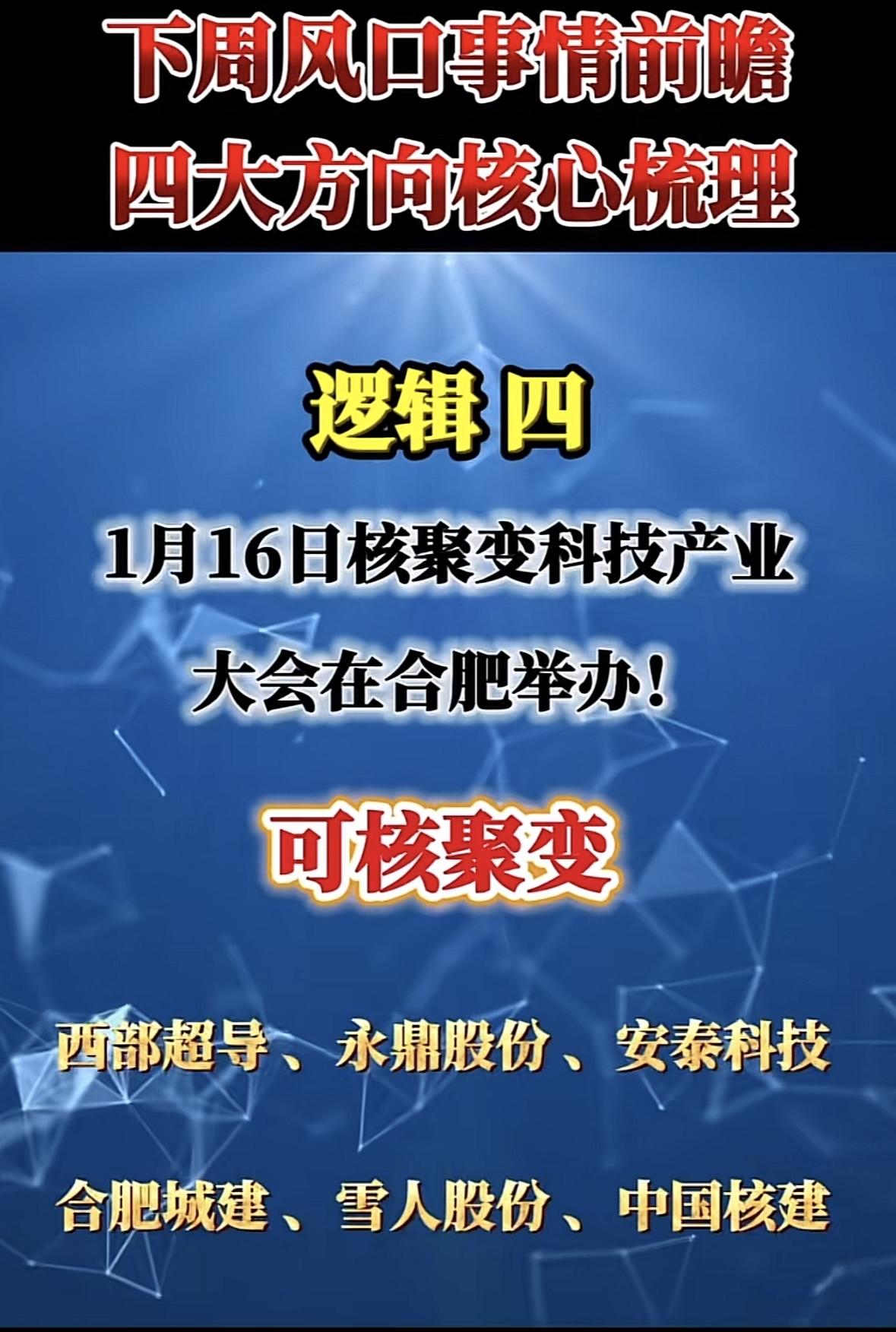 下周风口大揭秘!四大方向核心梳理,1月16日合肥聚变科技产业大会等你来! "文昌火箭发射引燃商业航天热,关注航天发展、雷科防务等核心标的,把握下周风口机遇!" 海南文昌将发射新型火箭,商业航天迎风口,相关概念股受关注,航天发展等领域或受益。