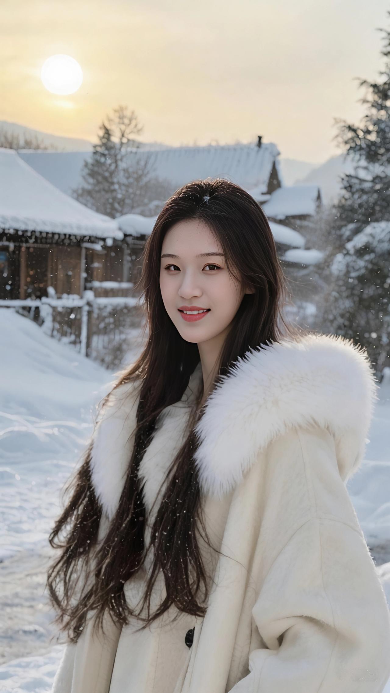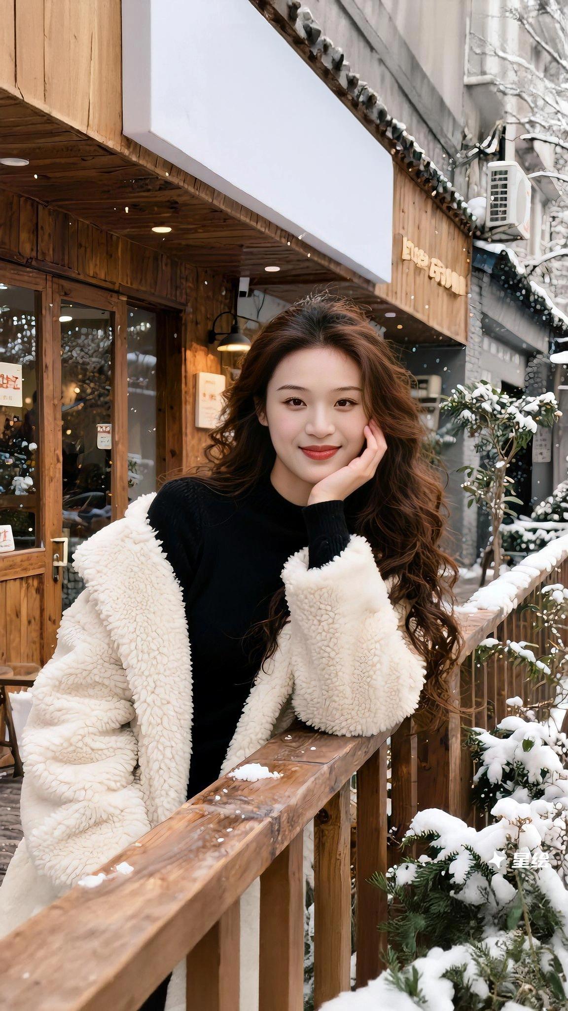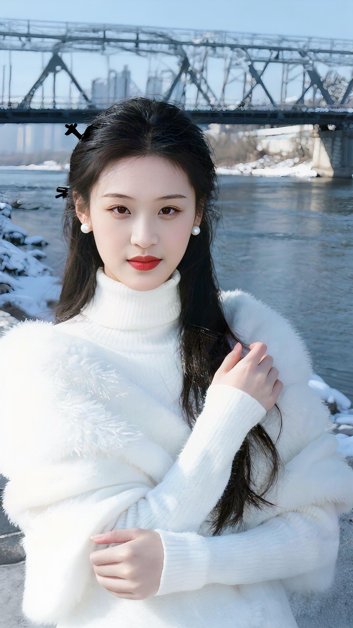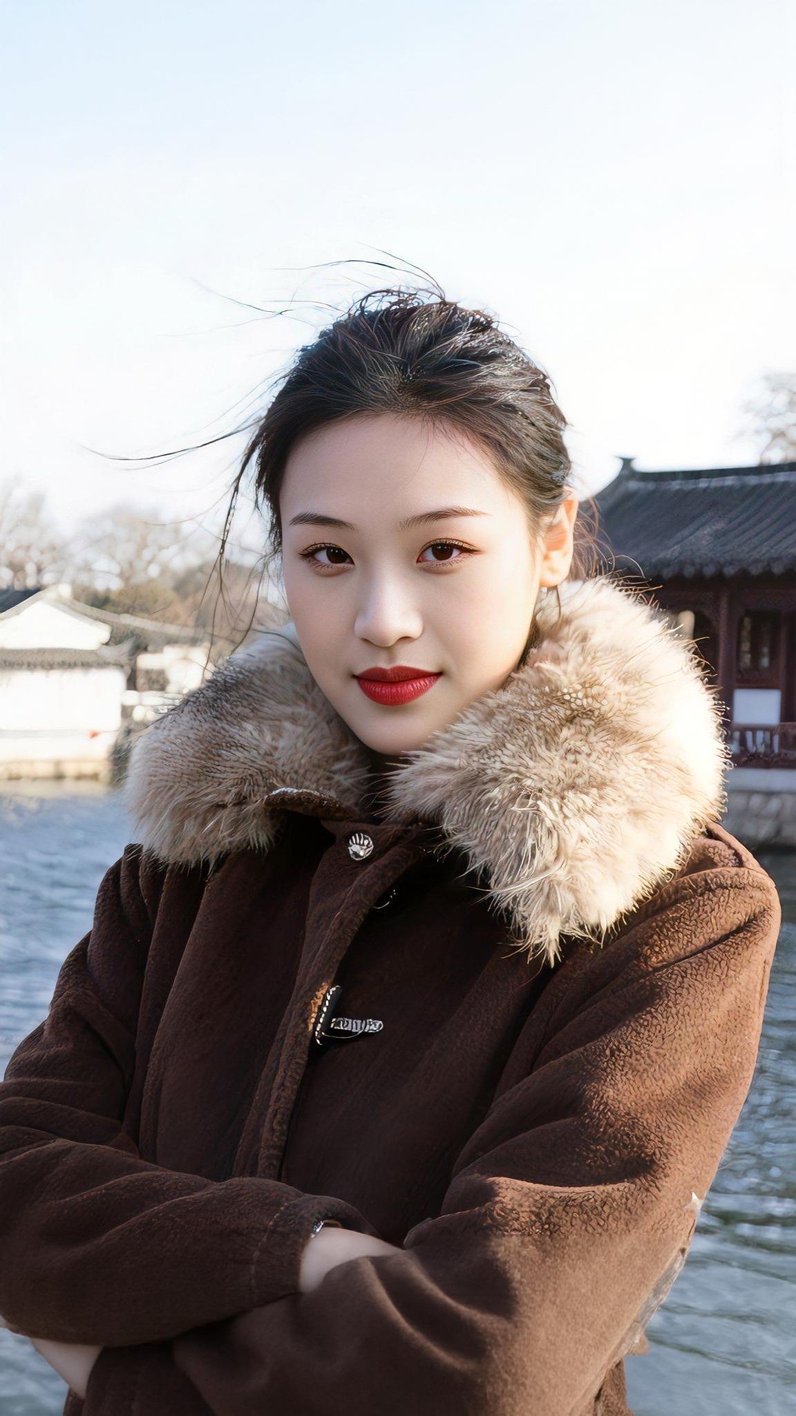 冰在水面结着薄纱 风掠过鬓角,卷走最后一片残冬 棕色的绒裘裹着温柔的棱角 毛领的软,抵着寒江的凉 红唇是冬雪里跳脱的焰 目光落处,水纹轻颤 古檐在身后描着水墨的轮廓 而你站成岸,等春风漫过来 把冰雪揉成涟漪,送冬远去 银装素裹辞旧年 寒江凝素岸生烟, 裘领绒光衬玉妍。 眉底星流融雪色, 唇间霞簇破冬寒。 风梳鬓影临波立, 衣惹霜华对景闲。 静待春风裁柳色, 一川晴水暖江天。