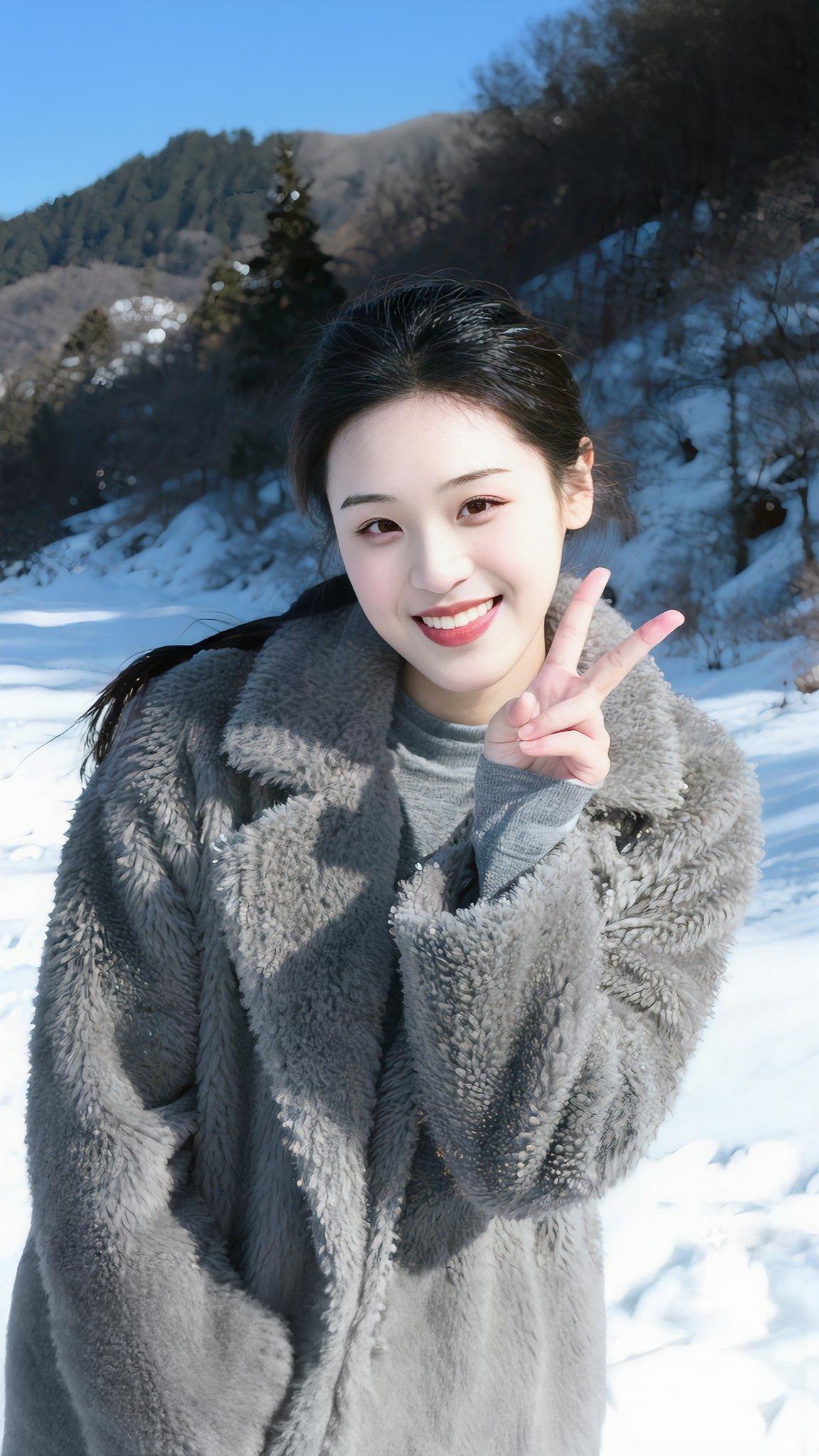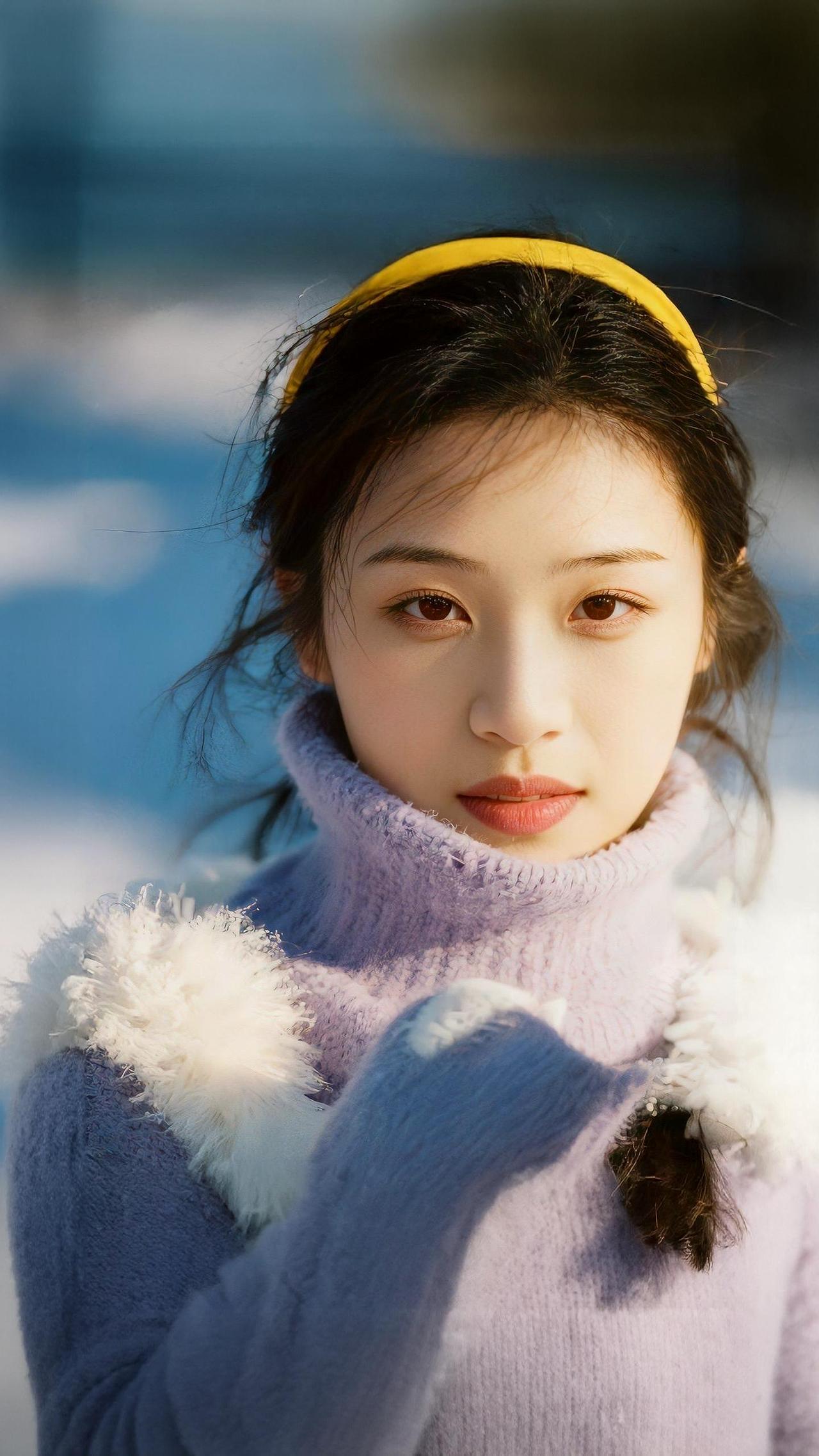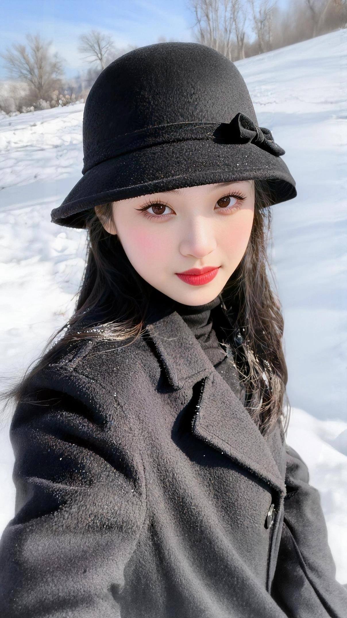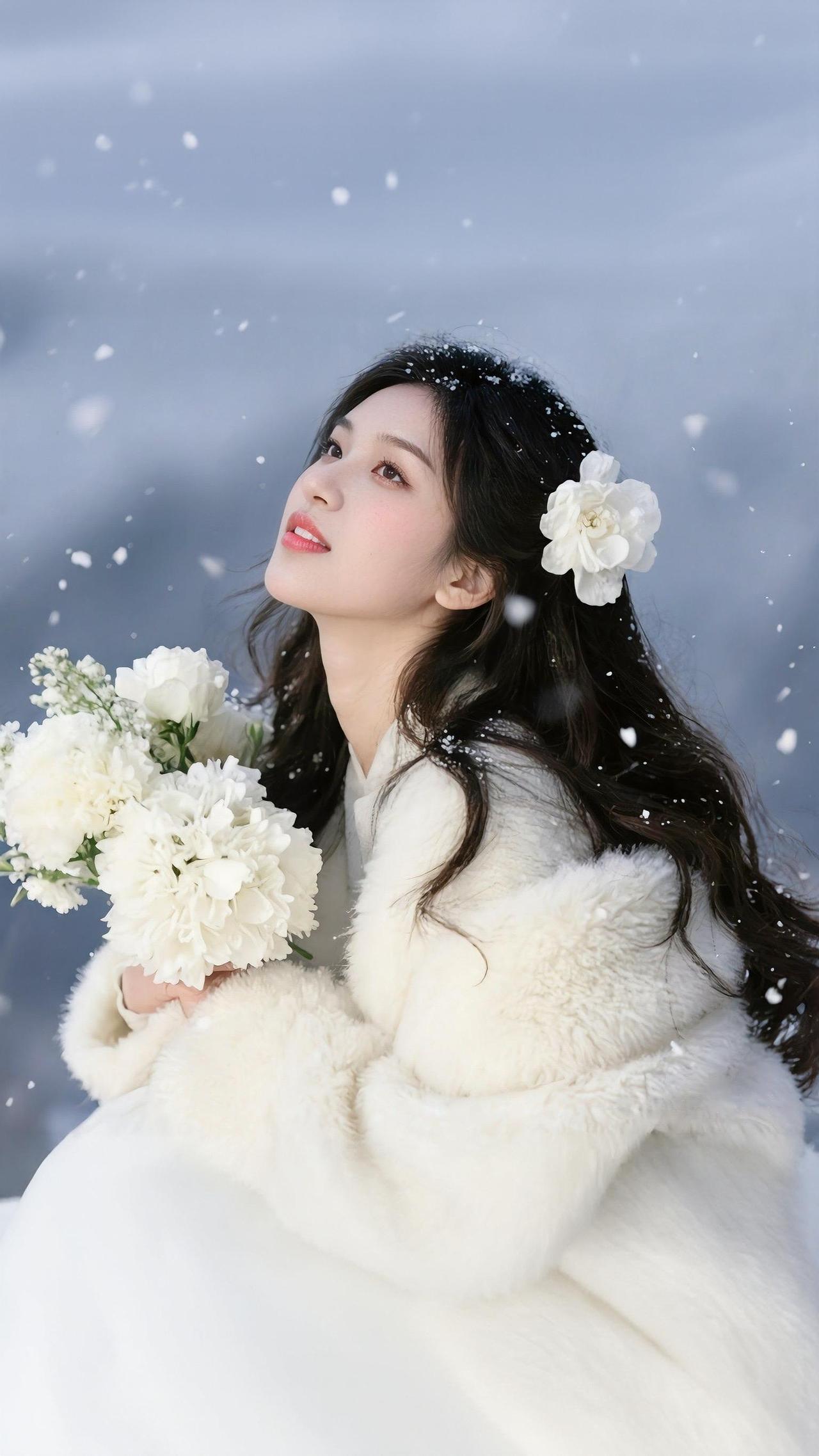 冰在水面结着薄纱 风掠过鬓角,卷走最后一片残冬 棕色的绒裘裹着温柔的棱角 毛领的软,抵着寒江的凉 红唇是冬雪里跳脱的焰 目光落处,水纹轻颤 古檐在身后描着水墨的轮廓 而你站成岸,等春风漫过来 把冰雪揉成涟漪,送冬远去 银装素裹辞旧年 寒江凝素岸生烟, 裘领绒光衬玉妍。 眉底星流融雪色, 唇间霞簇破冬寒。 风梳鬓影临波立, 衣惹霜华对景闲。 静待春风裁柳色, 一川晴水暖江天。