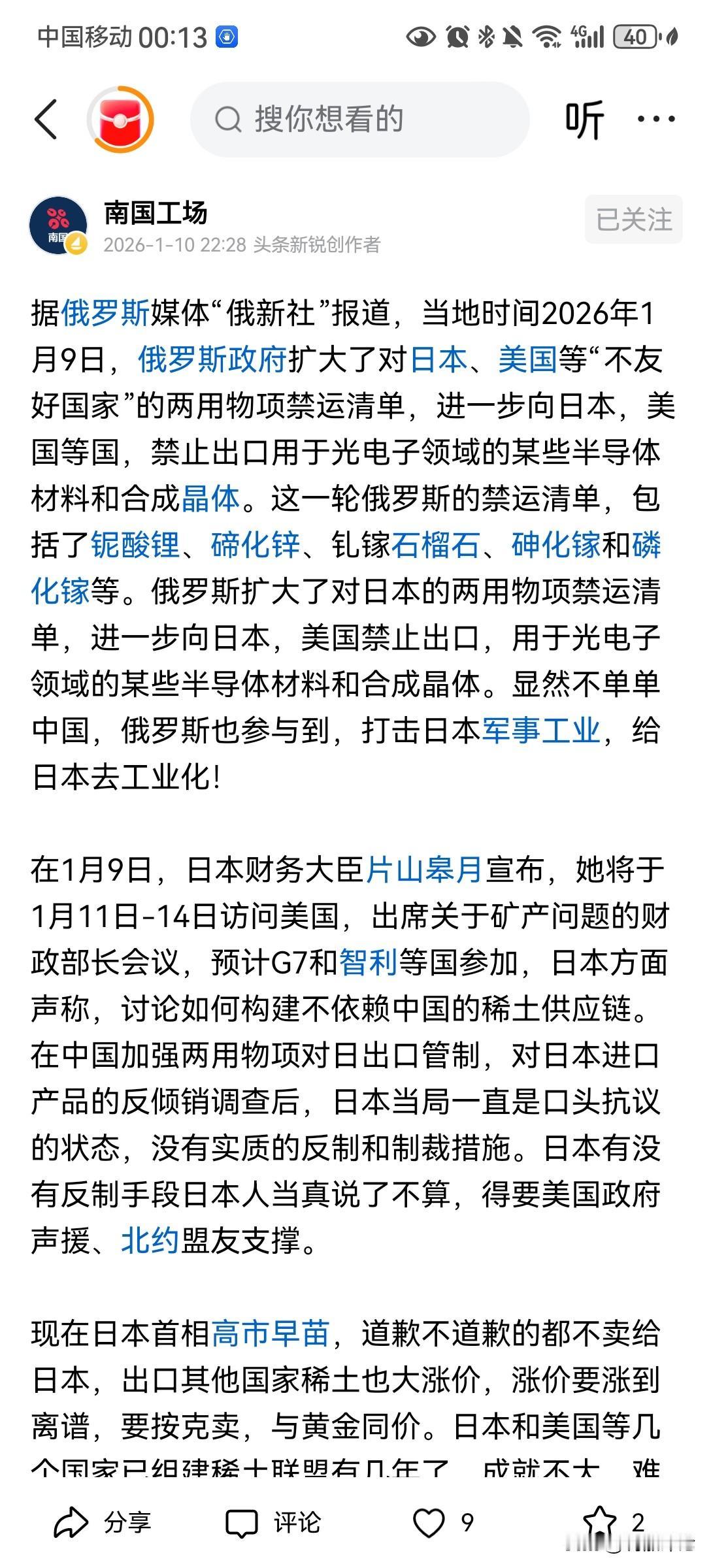 中俄协同,日本军国主义只能死路一条。 在中国宣布对日“两用物”进行出口管制之后,俄罗斯几乎同步跟进对日本实施“稀土”等“两用物”出口管制:清单涉及铌酸锂、碲化锌、钆镓石榴石、砷化镓、磷化镓、石英、氧化碲。 日本从中国进口的稀土,占日本进口总量的70%-83%,其中用于电机、磁体等高端产业的重稀土(如镝、铽)依赖度接近100%。 现在,日本民用企业,想要正常进口这些“两用物”,就必须与日本军工产业彻底切割。一旦这些民用企业与日本军工产业切割,日本的军工产业,就顶多只能算是个太监,中看不中用。 失去军工产业的加持,日本军国主义的复活梦,就只能永远是梦。
