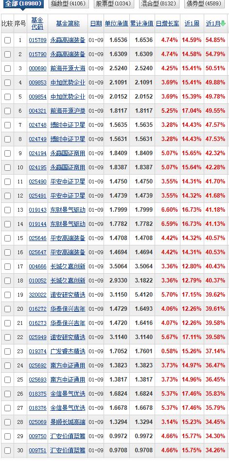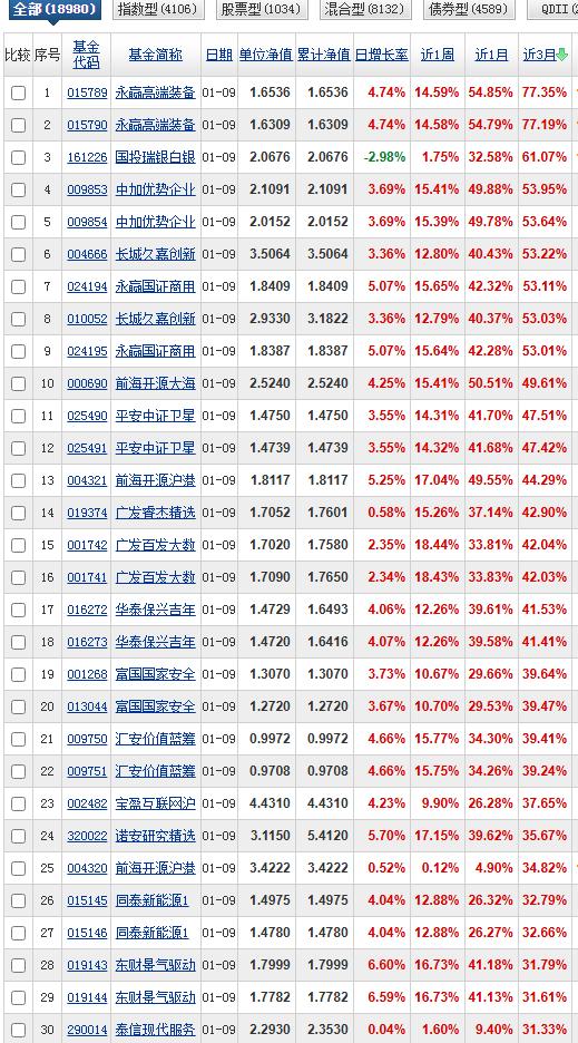 三月榜和一月榜已经看不到2025年熟悉基金的影子了,明明它们在六月榜优势还那么大,可是三月榜和一月榜再也看不到哪怕一只了。这就是基金市场的残酷性,竞争何其惨烈! 三月榜永赢高端装备智选以77.35%的收益强势拿下第一,国投瑞银白银期货61.07%排名第二,中加优势企业53.95%排名第三,长城久嘉53.22%排名第四,永赢国证商用航天产业53.11%排名第五。前海开源大海洋49.61%排名第六,平安中证卫星47.51%排名第七。我们可以看到永赢高端装备优势很大,几乎是断崖式的领先。 一月榜不用说霸榜的继续是永赢高端装备,一个月收益率54.85%,前海开源大海洋50.51%排名第二,中加优势企业49.88%排名第三,前海开源沪港深强国产业49.55%排名第四,博时中证卫星47.57%排名第五,永赢国证商用卫星42.32排名第六,平安中证卫星41.70%排名第七,西藏东财景气驱动41.18%排名第八,平安高端装备,长城久嘉,诺安研究精选紧随其后。 我们可以看到排名靠前的清一色来自商航板块,但永赢高端装备的领先优势在缩小,尽管永赢肯定是抢跑的,但追赶者的速度实在太快,前面我们统计过永赢国证商用卫星在商航板块七免指数型基金里的领先优势还挺大的,这次直接被博时反超了接近6%,被平安也追的很紧。大有前后夹击之势。博时反而成为商航七免指数型基金的首选了!