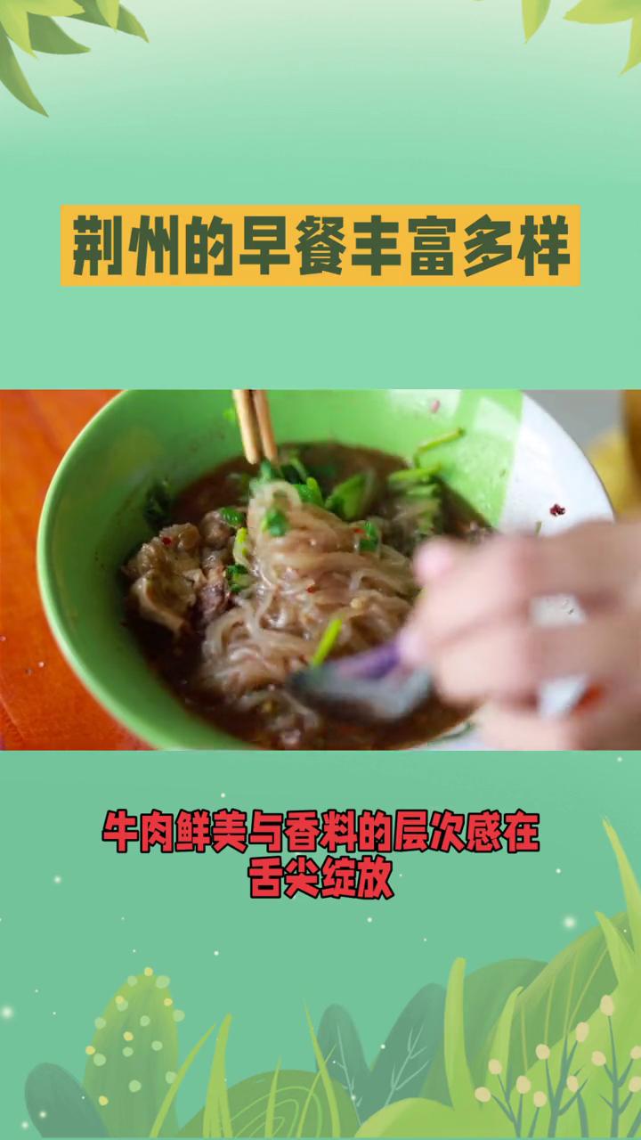 荆州的早餐丰富多样。 荆州这座历史悠久的城市不仅有着深厚的文化底蕴,还拥有令人垂涎欲滴的美食。荆州的早餐丰富多样,充满特色。 ·圆豆泡糯米是沙市的传统早点,提前6小时浸泡的豌豆与猪大骨一同熬制,直至豆子绵软,汤色浓白。再将蒸熟的糯米饭泡入其中,撒上清新的豌豆,口感咸香适口。 ·牛肉米粉也是荆州早餐的"味觉信仰",荆州特有的宽米粉,米香浓郁,口感爽滑又有韧性,能完美挂住汤汁。店家选用新鲜牛大骨,配以十几种秘制香料,历经数小时慢火熬制的汤底浓郁醇厚,牛肉鲜美与香料的层次感在舌尖绽放。 ·荆州的正餐同样令人惊艳,荆沙甲鱼是一道传统名菜,历史可追溯到战国末期,以甲鱼为主料,制作方法多样。地道的荆沙甲鱼汤稠味浓,甲鱼肉质弹性十足,胶质Q弹,软糯粘牙,甲鱼脚酥烂脱骨,喷香诱人。 ·排骨藕汤也不容错过,节长丝少的洪湖粉藕配上猪排骨,慢火制成的汤又香又粉,又鲜又甜,一碗热汤下肚,暖意透身。 ·此外,荆州的小吃也别具风味,发糕与汽水粑粑是大赛巷的"米食双星",发糕如云朵般松软,采用老酵古法发酵,蒸熟后自然开裂成"开花"形态,口感湿润绵软,甜度温和不腻。汽水粑粑则外脆内软,米浆发酵后煎烙而成,一面形成焦香酥脆的"锅巴",一面保持柔软蓬松,微酸回甘,米香纯粹。