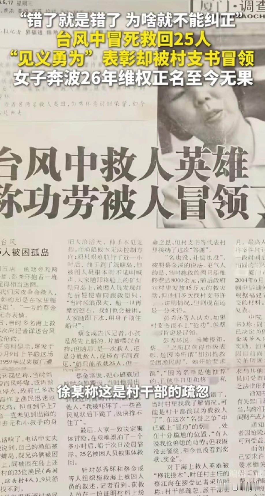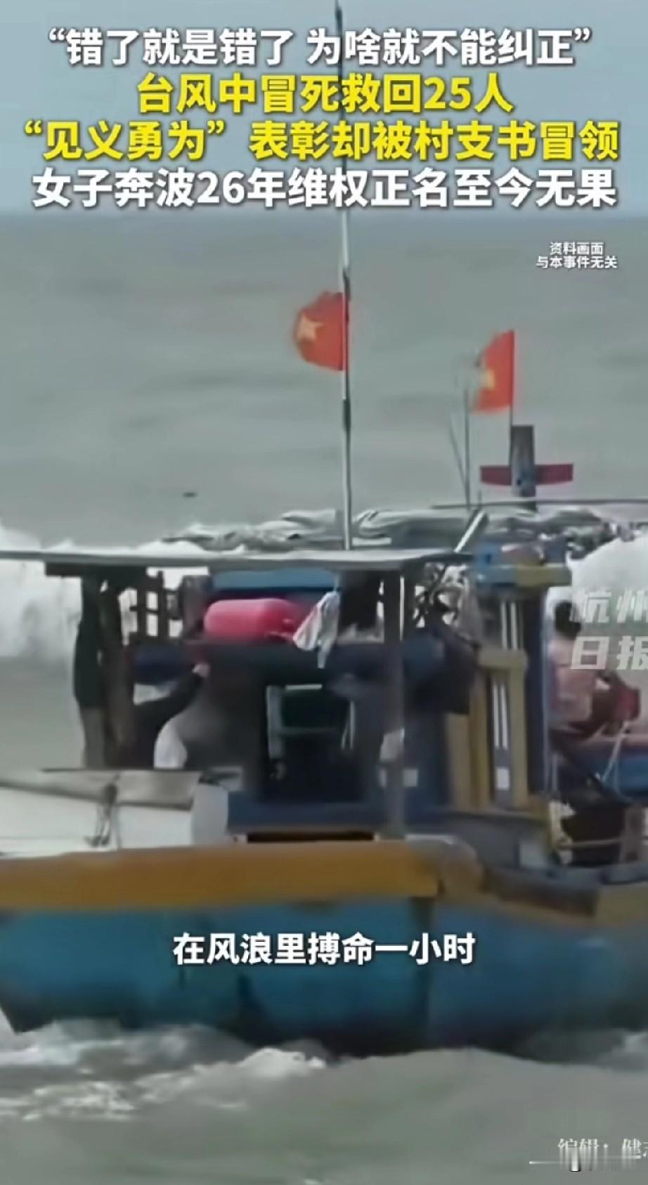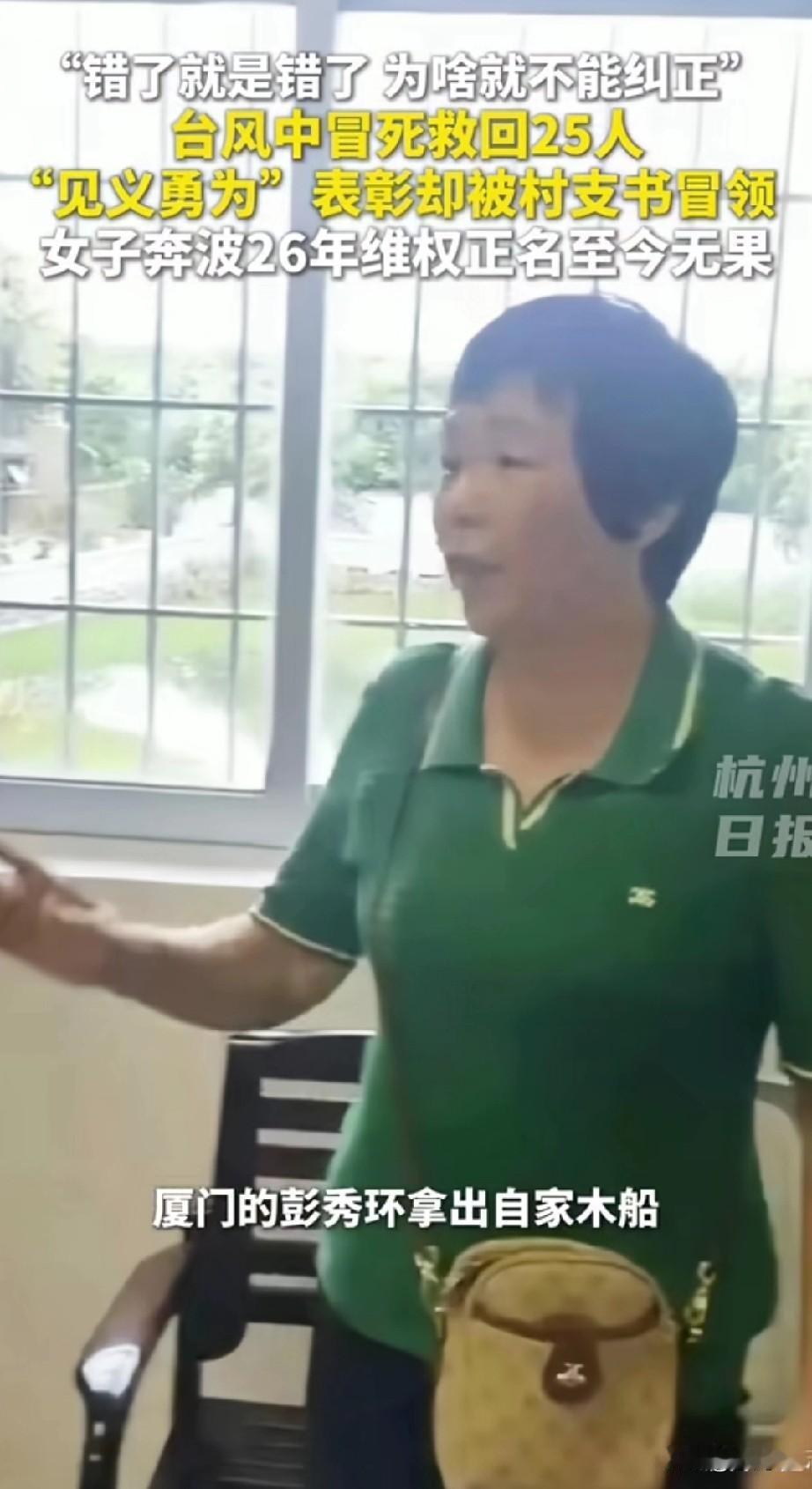 “见义勇为表彰维权?”福建女子说在1999年台风中,联合四个村民,撑着自家小船,拼了命救下来被困的25人,结果表彰的是村支书和其他人,为救人自己修船花了8千,救灾款却一分没得。 看到表彰证书,自己十分不理解,当时台风风力十几级,在海面上船只都不稳,冒着生命危险救下来25条人命,最后他人却成了见义勇为英雄。 为了维权她已经整整坚持了26年,救人的四名村民,有人已经去世了,冒领的当事人也已经离世,可是该属于她们的名誉却迟迟未来。 如今只有她一个人在坚持维权,虽然已经过了两年的申诉期,很多人也劝她不要坚持,但是彭秀环从没有放弃。 为了救人可以舍弃生命,没想到维权却花了26年的时间,她有救助人亲笔签名的联名信,每个人都积极配合,还有鲜红的手印,但每次上访都被驳回。 找了一波波的律师,都在热情消耗后悄然退场,从一群人的火光,变成她的星星之火。 最终政府撤销了错误的嘉奖,也提出给予彭秀环奖章和现金奖励都被她拒绝。 因为这事折腾了26年,她要的不是赔偿,而是该属于英雄的正义,那是多少金钱补偿弥补不了的。 就如彭秀环所言,错了就是错了,她想要的也是为真正的英雄正名!