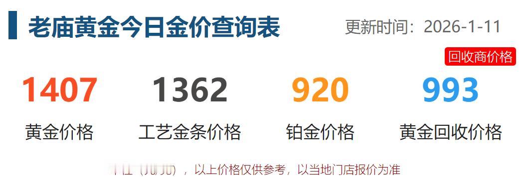 今天是周日, 算是消费的小旺季, 不过商场里面人员不太多。 小编再次看了一下, 商场里面品牌黄金的价格。 1月11日, 老庙黄金的价格为1407元, 工艺金条价格为1362元; 铂金价格为920元, 黄金回收价格为993元。