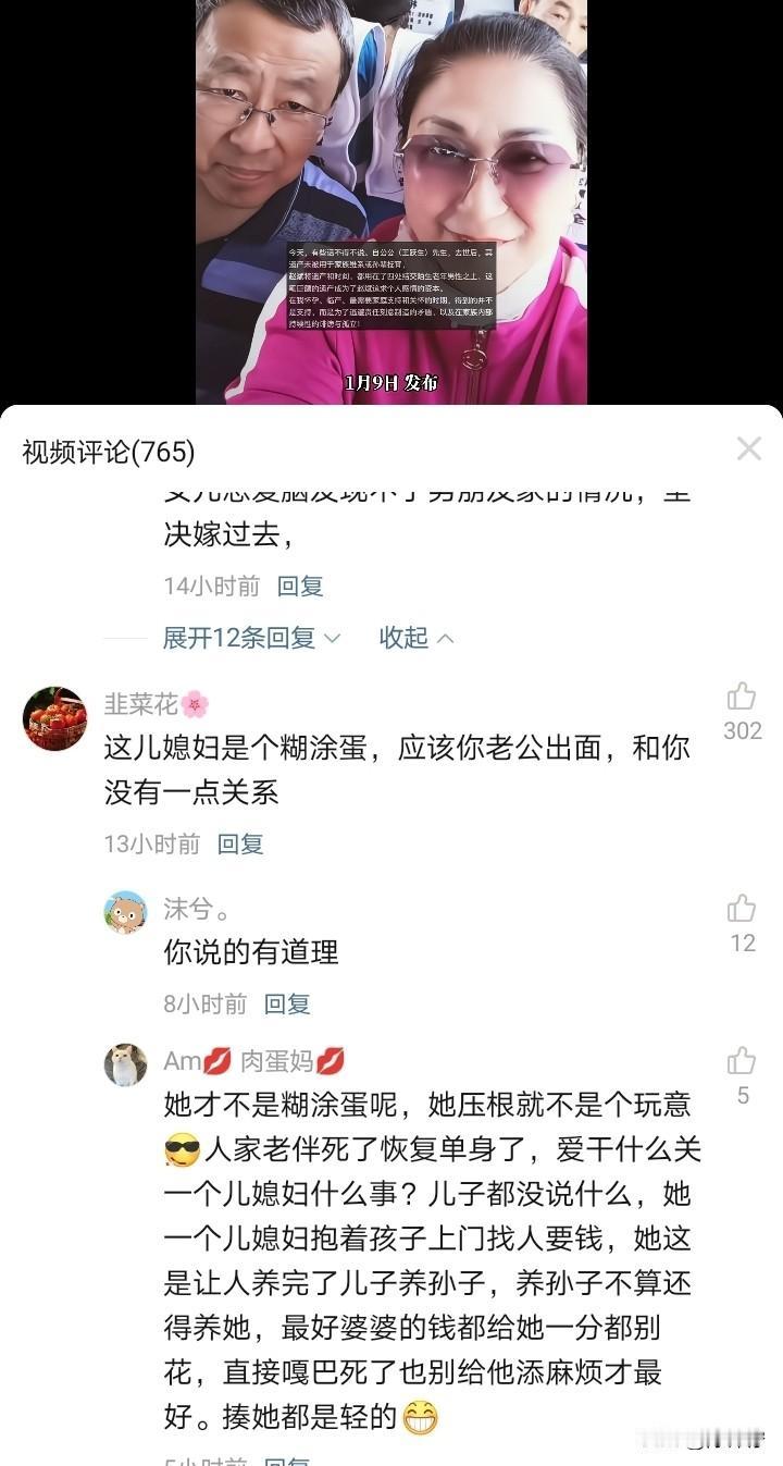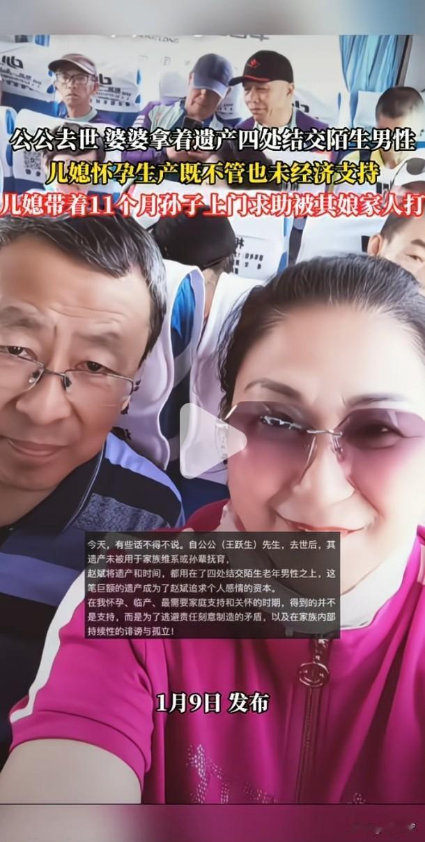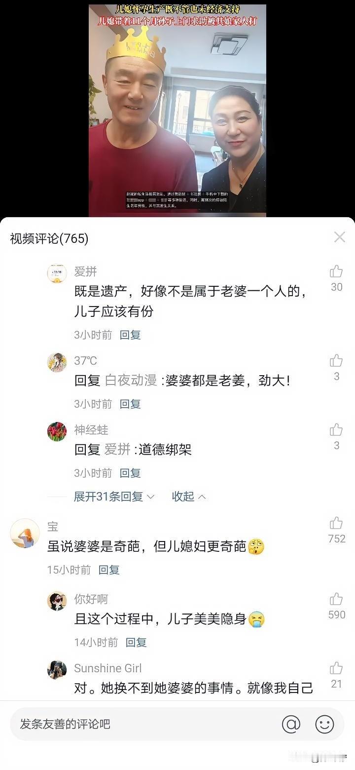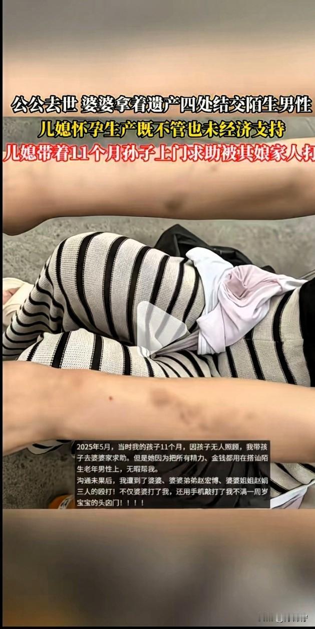 解释不清了!刷到个视频,真是一言难尽! 儿媳控诉,公公去世后,婆婆拿着遗产四处找老年男性,把钱和精力都花在谈情说爱上,她怀孕、生孩子的时候,婆婆一点不管也没给过一分钱。 2025年5月,她带着11个月大的儿子上门,想让婆婆搭把手带娃,结果反倒被婆婆和婆婆的弟弟、姐姐三人打了,居然还有人用手机砸了孩子的囟门! 评论区直接吵翻了,有人说婆婆带孩子是情分不是本分,遗产想怎么花是她的权利;也有人说儿媳是糊涂蛋,这事该让老公出面,公公的遗产儿子本来就有份;还有人吐槽儿子从头到尾都隐身了。 大家觉得这事儿到底谁占理?