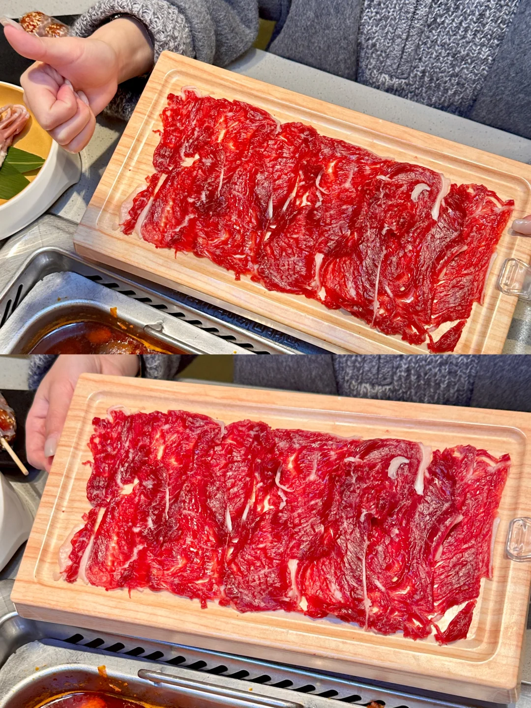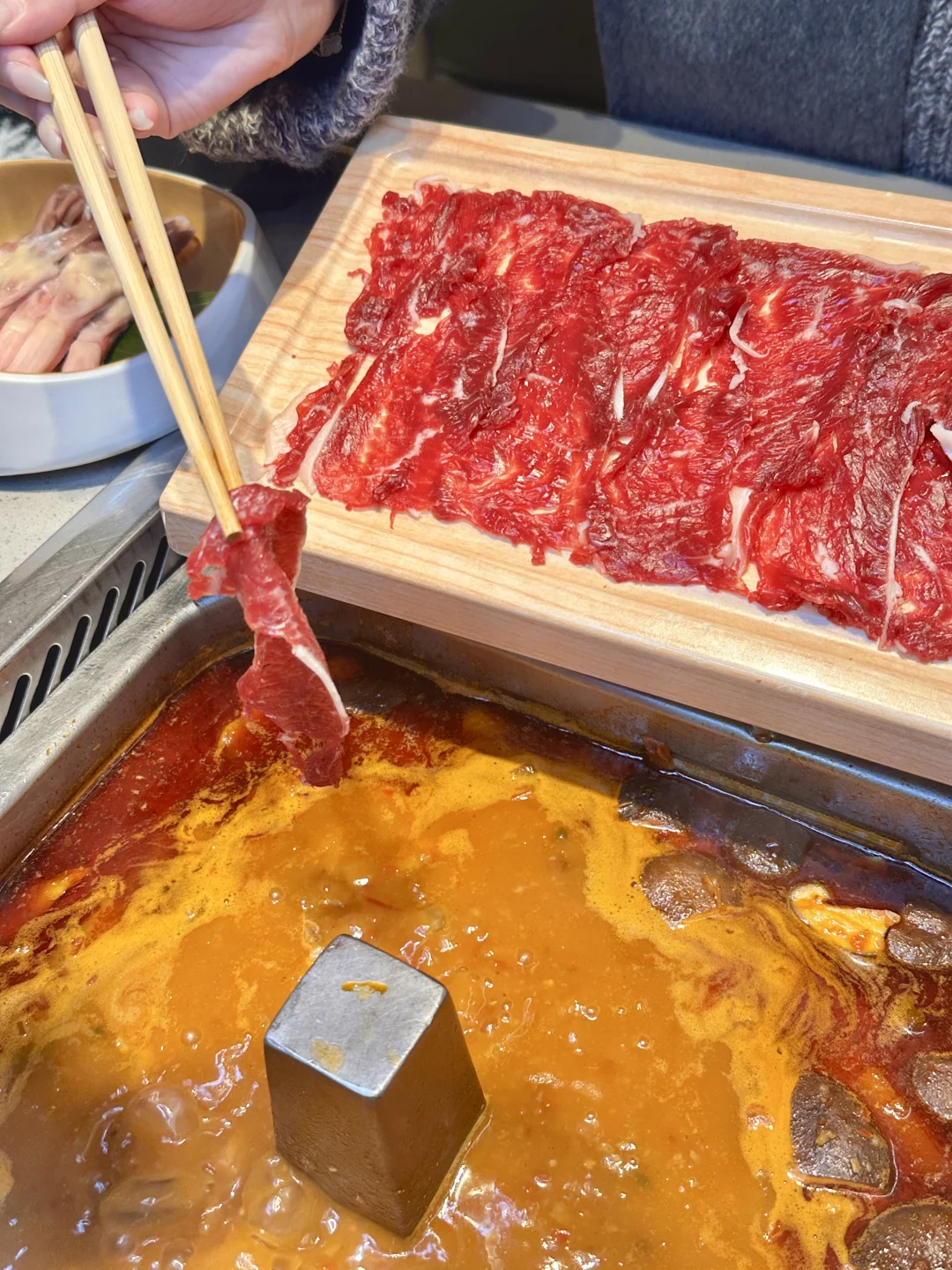 🌈酸汤配上鲜切吊龙,更加激发了牛肉的爽滑口感,吊龙本身自带一点淡淡的奶香,搭配上酸汤,甚至都不用蘸料就能直接吃光一盘的存在!怪不得吃贵州酸汤火锅大家都总要配上几盘鲜牛肉,真是绝配!