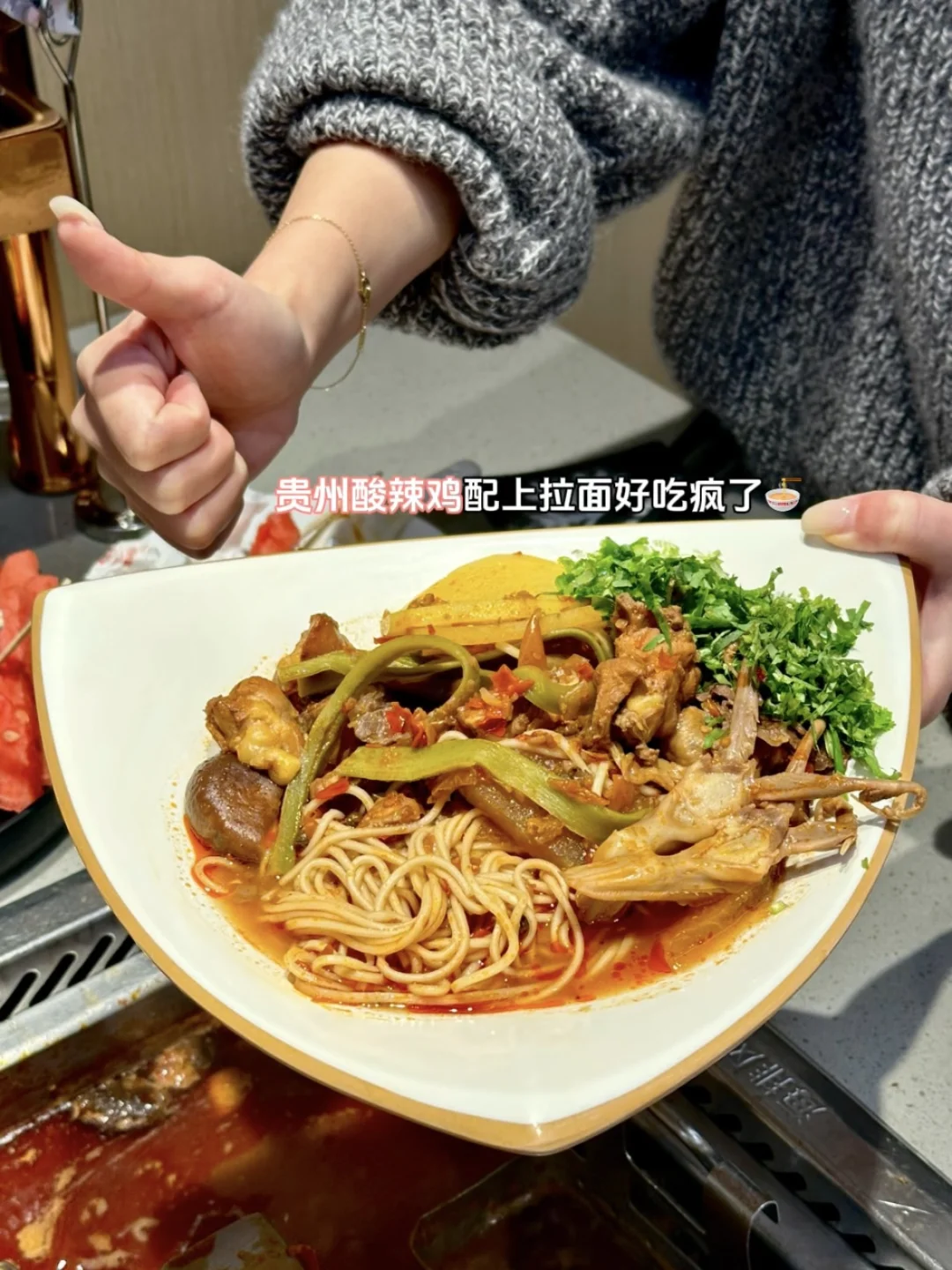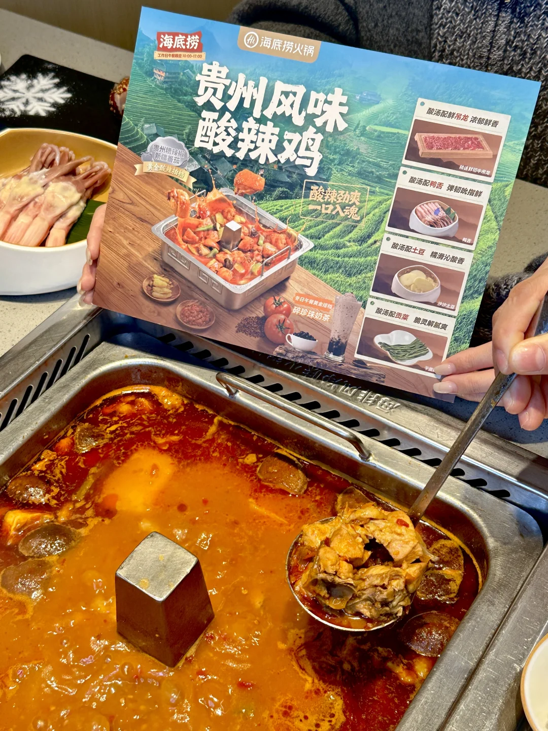 🌈今天刚好调休,就从上海去苏州找我表姐玩,表姐直接带我去了她家楼下的海底捞!吃了一顿新上的遵义酸辣鸡火锅!鲜香酸辣太上头了!