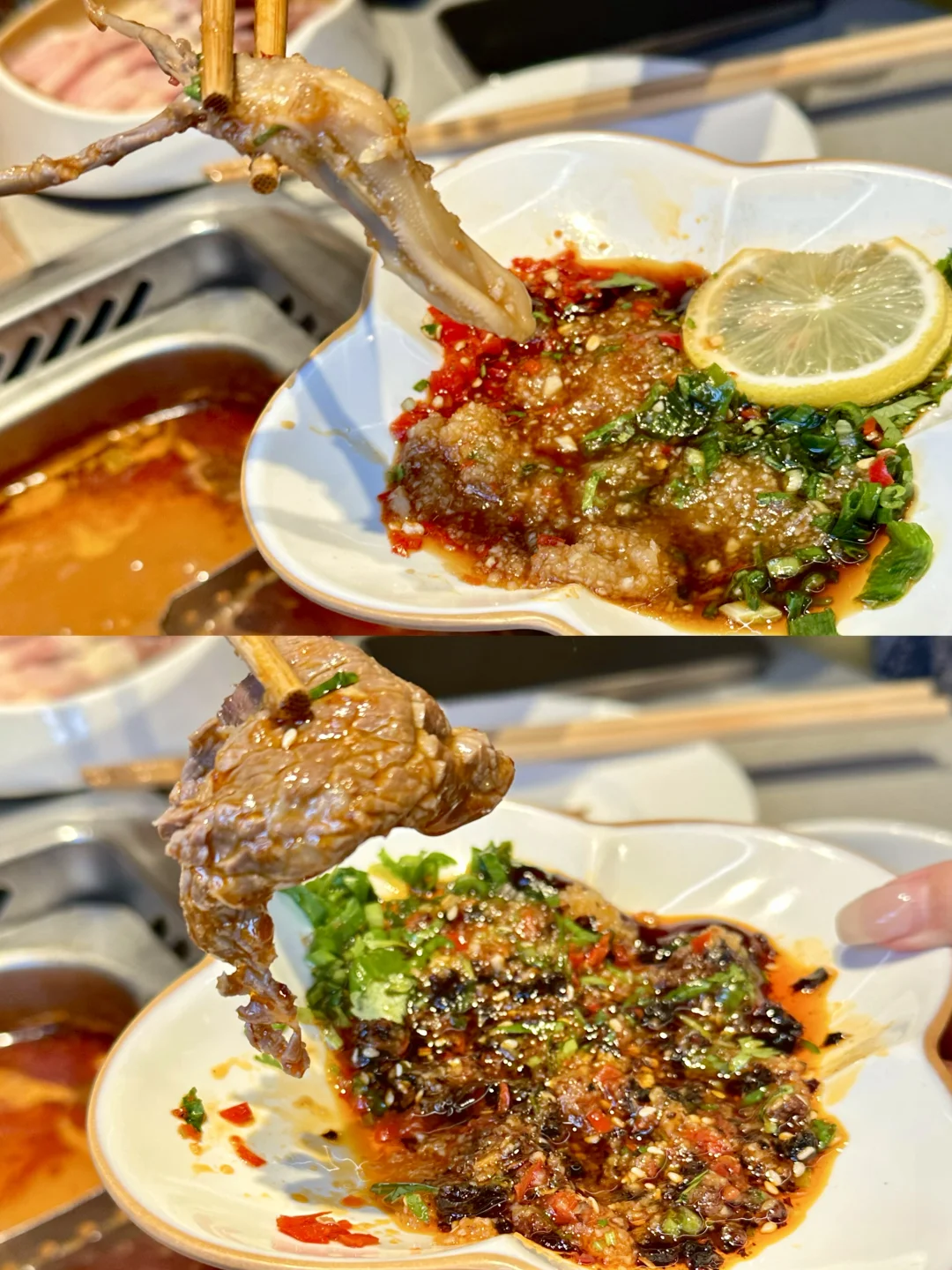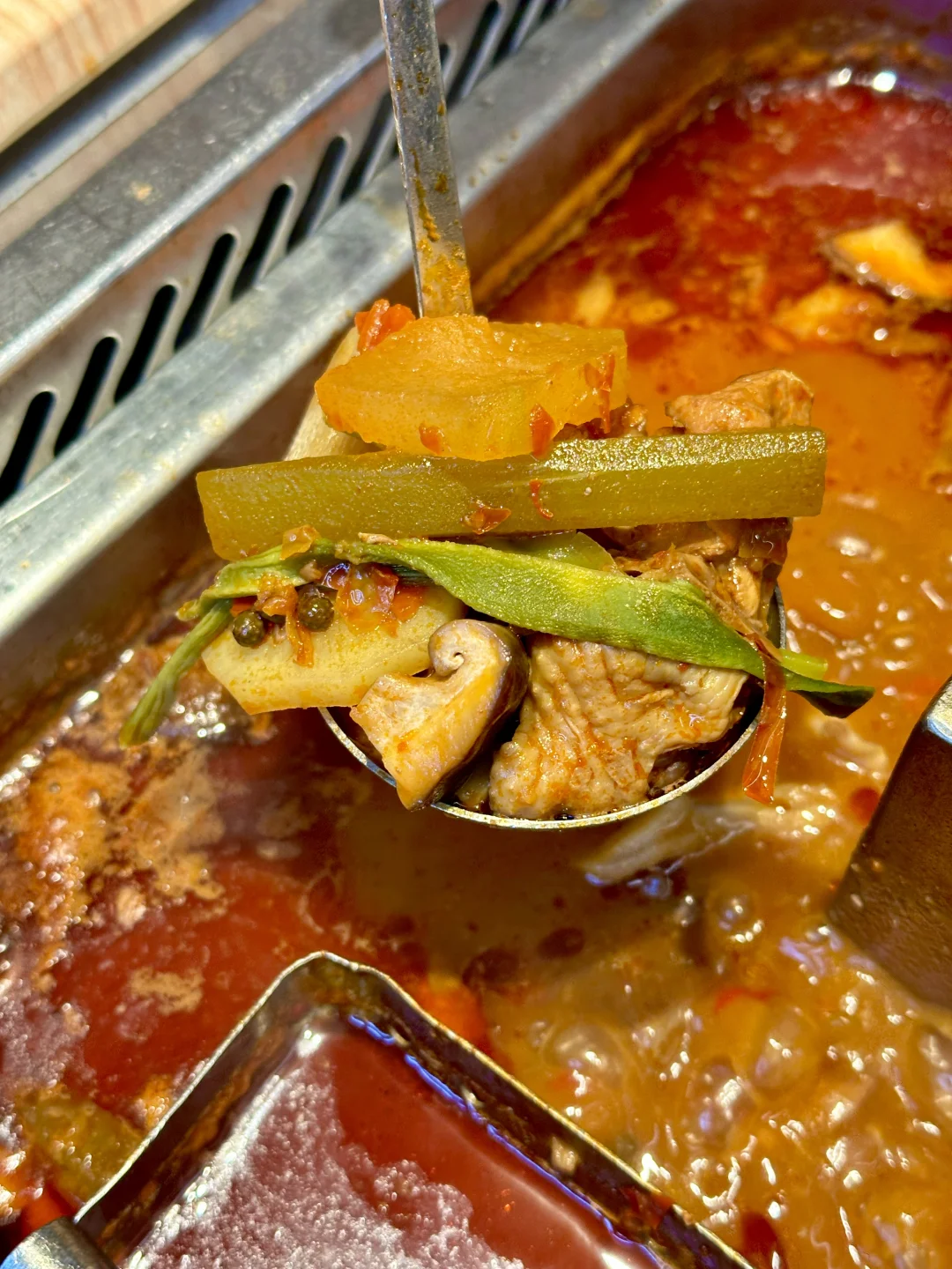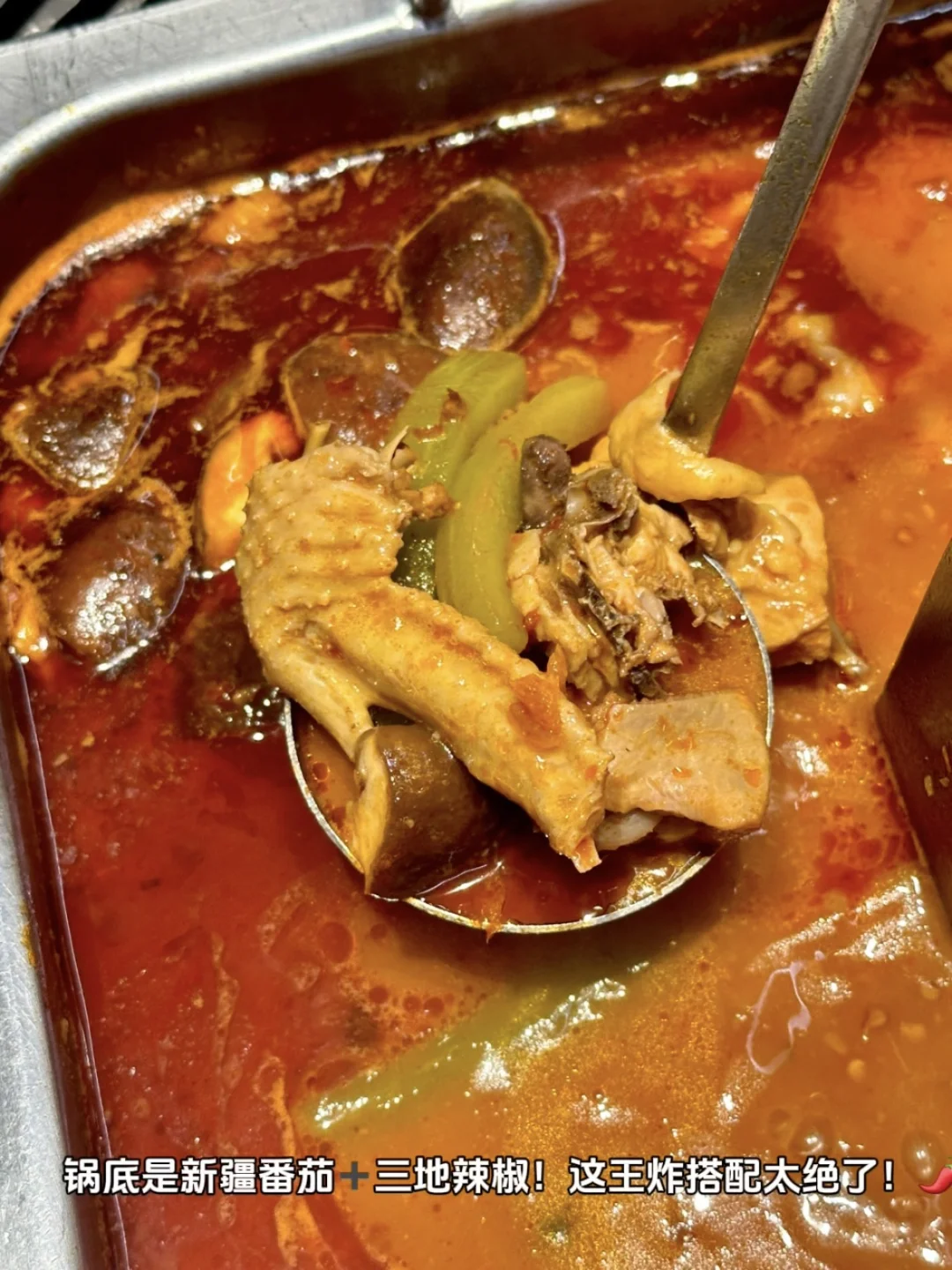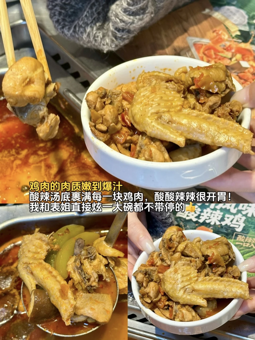 🌈一勺下去是大块的鸡肉,一直在煮,吃到后面也不会老,关键是特别入味,搭配店里的灵魂蘸料,最好是把锅底煮开后5分钟左右再开始吃,酸酸辣辣的汤汁配上鸡肉的爽滑鲜嫩口感,根本停不下来!