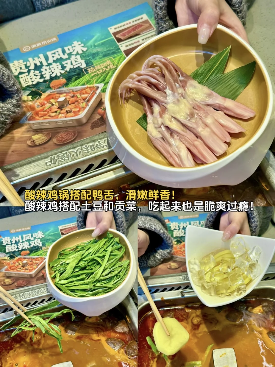 🌈还有土豆和贡菜,和酸辣鸡锅底搭配起来吃更加香,土豆和贡菜吸满了汤汁,一口下去黏糊糊的土豆和脆爽的贡菜里面混合着酸辣汤的鲜香,谁吃谁知道!!