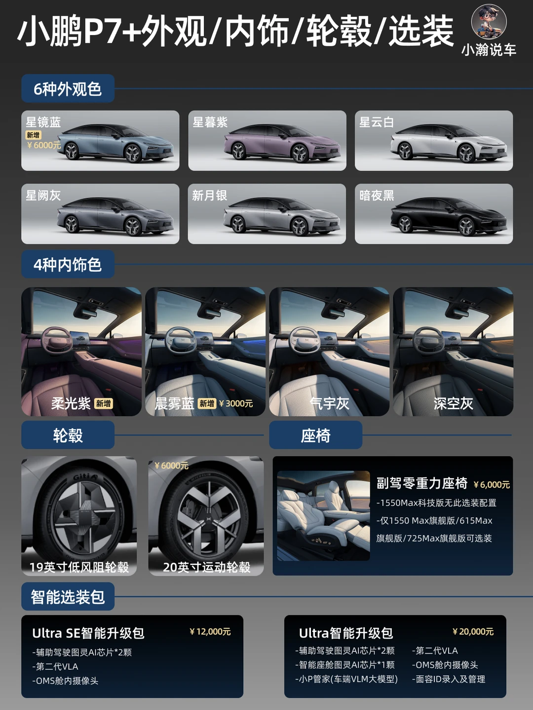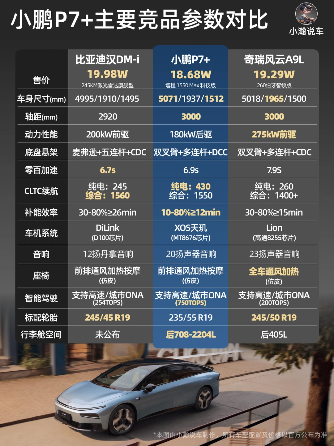 💰26款小鹏P7+增程版的价格刚公布时,小瀚起初是有些失望的。因为市面上大部分车型的增程版,售价通常要比纯电版便宜1-2万元。后来向前同事咨询了解到,目前具备5C超充能力的大电池增程系统,其成本确实高于同级别的纯电版本。从P7+两款入门版本的配置差异也能看出,增程版通过精简了部分纯电版标配的舒适性配置,才实现了与纯电版同价。 🚗横向对比来看,在20万元以内的家用轿车市场,提供“大电池+小油箱”方案的车型,小鹏P7+目前确实是“独一份”。此前小瀚在线下试驾时,能明显感觉到P7+的底盘质感相较老款有非常显著的提升。再结合其大空间、高算力智能驾驶辅助等纸面实力,如果希望在春节前提车,眼下还能享受额外8千元购车补贴的P7+,确实是一个值得考虑的选择。 🚗版本推荐:每个配置的详细解读见图。小瀚强推P7+增程版的入门版!尤其对于后排不经常需要带人的用户来说,入门版本性价比很高!纯电版在这个价位段面临较多竞品,建议大家综合比较后再做决定。