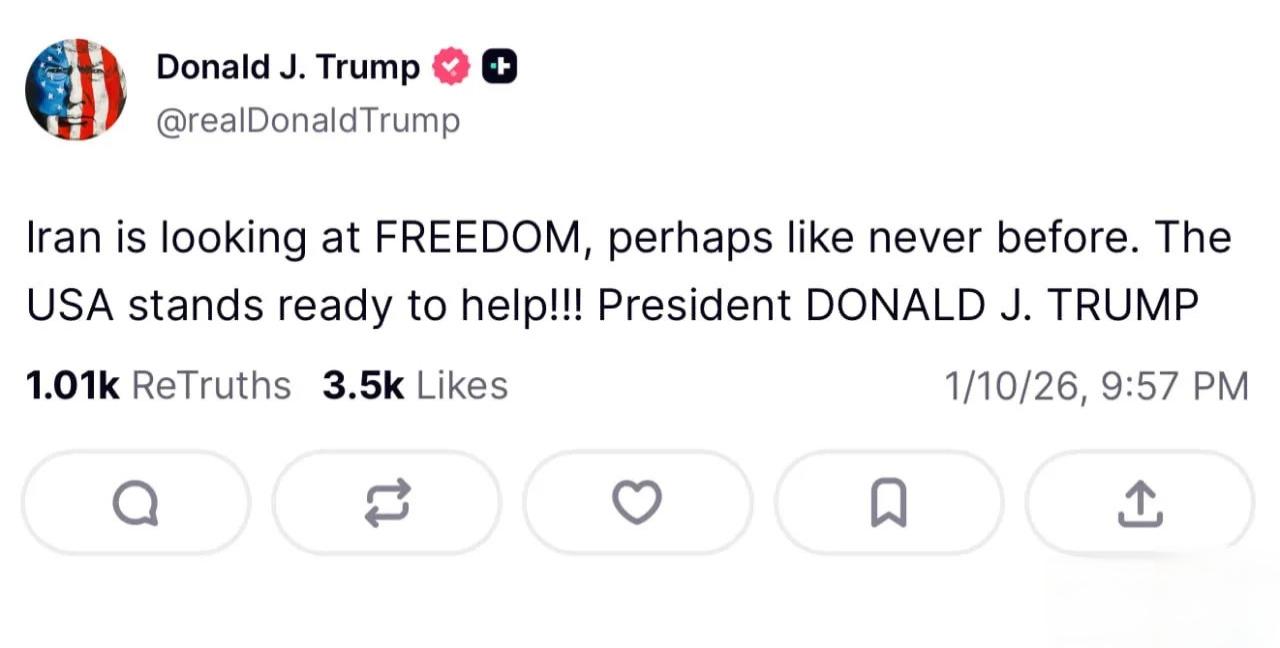 伊朗革命能否成功,现在关键看美以的军事力量能否制约乃至摧毁伊朗政权的镇压力量。 人民要求变革的愿望十分强烈,但政权镇压自由运动的措施也愈发严厉,听说死亡数字直线上升,这就需要美国和以色列出来兑现承诺,为赤手空拳的抗议者提供保护和支持。 伊朗政权用高官厚禄养(收买)了几十万军警为他们看家护院(效忠),再加上外籍军团(盟友的军事力量),保皇力量不容小觑,手无寸铁的民众与装备优良的他们对抗,力量是不对等的,这就迫切需要美以出动军事力量来平衡,否则AK一扫射,后果不堪设想。 特朗普在社交平台上又贴出两文,复宣这次美国绝不当看客的誓言。