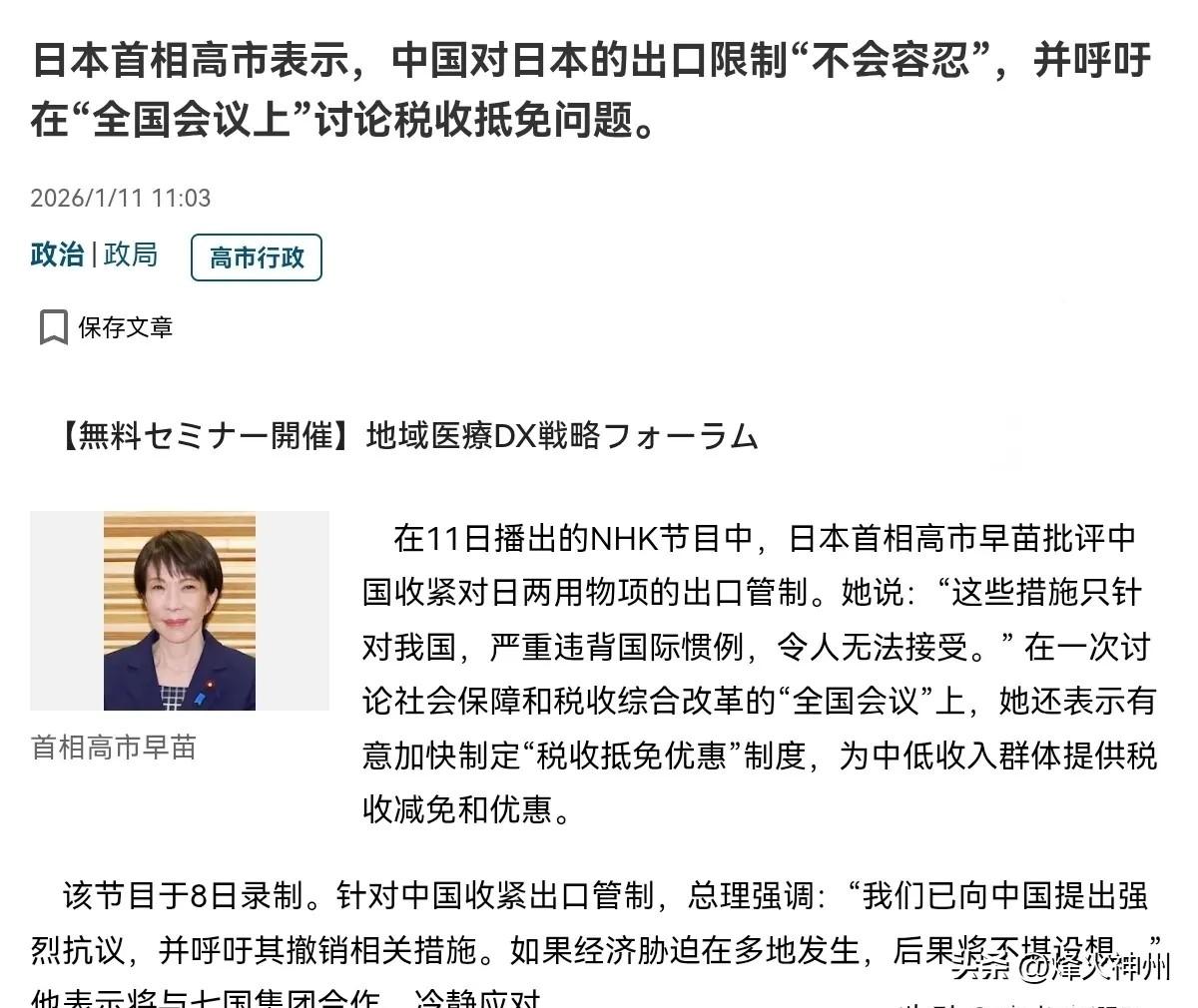 1月11日,高市早苗表示,这些措施只针对我国,“严重”违背国际惯例,令人无法接受