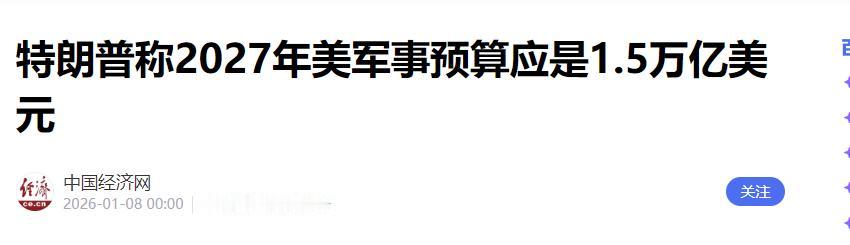 美国改口了 当地时间1月7日,特朗普公开发文表示:经过与参议员、众议员、部长和其他政治代表进行谈判。 他决定,为了国家的利益,尤其是在当前这个动荡不安、危机四伏的时期,2027年美国军事预算不应该是1万亿美元,而是1.5万亿美元。   这个数字一出来,市场立刻给出了最直接的反应。之前被热捧的科技股,尤其是英伟达这类公司,股价掉头向下。反倒是那些军工企业的股票,像是打了兴奋剂一样,全线飘红。   要知道,就在几个月前,华尔街的明星还是英伟达,大家聊的都是人工智能会怎么改变世界。但现在风向全变了。   国家的聚光灯,明显从代表未来的算力芯片,移到了服务于冲突的导弹芯片上。   钱的走向,就是最好的证明。大笔资金正从那些估值已经很高的科技公司里撤出,涌向了订单拿到手软的军工承包商。   可问题是,钱到位了,生产线能跟上吗?特别是在高超音速武器这种最前沿的领域,美国的工业短板暴露得很清楚。风洞不够用,新材料跟不上,供应链的每个环节都很脆弱。   就说一个细节,高超音速武器的耐高温外壳。它需要一种特殊的陶瓷材料,而生产这种陶瓷,离不开铪和锆两种金属元素。   尴尬的是,美国本土几乎不产这两种东西,超过九成都得从国外买。结果就是,过去三年,这两种关键材料的国际市场价涨了四倍。   这么一大笔钱砸下去,必然会加重政府的债务,长期利率也可能跟着走高。也正是在这个时候,特朗普放出风声,说他心里已经有了下一任美联储主席的人选。   市场马上就明白了,他想找一个听话的美联储主席,一个能用行政手段把利率压下去的人,好为天价军费买单。   短期看,这能省下不少利息钱。但长期呢?这是在拿美元的信用做赌注,搞不好会引发更严重的通货膨胀。   你看,黄金和原油的价格已经开始上涨,聪明钱已经嗅到了风险的味道,提前布局了。   为了钱,也为了战略位置,白宫的眼光甚至又一次瞄向了格陵兰岛。这个大岛上不仅有美国急需的稀土,更关键的是它的地理位置。   它卡住了从北美进出北极的咽喉要道,是盯着俄罗斯北方舰队的绝佳哨所。拿下了格陵兰,美国在北极的防线就几乎完美了。   虽然丹麦早就明确说过“不卖”,但有消息说,美国在考虑别的办法,比如私下里支持格陵兰搞独立。这一步要是真走了,不光是跟丹麦撕破脸,整个欧洲盟友体系都可能出现裂痕。   一个很有意思的现象是,就在美国资金疯狂涌入军工股的时候,追踪中概股的纳斯达克金龙中国指数,却反常地涨了。   这背后,是一些全球投资者的选择。他们似乎在用真金白银投票,在一个越来越不确定的世界里,一个专心搞经济、维护现有国际秩序的地方,或许更让人安心。   连高盛这样的华尔街大行,最近也在报告里建议增持中国资产。这说明,全球的资本正在寻找新的避风港,重新平衡自己的布局。   这1.5万亿美元,不仅仅是一串数字。它正在改写美国的国家方向,也必将搅动整个世界的未来。   信息来源:《特朗普称2027年美军事预算应是1.5万亿美元》,中国经济网,2026年1月8日。