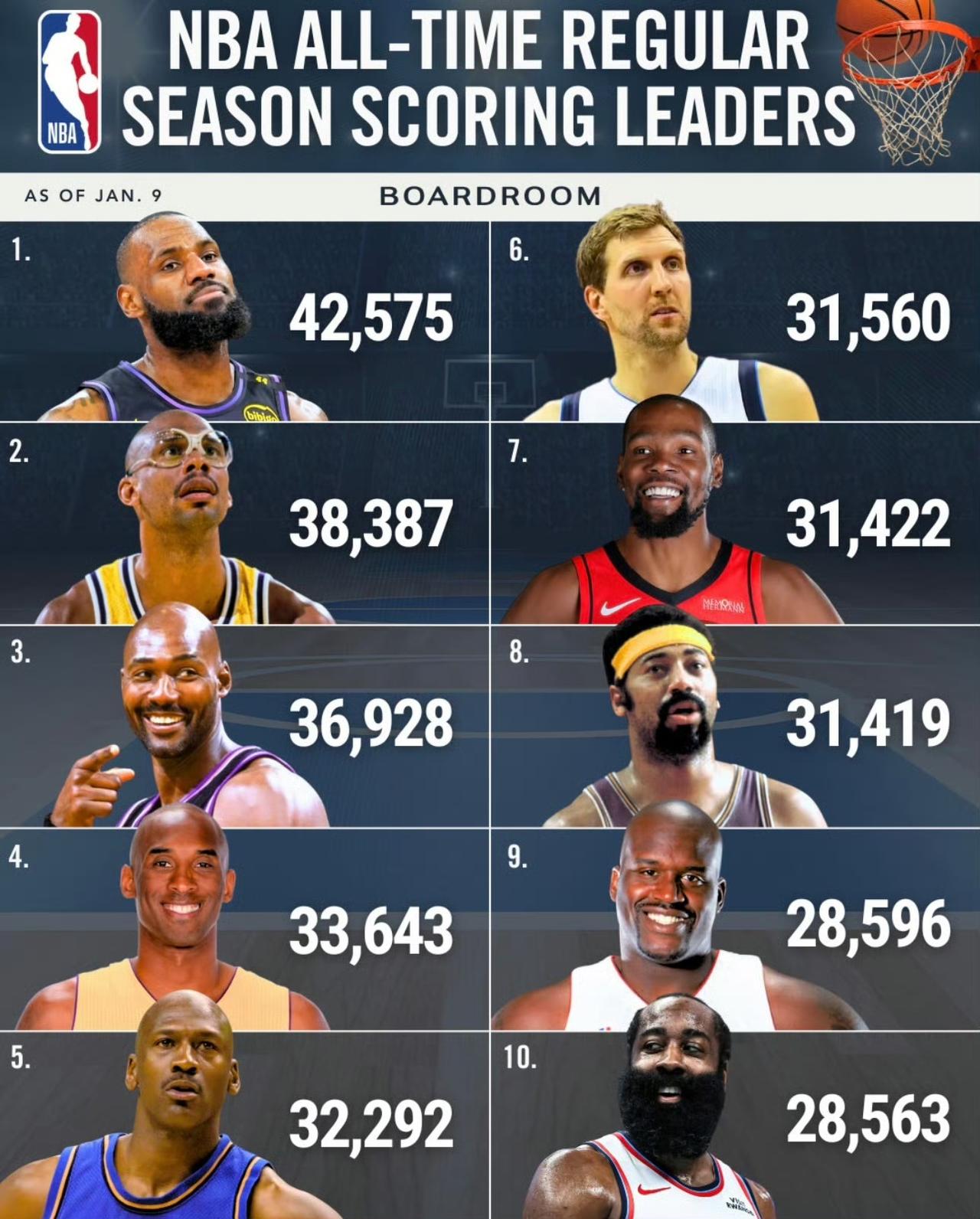 得分榜风云!死神登顶,胡子逼近,老詹还在刷! 兄弟们,NBA历史得分榜今天直接上演“三国杀”!杜兰特刚用一记标志性干拔,正式超越上古神兽张伯伦,杀到历史第7;哈登在快船背靠背赢球后,距离“大鲨鱼”奥尼尔仅差一场球的分数,剑指历史第9;而山顶上的詹姆斯,每次得分都在把“历史第一”的纪录往更离谱的数字上推。这哪是排行榜,分明是神仙打架的现场直播!