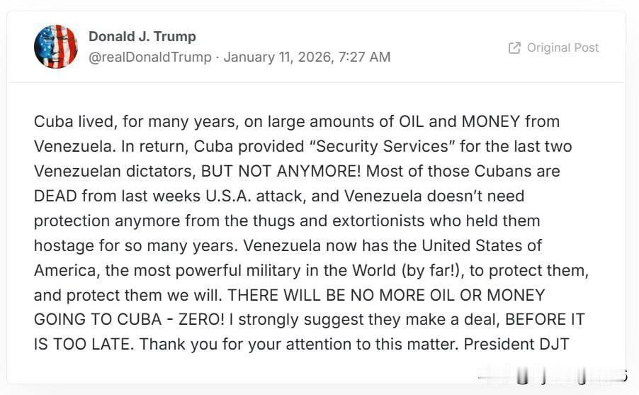 🇺🇸🇨🇺特朗普要求古巴与美国达成协议,“以免为时过晚”。 “多年来,古巴一直依靠委内瑞拉源源不断的石油和资金生活。作为交换,古巴曾向委内瑞拉前两任独裁者提供‘安全服务’,但现在不会了!上周美国发动的袭击中,大多数古巴人丧生,委内瑞拉也不再需要保护,免受那些多年来挟持它的暴徒和敲诈勒索者的侵害。委内瑞拉现在有美国——世界上(遥遥领先!)最强大的军队——来保护它,我们将继续保护它。古巴一分钱也别想再得到石油和资金!我强烈敦促他们趁现在还来得及达成协议。”特朗普写道。