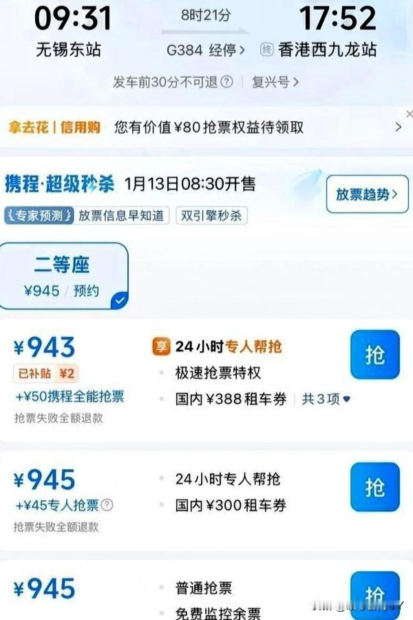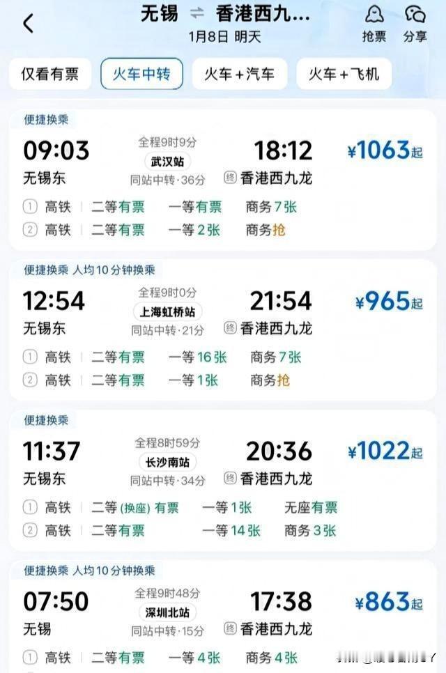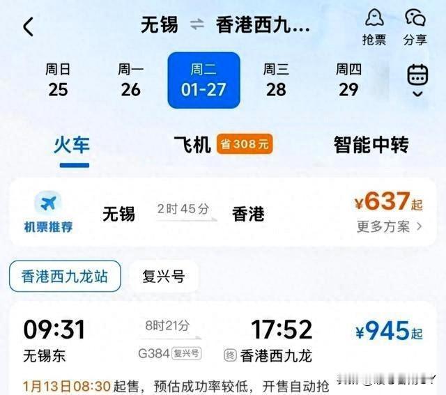 无锡东直达香港高铁1月27日开通,8小时直达无需换乘! 好消息!1月27日,无锡东直达香港西九龙高铁将正式开行,无锡人往返香港终于摆脱了换乘的困扰,既省心又高效。 全程仅需8小时21分钟,二等座票价为945元,凭借“一地两检”的便利模式直达目的地,不管是探亲访友、还是商务出行,都非常便捷,周末还能往返香港购物、看展,轻松开启双城生活。 车票1月13日8:30开售,目前已开放预约。此消息来源于江南晚报,具体情况以铁路官方公告为准。 这条直达线圆了众多无锡人便捷赴港的心愿,无需再折腾中转,节省了大量的时间精力,无疑是暖心便民的好消息。备好证件,就能开启轻松赴港之旅…… 香港 香港西九龙高铁