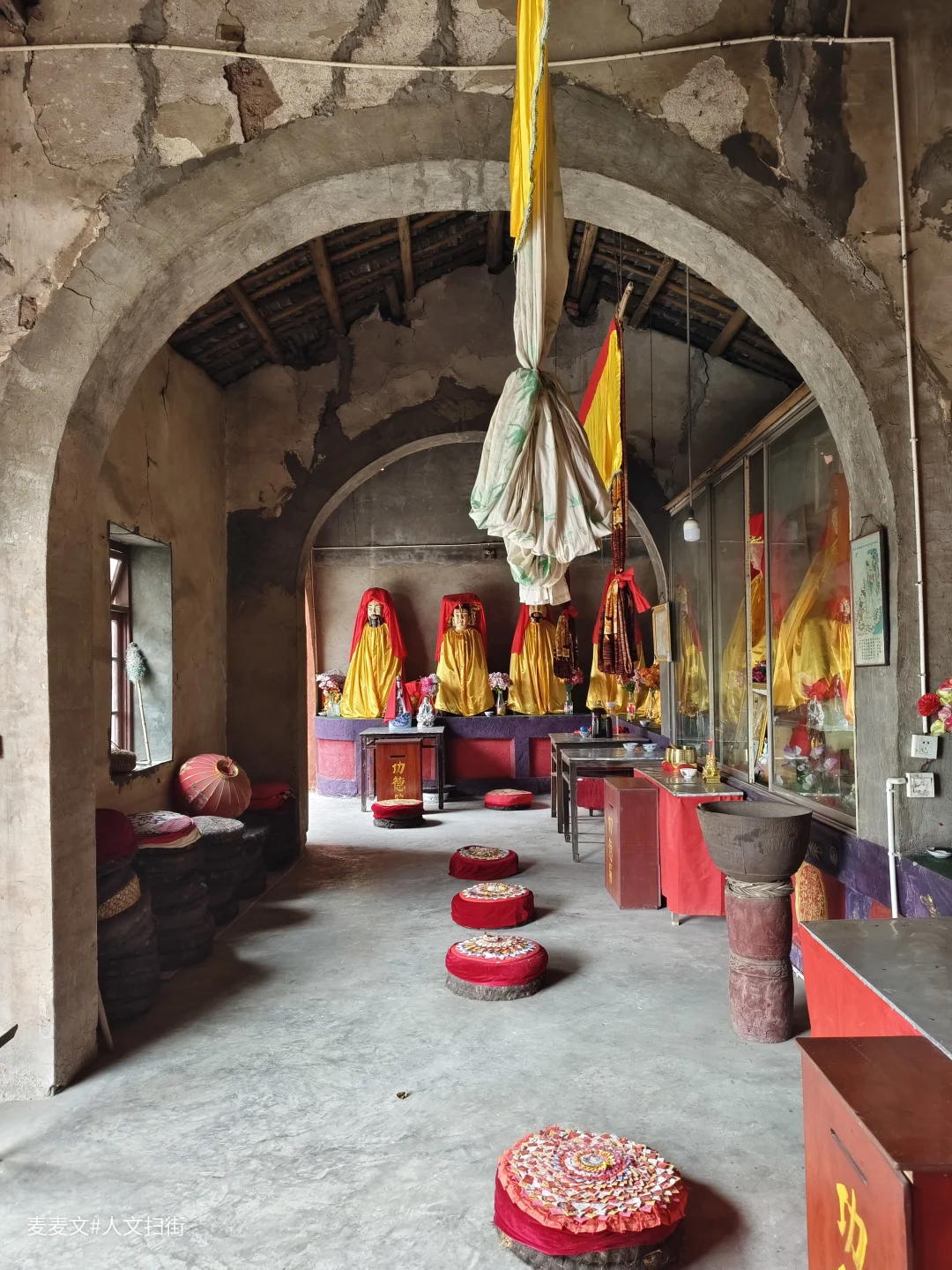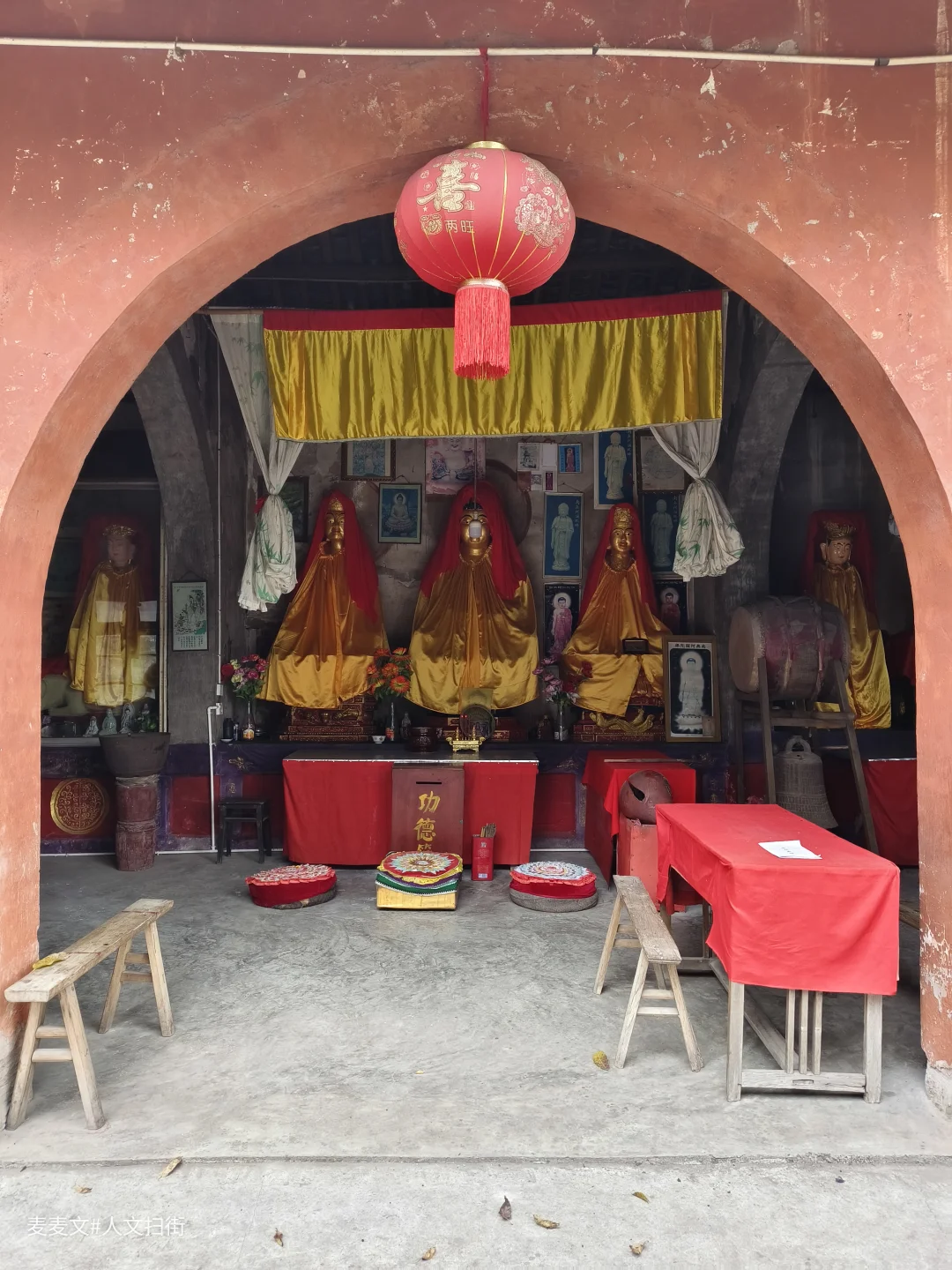 阁内的布局简单而规整,一侧整齐地摆放着一排圆凳,供前来参拜的人们稍作休息。地面略显粗糙,却也给人一种质朴的感觉。透过阁内的窗户向外望去,外面的景色隐约可见,仿佛是尘世与这一方清净之地的微妙连接。