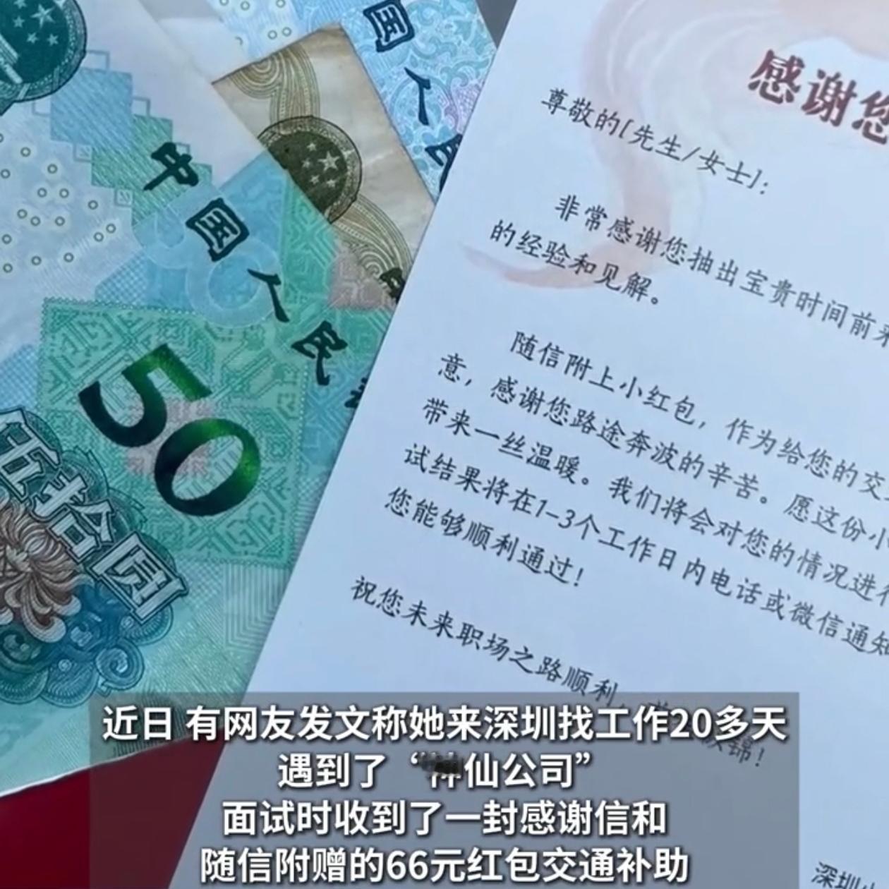 深圳有一位女士刚完成面试正要离开的时候,突然被人事叫住了,她心里咯噔了一下,以为自己会被刁难,结果人事递过来一个红包,女子反复问,“这是给我的吗?”拆分来看就是66元,并且还有一封感谢信。 姑娘在深圳找了一份工作,投了很多简历,这家企业通知她去面试,她早早地到了,该说的话都说了,该问的也都问完了,整个过程还算顺利,她心想差不多了,起身准备离开。 刚走到门口的时候,就被人事叫住了,说“等一下”。她的脚步停了下来,脑海中闪过了许多念头:刚才说的那句话是不是说错了?简历有什么问题吗?她转身,表情有些僵硬,做好了被质问的准备。 人事笑着走过来,手上拿着一个小红包,递给她。姑娘愣住了,眨了眨眼睛,指着自己说,“给我?”人事点点头,示意她把文件打开让其看。 红包里面有66块钱,还有一张小卡片,上面写的是感谢她抽出时间面试,祝她求职顺利。姑娘看到卡片上的字的时候,一时不知道该说什么,这是她第一次遇到这种情况。 人事解释道,公司里有一个不成文的规定,不管最后是否录用,每个来面试的人都会收到一个红包,66是个吉利的数字,图个好彩头。这个月已经发了十几份,来的人都是有的。 这几句话没有大的道理,但是姑娘心里觉得暖洋洋的。紧张的情绪已经烟消云散,取而代之的是一种说不出的感觉,就像被重视了一次一样。 后来她真的入职了该家公司,并把这件事发到了网上,在评论区一下子就热闹起来了。有人说这是求职界的一股清风,也有人头一次听说面试还能收红包,大部分人都在询问:这家公司还会招人吗? 找工作这件事,大家都知道不容易,投简历、等通知、跑面试,有时候连个回复都没有。能够遇到一家认真对待每一个求职者的公司,哪怕只是一小红包或者一句感谢,都会让人记忆深刻很久。