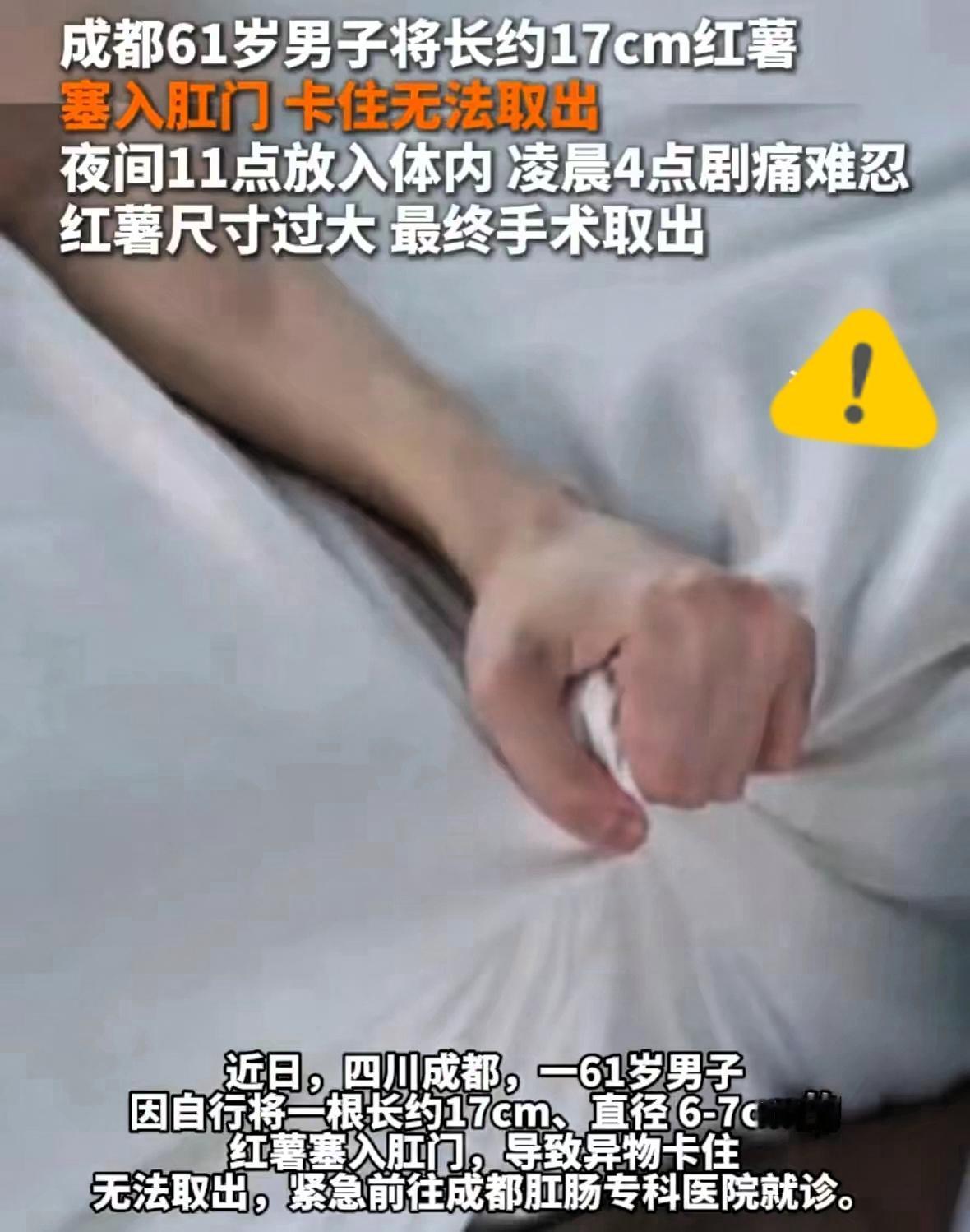真是活久见了,成都61岁男子将长约17cm红薯塞入肛门,导致卡住无法取出,只能手术,这下子可是受大罪啦! 17厘米的红薯,塞进身体不该进的地方,61岁大爷深夜操作时有多糊涂,凌晨四点的剧痛就有多惨烈。 从自行尝试到被迫就医,五个小时的煎熬里,他大概没料到,这根寻常的食材,会让自己挨上一刀。 肛门直肠本就是“出”的通道,上松下紧的结构天生不适合往里塞异物,更别说这么大尺寸的硬物。医生说肠壁薄得像保鲜膜,稍不注意就会穿孔感染,可总有人抱着“试试无妨”的心态冒险。 比起离奇的行为,更该警惕的是健康盲区和侥幸心理。很多人觉得这类意外离自己很远,却忘了身体的底线碰不得,一时的好奇或不当尝试,可能要付出手术甚至危及生命的代价。 羞于启齿的隐瞒只会耽误救治,盲目自行处理更是雪上加霜。 身体不是试验场,任何超出常识的操作都藏着风险。肠道取异物