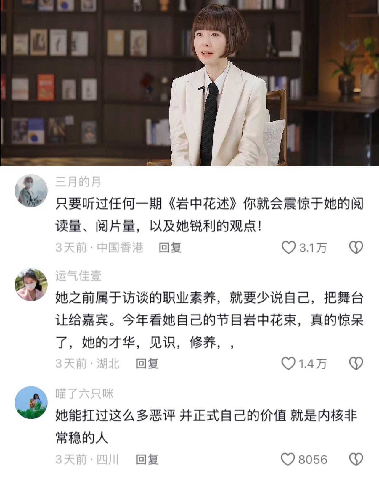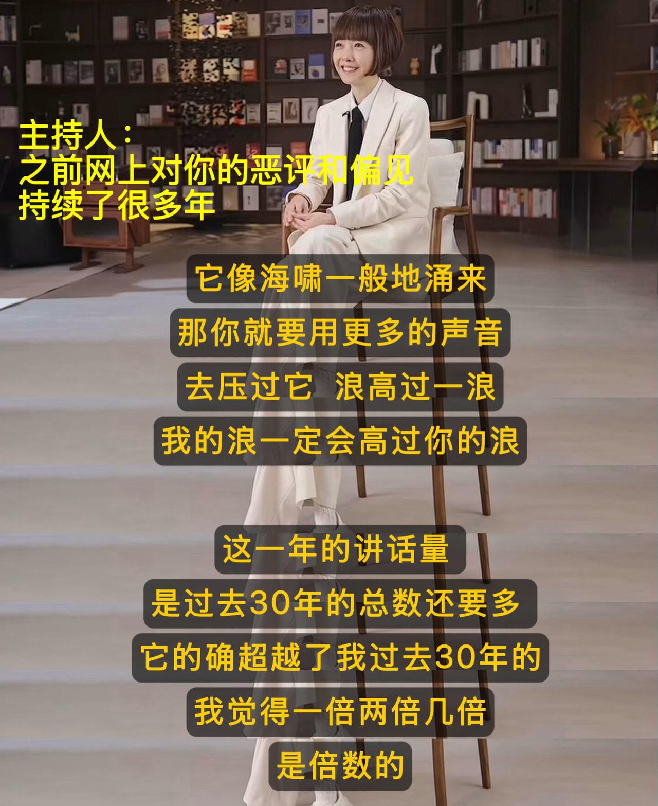 鲁豫女士,这一次时代终于追上了你。 以前搜鲁豫,满屏都是“冷场高手”“尬聊女王”的玩梗,“真的吗我不信”被反复调侃,一句善意提问被曲解成“何不食肉糜”,身材与造型被无端苛责多年。 直到看完新年专访《时间的答案》,我才恍然:55岁的鲁豫,用三十年如一日的专业与真诚,完成了一场安静而漂亮的口碑逆转。时代的视线,终于对焦在她始终如一的内核上❗ 上一次因她感动是12月成都新书《岩中花述》4册套装签售会,她拥抱了近千位粉丝,听每个女孩哭诉心事,温柔安慰落泪的陌生人。 有人把难言的遭遇写在手机上递给她,她笃定直言:“如果最坏的事发生,记住这不是你的错” 这份深刻的共情,源于她内心的确信。她在采访中说道:“我是她们的姐妹,这种姐妹之间的情感,是由性别带来的一种深刻的联结。相同的遭遇与经历,能把两个陌生人迅速地拽在一起。” 当被问及希望获得怎样的评价时,她只答了两个字:专业。 这背后是三十年的苦功,是刻进骨子里的认真与坚守。那句“为什么不吃肉,肉不好吃吗”提问,不过是她用无伤害的方式,让真相被看见的专业选择。 面对多年的网络热议与身材评头论足,深知带着强烈的性别偏见,她没有自怨自艾,也不正面互怼,而是用“我的浪盖过你的浪”反击:2025年的表达量,远超过去30年总和,用专业的作品、真诚的发声,覆盖所有杂音与偏见。 她说从前信“清者自清”,如今才懂要直面偏见,活久一点,坚持一点,留在场上,就是最好的回击。 55岁的鲁豫懂年轻人理想与现实的挣扎,坦言“大环境比当年更难”,温柔建议“先活下来,再慢慢靠近理想”;她反驳对“垃圾时间”的苛责,劝大家给生活喘息的机会;她深耕女性议题,想为更多女孩撑伞,让每个故事都成为底气与样本。 · 有人说“这个时代终于跟上了鲁豫”,她诚惶诚恐,却始终保持好奇、专业、真诚的内核。 她用半生证明了:活好自己,就是最小单位的女性主义。 温柔而坚定,共情且独立,腹有诗书,心有赤诚。 认真活着、专业做事、温柔发声。 谢谢鲁豫,让我们看见:不必成为谁,只需深耕自己。当你活得足够扎实、始终在场,世界终会走到你面前,听你说话‼️鲁豫 鲁豫访谈 主持人鲁豫 鲁豫状态