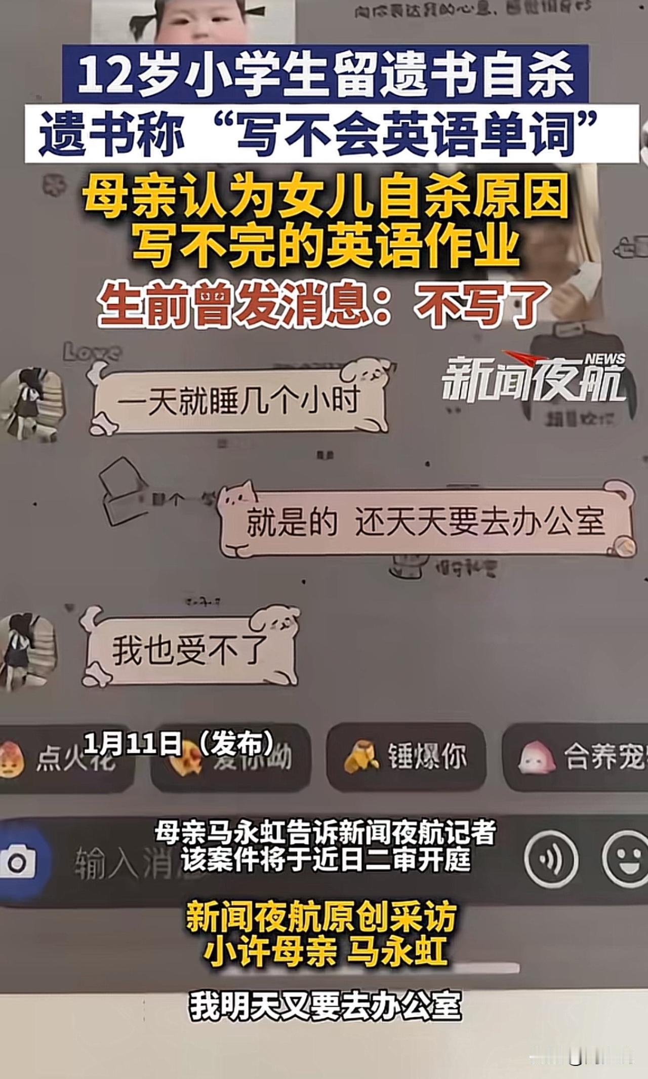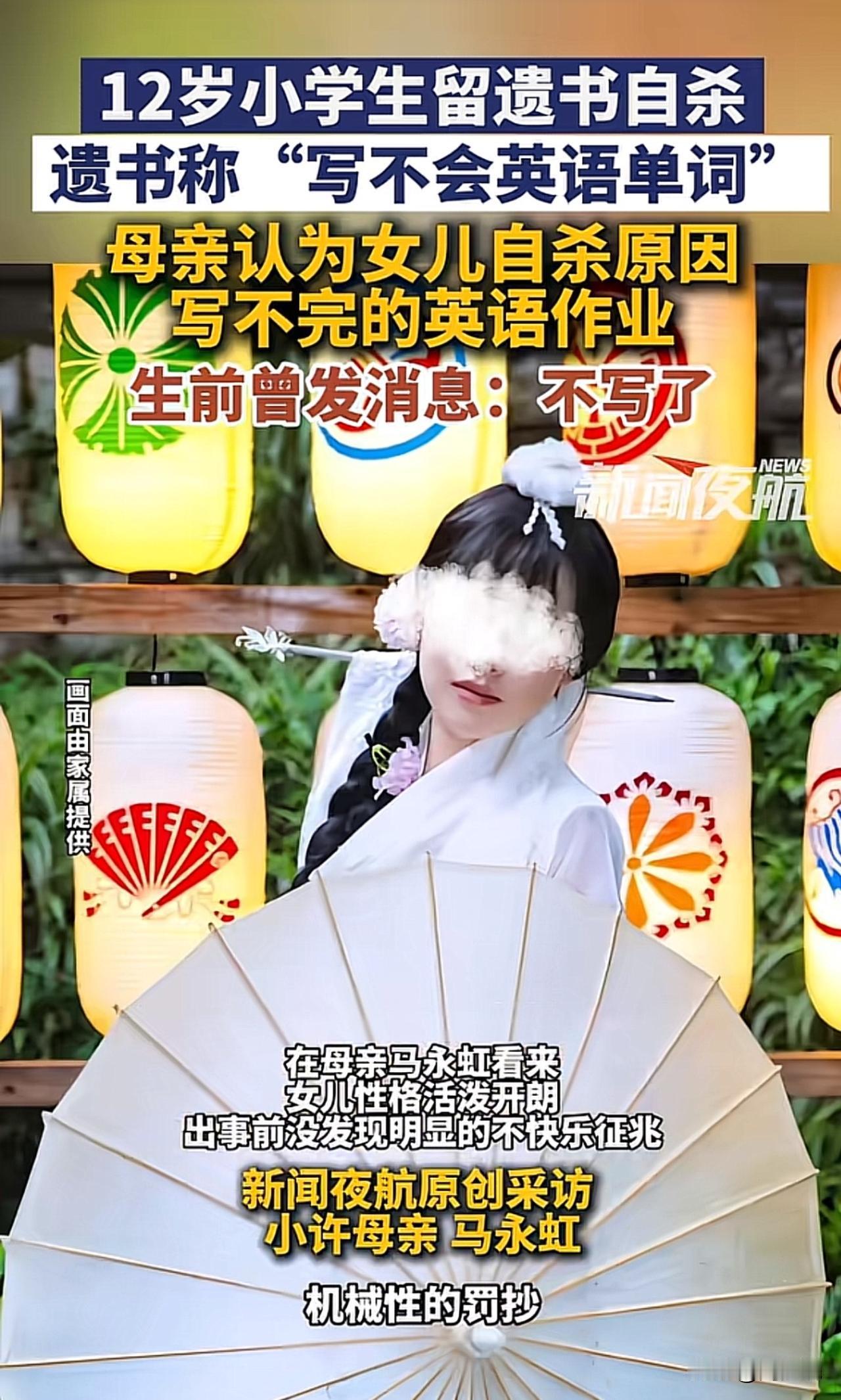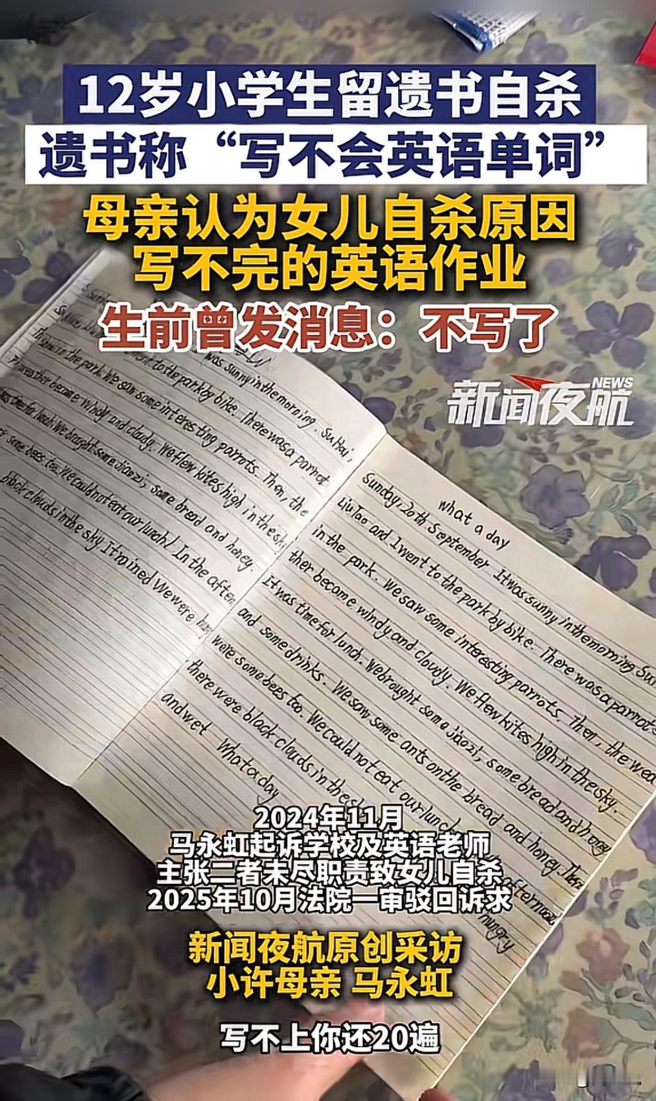 “真让人揪心!”一位12岁的小学生在家长服下姥姥的心脏病药自杀,药效很快,连抢球的时间都没有,遗书里只写了一句“不会英语单词”。事发后,英语老师满怀懊恼与委屈离职,始终不知如何自证清白。而女孩母亲则认为女儿自杀原因,是写不完的英语作业,为给女儿讨“说法”奔走一年,可一审法院驳回了她起诉学校和老师的全部诉求,如今案件即将进入二审。 此事曝光后,引发网友纷纷热议。不少网友表示:“一个单词就夺走一条命,孩子的抗挫力也太弱了”! 这起悲剧看得真让人揪心,远非“起诉追责”那么简单,核心暴露了青少年挫折教育的严重缺失。现在的孩子被学业压力和过高期待裹挟,从小缺乏“输得起”的教育,小小的学习困难就可能被放大成迈不过的坎。 这事也给所有学校提醒,学校不能只盯着成绩,家庭也不该忽视心理疏导,生命教育和抗挫力培养才是成长路上的“必修课”,更要教会孩子接纳不完美、直面困难。 除此之外,教育要回归“育人”本质,给孩子足够的心理支持和容错空间,才能避免类似悲剧重演。毕竟,比起满分试卷,健全的人格和珍惜生命的意识,才是孩子一生最宝贵的财富。#寻美三湘# #长沙新朋友#