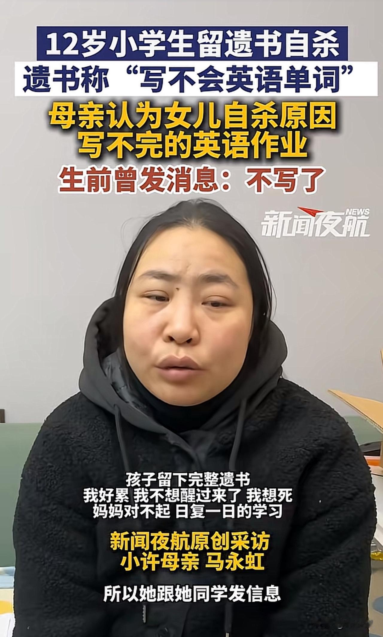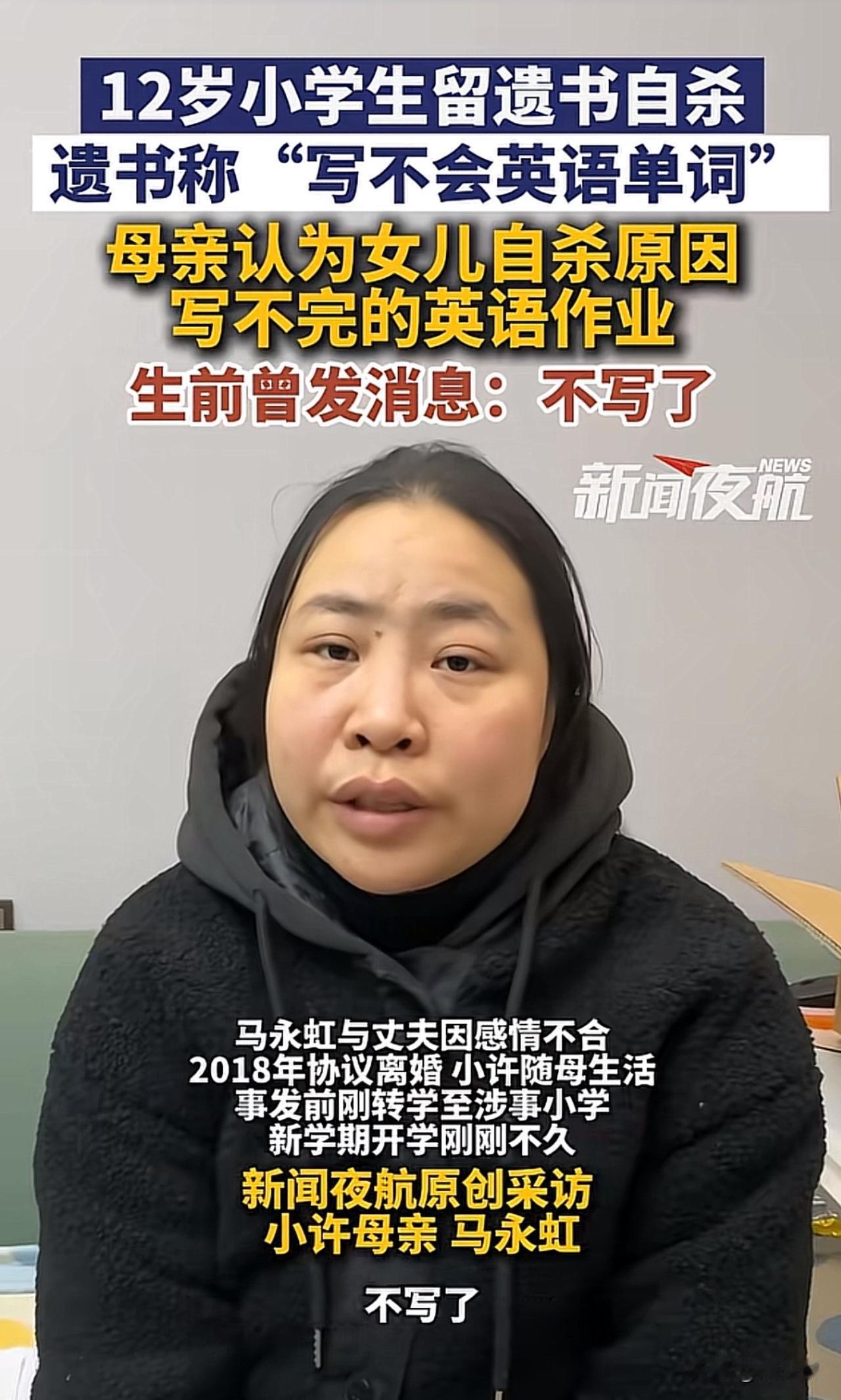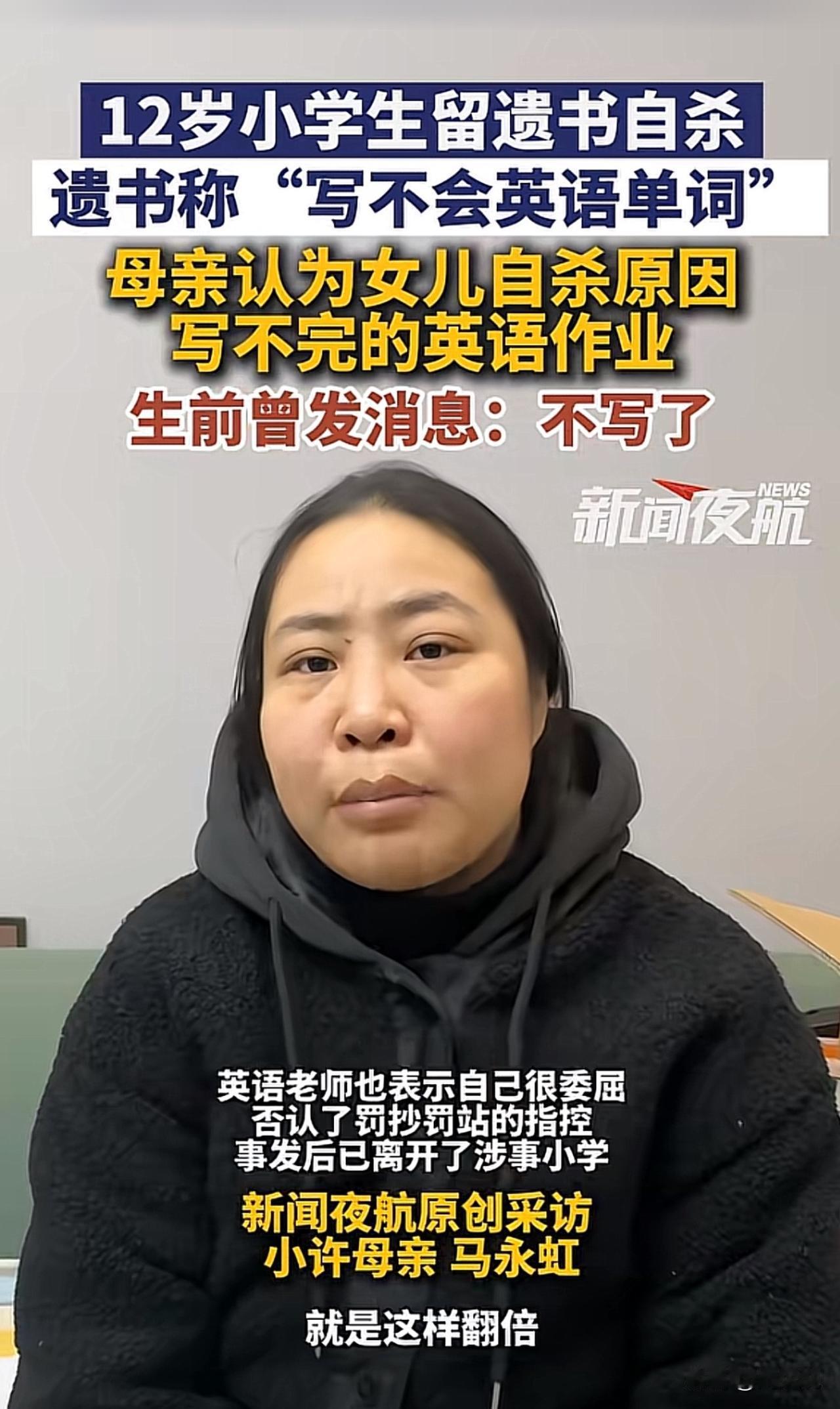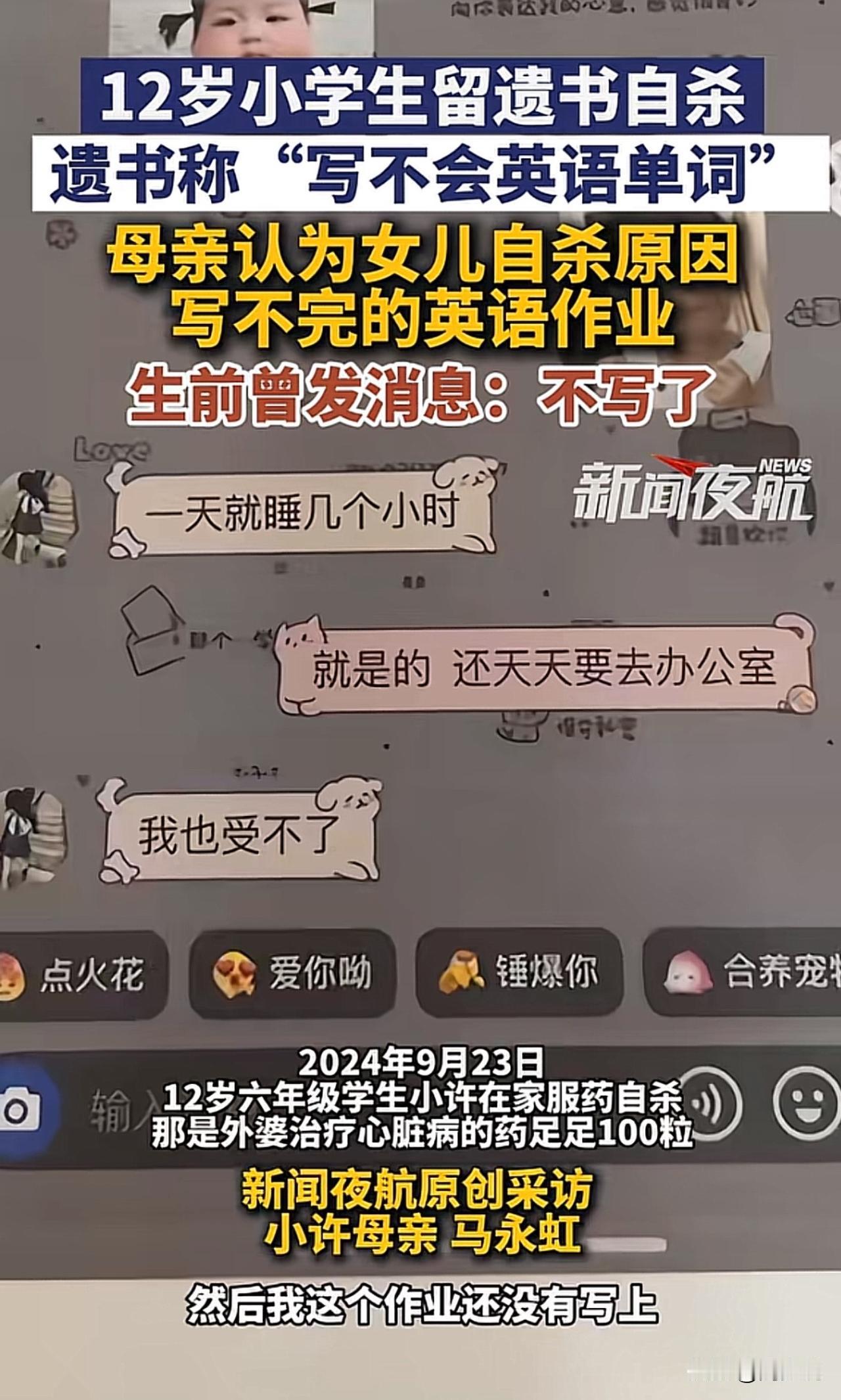 “真让人揪心!”一位12岁的小学生在家长服下姥姥的心脏病药自杀,药效很快,连抢球的时间都没有,遗书里只写了一句“不会英语单词”。事发后,英语老师满怀懊恼与委屈离职,始终不知如何自证清白。而女孩母亲则认为女儿自杀原因,是写不完的英语作业,为给女儿讨“说法”奔走一年,可一审法院驳回了她起诉学校和老师的全部诉求,如今案件即将进入二审。 此事曝光后,引发网友纷纷热议。不少网友表示:“一个单词就夺走一条命,孩子的抗挫力也太弱了”! 这起悲剧看得真让人揪心,远非“起诉追责”那么简单,核心暴露了青少年挫折教育的严重缺失。现在的孩子被学业压力和过高期待裹挟,从小缺乏“输得起”的教育,小小的学习困难就可能被放大成迈不过的坎。 这事也给所有学校提醒,学校不能只盯着成绩,家庭也不该忽视心理疏导,生命教育和抗挫力培养才是成长路上的“必修课”,更要教会孩子接纳不完美、直面困难。 除此之外,教育要回归“育人”本质,给孩子足够的心理支持和容错空间,才能避免类似悲剧重演。毕竟,比起满分试卷,健全的人格和珍惜生命的意识,才是孩子一生最宝贵的财富。#寻美三湘# #长沙新朋友#