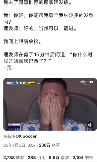 他想要c罗的发型,但是理发师以为说的是大罗,就剃成光头了