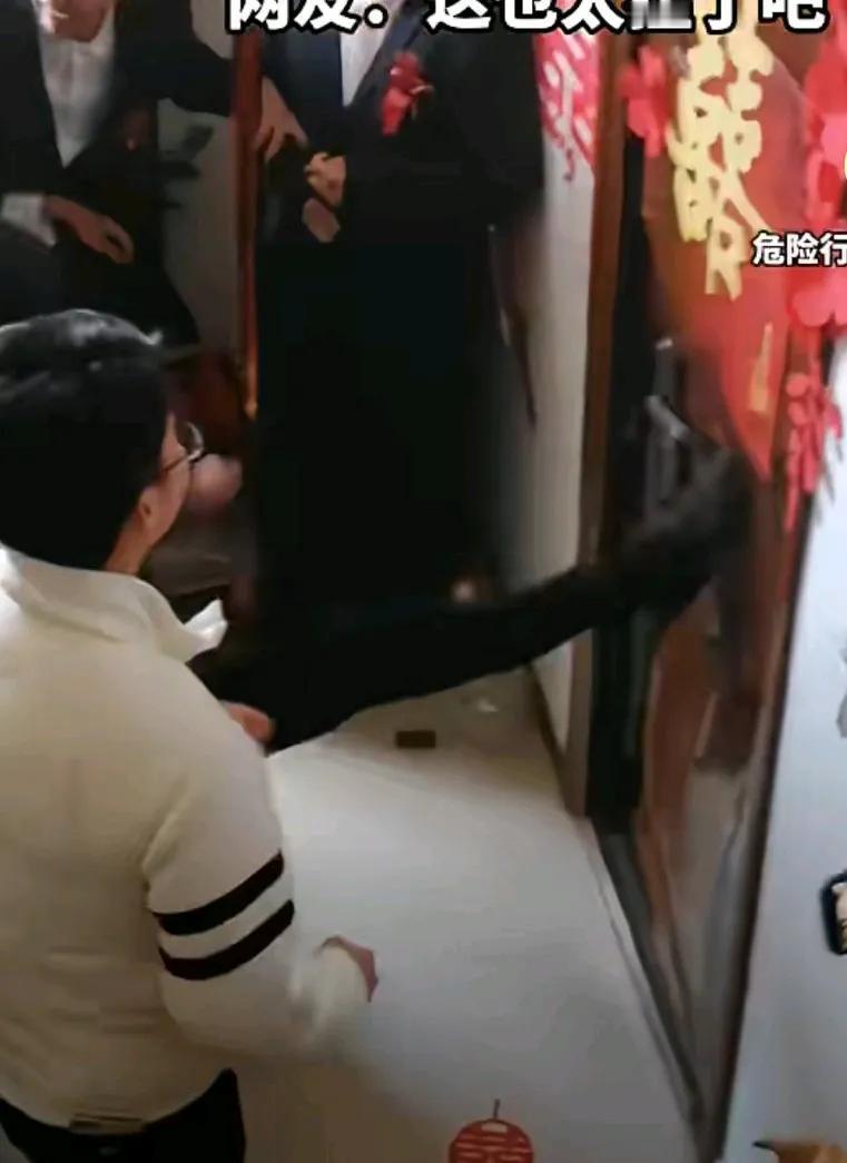 接亲现场太离谱,男方接亲人员竟然用脚把门踢烂,并且好多人一起撞门,把门踢了个大洞,众人把门撞开,一拥而进。 这样的接亲形式不可取, 现在哪还有这么暴力接亲的。网友说,这也太猛了吧, 这男方接亲人一点教养也没有。 这门都踹坏了, 到底谁赔偿呀, 有人说是不是红包给足了, 她们还不开门, 所以才被踹烂门。
