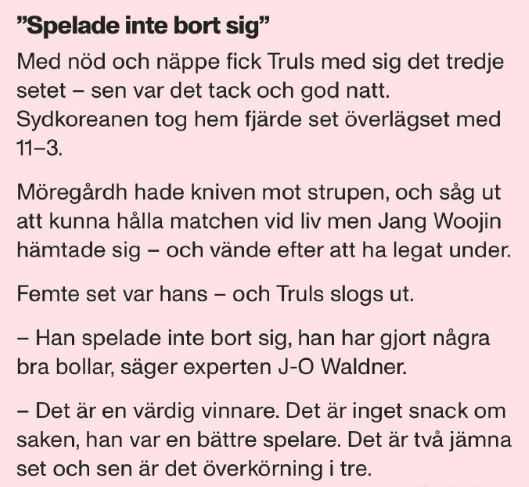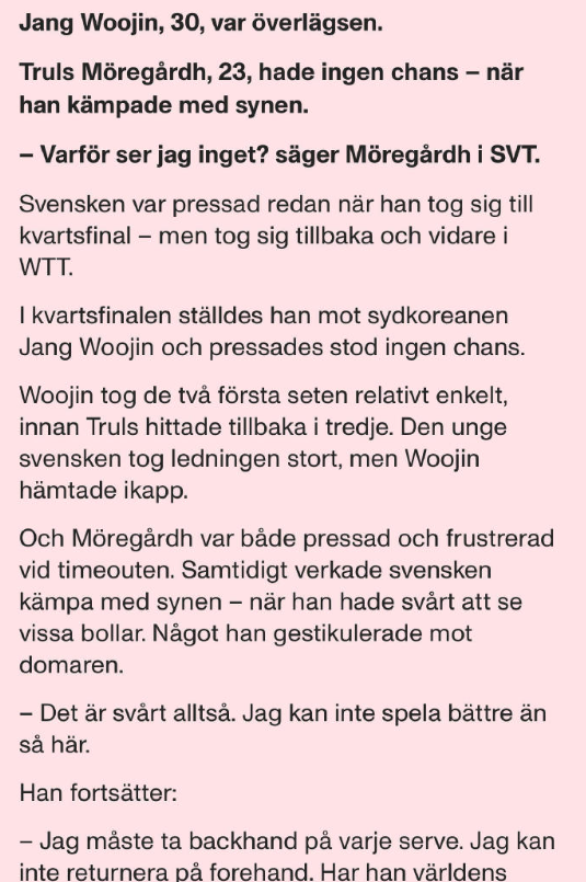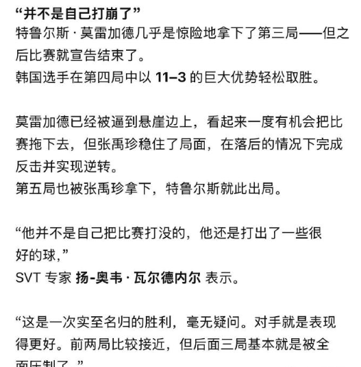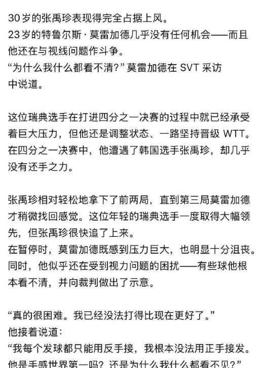 莫雷加德在不敌张禹珍的赛后采访中表示,比赛中受到视线干扰,称“我怎么看不清?”“为什么我什么都看不清?”,并提到因光线或对手发球遮挡导致难以看清球路。 他在对阵张禹珍的比赛中多次向裁判示意看不清来球,尤其在接发球时无法使用正手,只能依赖反手应对。