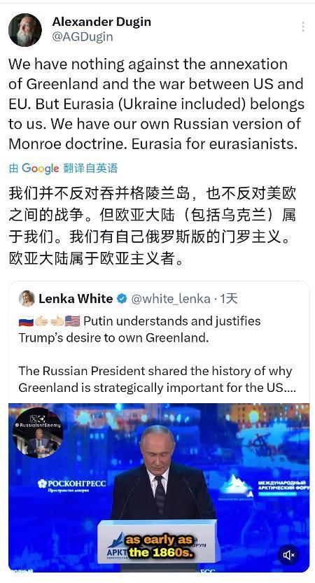 亚历山大·杜金今天(北京时间1月12日)写道:“我们并不反对吞并格陵兰岛,也不反对美欧之间的战争。但欧亚大陆(包括乌克兰)属于我们。我们有自己俄罗斯版的门罗主义。欧亚大陆属于欧亚主义者。” 【杜金还转发了俄罗斯总统普京的言论。普京理解并认可特朗普想要拥有格陵兰岛这一愿望。普京讲述了格陵兰岛对美国具有战略重要性的原因这一历史背景。】 普京特别提到美国对格陵兰的兴趣早在19世纪就已存在,从1860年代考虑吞并,到二战后杜鲁门政府提议用黄金和油田换取,这些历史脉络都说明美方的诉求绝非临时起意。 格陵兰岛的价值摆在明面上,冰层下藏着全球重要的未开采稀土,这些资源正是高科技和防务工业的刚需,而随着气候变暖,这里又成了北极航道的关键枢纽,图勒空军基地更让它成为北约北部防御的支点。 杜金转发普京言论后抛出的观点,其实是把这种博弈划出了清晰的势力范围边界。他说不反对吞并格陵兰岛,本质是默认北极和美洲区域属于美国主导的博弈场,这种态度和普京“此事与我们无关”的表态形成了微妙呼应。 但紧接着的转折才是核心,杜金强调欧亚大陆(包括乌克兰)属于他们,这话直接扎根在他的新欧亚主义理念里。作为这一思潮的代表人物,他始终认为俄罗斯必须整合周边国家,构建以自身为核心的欧亚联盟,才能对抗美国主导的大西洋体系。 所谓的“俄罗斯版门罗主义”,就是把美国当年“美洲是美洲人的美洲”的逻辑搬到了欧亚大陆。门罗主义原本是美国排斥欧洲干涉美洲事务的工具,现在杜金将其改造,主张欧亚大陆应由欧亚主义者主导,本质是想确立俄罗斯在这一区域的绝对影响力。 这种主张背后藏着明确的地缘对抗思路,杜金一直认定世界正处于多极与单极的较量中,俄罗斯作为陆权国家必须守住欧亚防线,才能避免被海权主导的西方压制。 需要明确的是,杜金的言论并不能直接等同于俄罗斯官方立场。他在俄国内并无任何官方职务,其理念在主流学界也始终处于边缘位置,所谓“普京的大脑”不过是西方舆论塑造的标签。 普京的回应更多是对美国战略意图的客观解读,他强调要通过加强军事能力维护北极利益,同时也不排斥合作,这种务实态度和杜金的激进表述有明显区别。 但不可否认的是,两人在维护俄罗斯地缘安全、重视欧亚区域整合的大方向上存在理念重叠,这也是外界容易将二者关联的原因。 杜金提到“不反对美欧之间的战争”,这种说法并非真的希望冲突爆发,而是暴露了他对西方阵营内部矛盾的判断。 当前美国通过强化对格陵兰的控制推动北极战略,已经引发丹麦等欧洲盟友的强烈不满,北约内部的信任裂痕正在扩大。杜金显然意识到这种矛盾的存在,他的表述本质是一种战略切割——将美欧矛盾与欧亚主导权问题剥离开,集中凸显俄罗斯对后者的核心诉求。 从现实来看,杜金的主张面临多重制约。欧亚大陆内部国家诉求多元,乌克兰危机已经证明武力整合的高昂代价,而俄罗斯的经济实力和国际影响力也难以支撑如此宏大的主导目标。 更关键的是,全球化背景下的地缘博弈早已不是简单的势力范围划分,资源、航道等议题的解决离不开多国协作,单靠“门罗主义”式的排他性主张根本行不通。 不过杜金的言论仍有解读价值,它折射出俄罗斯国内激进保守派的地缘焦虑。在西方持续制裁和北约东扩压力下,这类主张容易引发共鸣,但俄罗斯官方的实际政策始终保持着务实弹性。 普京在强调维护利益的同时,仍留有余地提及与西方的合作可能,这种平衡策略才是俄罗斯外交的真实底色。毕竟,无论是北极航道的开发还是资源利用,单打独斗的成本远比合作要高得多。