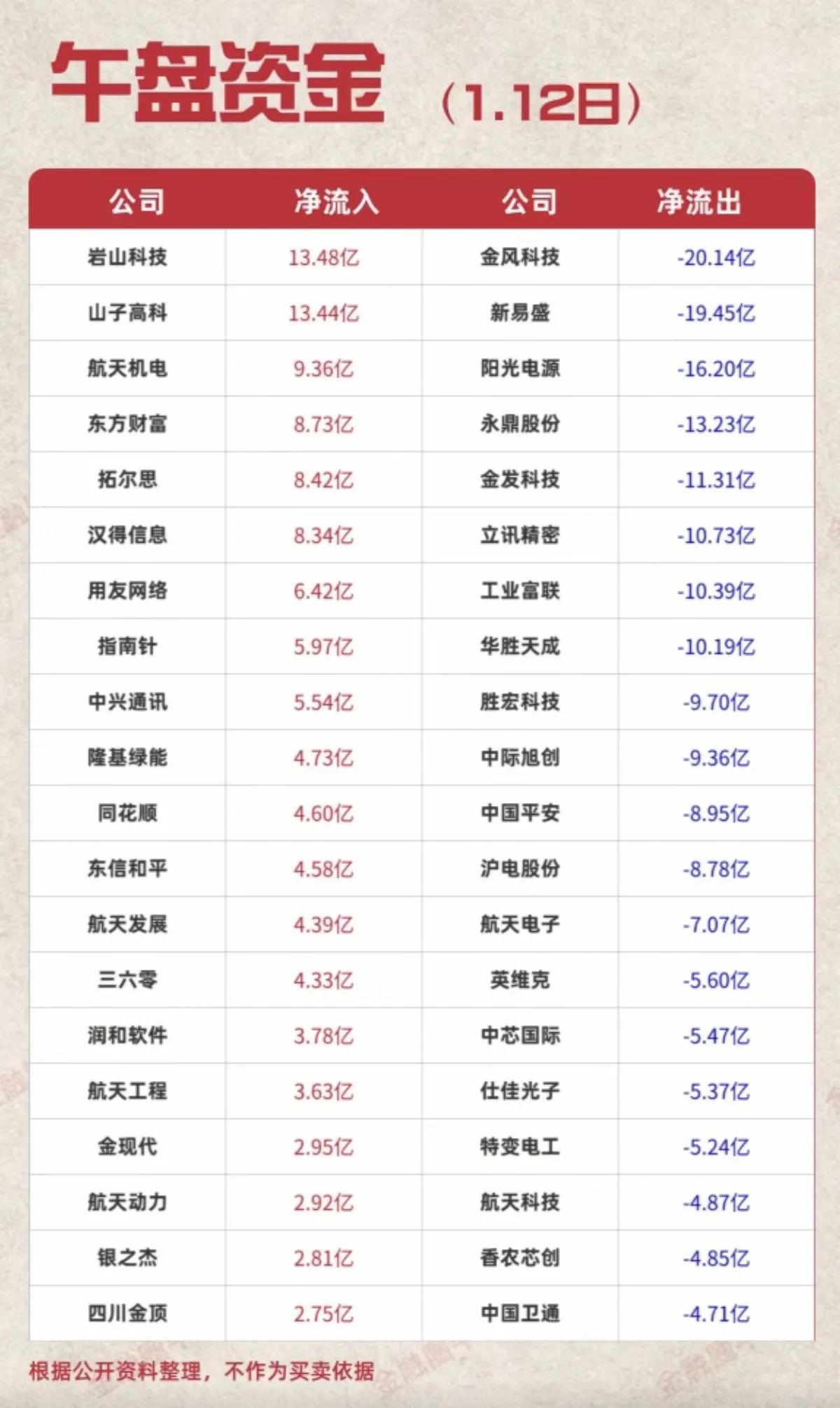 1月12日,周一A股午盘主力资金流入流出一览表!!! 岩山科技主力资金大幅流入13.48亿,后市值得高看一眼;山子高科主力资金大幅抢筹13.44亿,后市值得期待;金风科技主力资金大幅流出20.14亿,后市需小心谨慎操作!!!