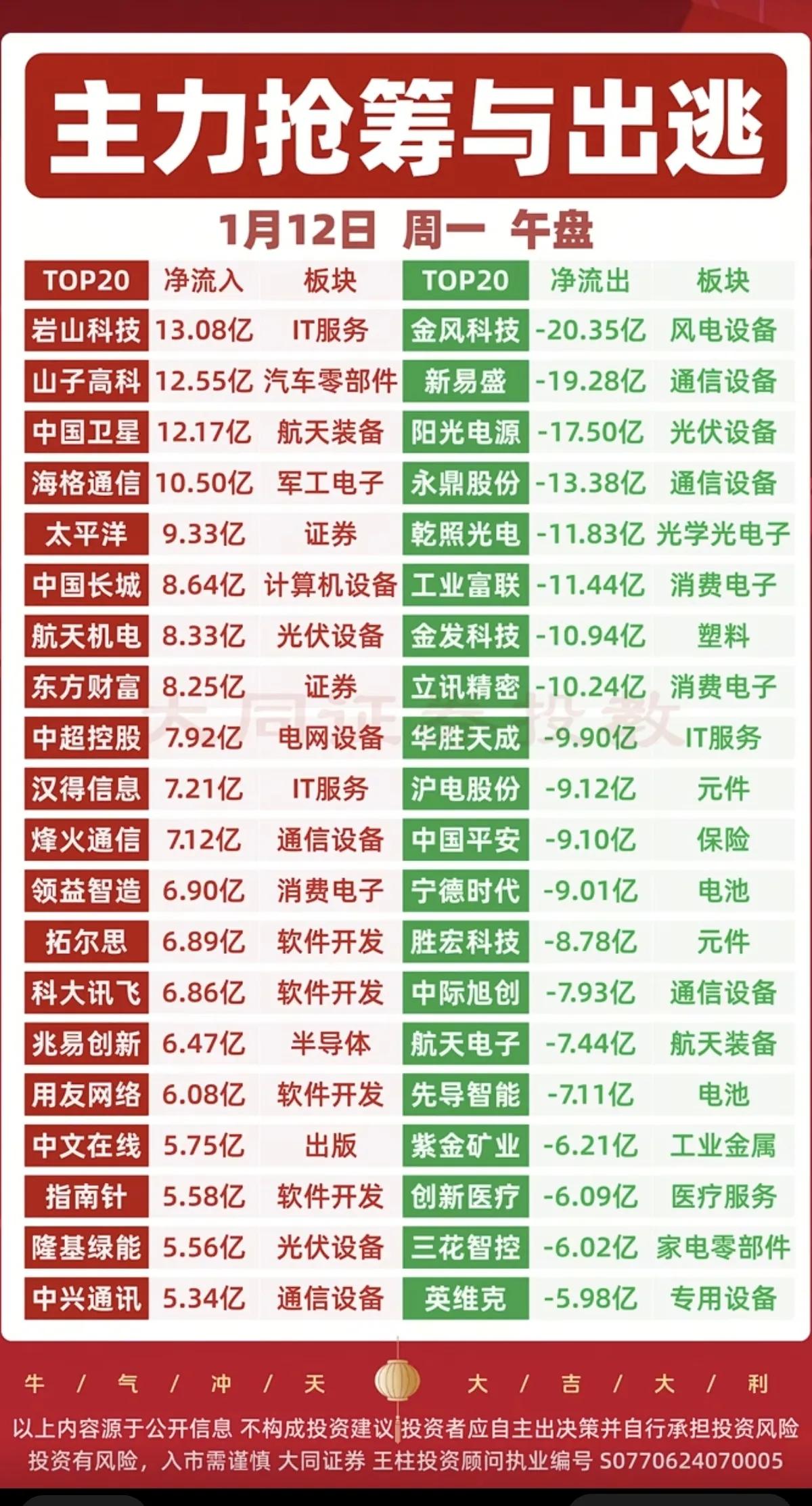 1月12日,周一A股午盘主力抢筹出逃一览表!!! 岩山科技主力资金大幅流入13.08亿,后市值得高看一眼;山子高科主力资金大幅流入超12亿,后市值得期待;金风科技主力资金大幅流出20亿,后市需小心谨慎操作!!!