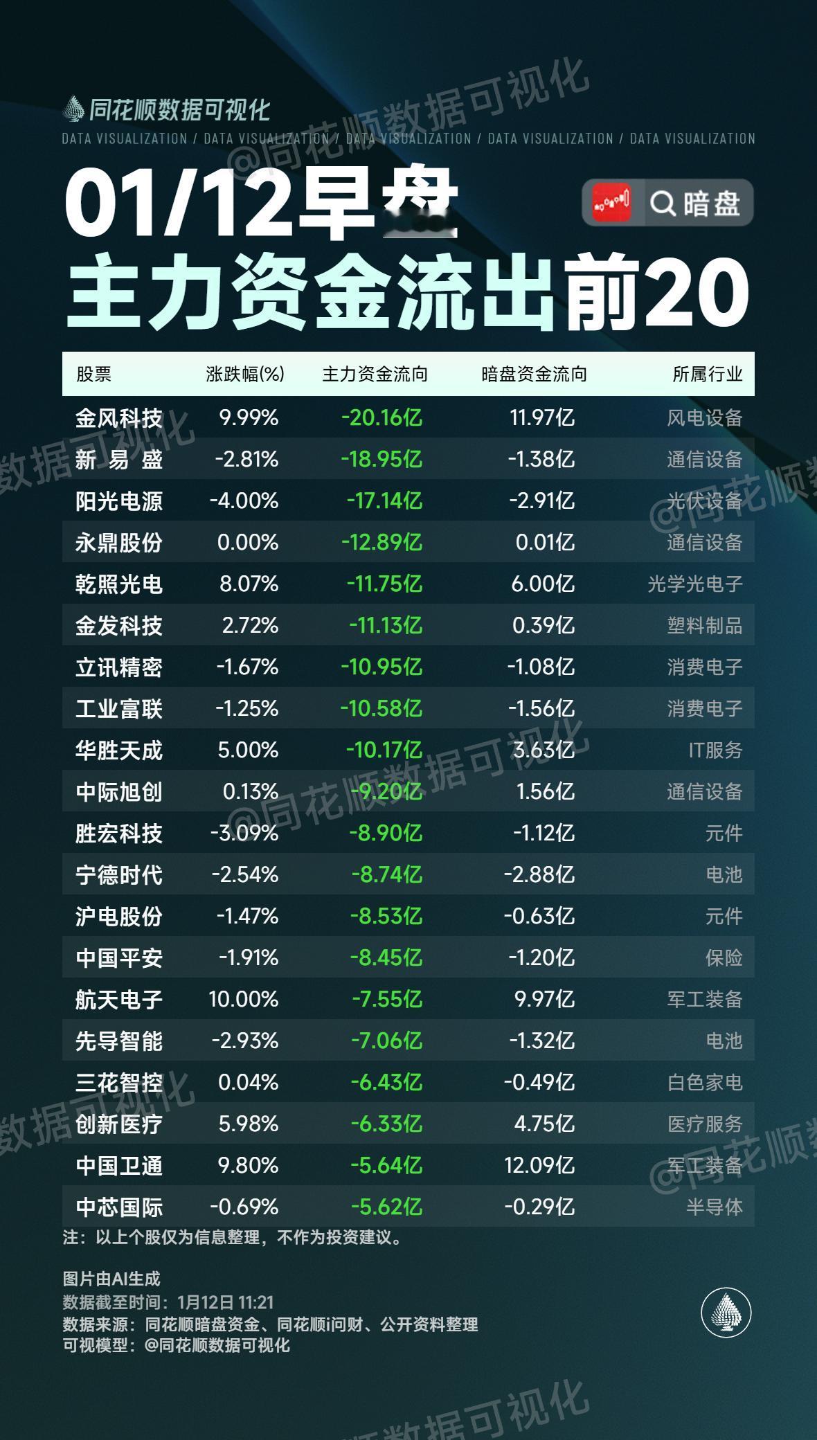 1月12日,周一A股早盘主力资金流入流出一览表!!! 山子高科主力资金流入13.36亿,暗盘主力大幅抢筹13.14亿,后市值得高看一眼;汉得信息主力资金流入6.82亿,暗盘主力资金大幅流入13.62亿,后市值得期待;金风科技主力资金大幅流出超20亿,暗盘资金却流入11.97亿,后市值得重点关注!!!