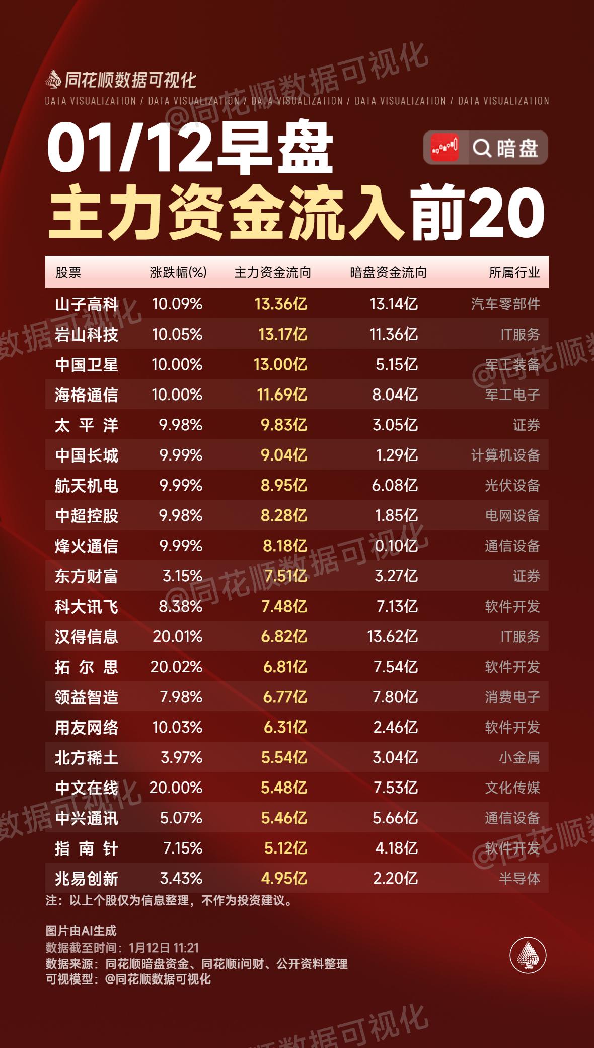 1月12日,周一A股早盘主力资金流入流出一览表!!! 山子高科主力资金流入13