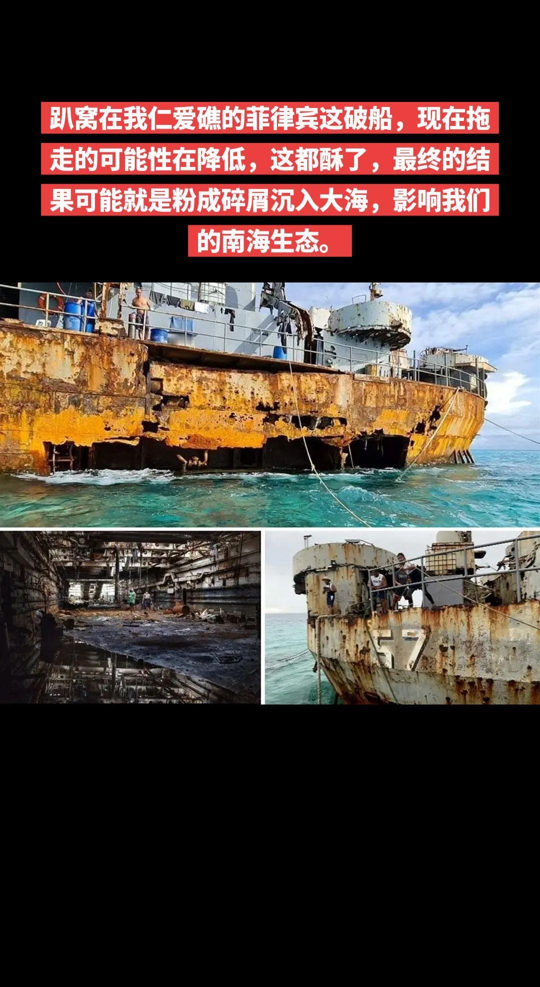 它走不了了,而是要沉下去~趴窝在我仁爱礁的菲律宾这破船,现在拖走的可能性在降低,这都酥了,最终的结果可能就是粉成碎屑沉入大海,影响我们的南海生态。