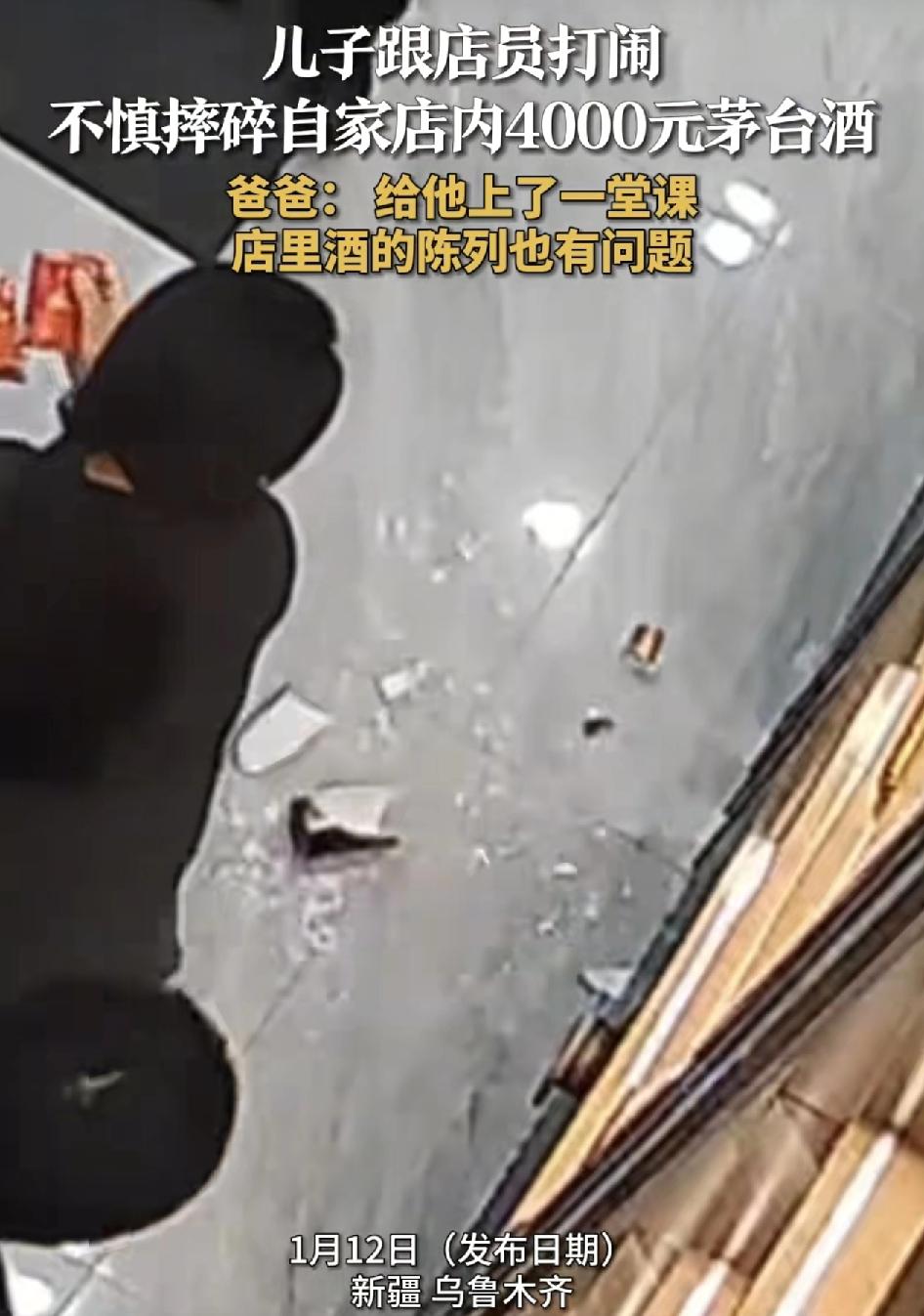 新疆乌鲁木齐一位店老板说,儿子跟店员在打闹,儿子在跑的过程中不慎打翻了通道旁边的一瓶价值4000元的茅台酒,自己已经狠狠的给儿子上了一课,但是自己店里面茅台酒的陈列方式也有问题,网友们说,幸亏是自家孩子打烂了,如果是顾客这样打烂了,到底需不需要赔偿?所以茅台酒陈列的方式,确实是要谨慎。