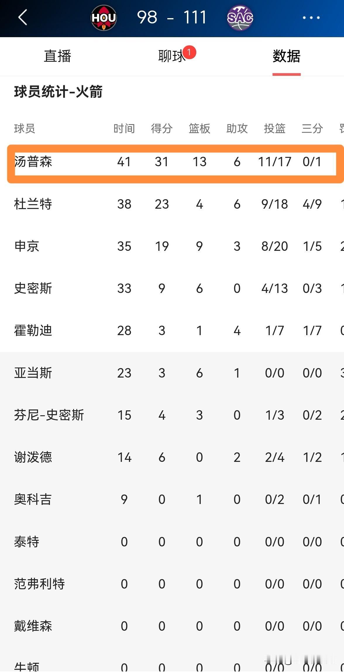 火箭球星阿门-汤普森的天赋真是被白白地浪费了!在今天火箭客场以98:111不敌国王的比赛中,阿门首发出战41分钟,投篮17中11,其中三分球1中0、罚球12中9空砍31分13篮板6助攻,他的场上正负值为-13。 在我看来,如果火箭不继续升级球队的阵容,那么火箭就是在浪费阿门的天赋,因为以火箭目前的阵容配置来看,火箭毫无夺冠可能性。